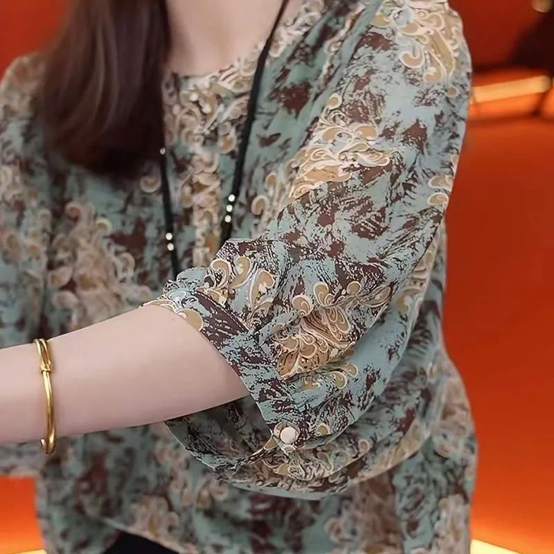 여름 여성을 위한 루즈하고 슬림한 7부 소매 스타일 쉬폰 셔츠 새로운 디자인 패셔너블한 프렌치 스타일 꽃무늬 라운드 넥 탑