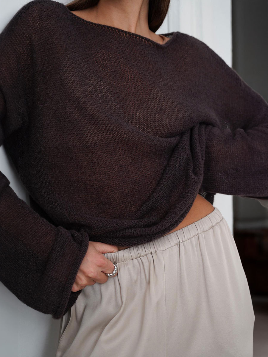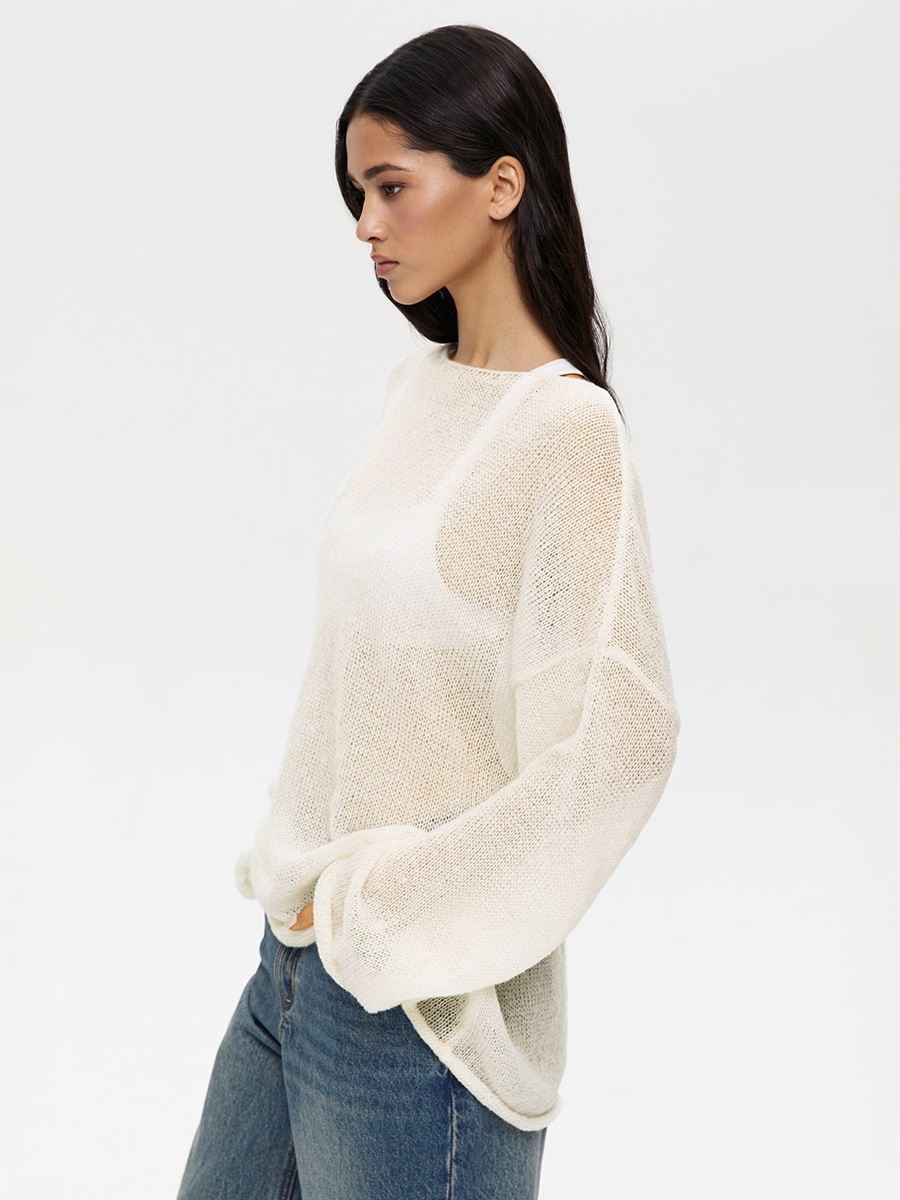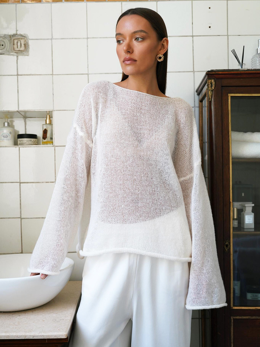 국경 간 중공 니트 셔츠 유럽과 미국 2025 년 봄과 여름 새로운 여성의 관점 얇은 대형 목 뿔 소매 티셔츠