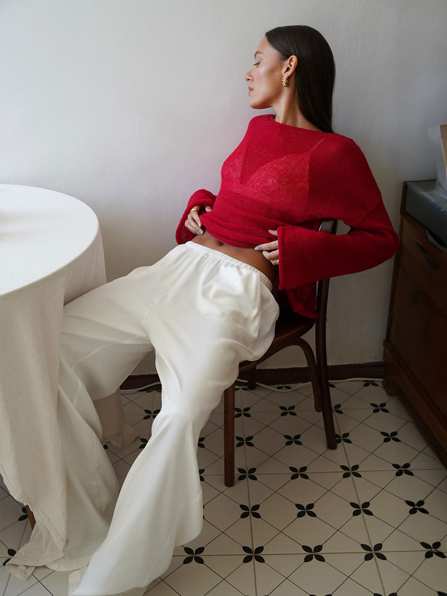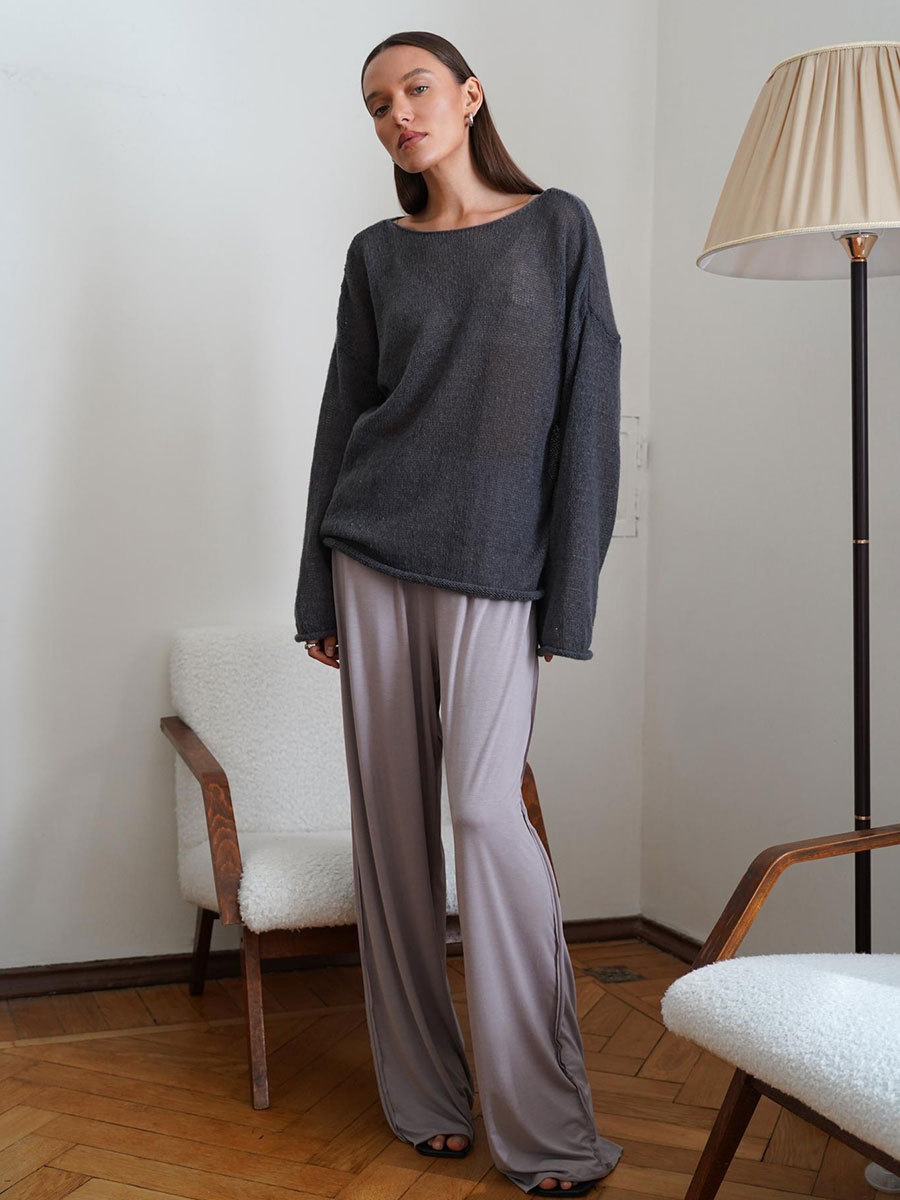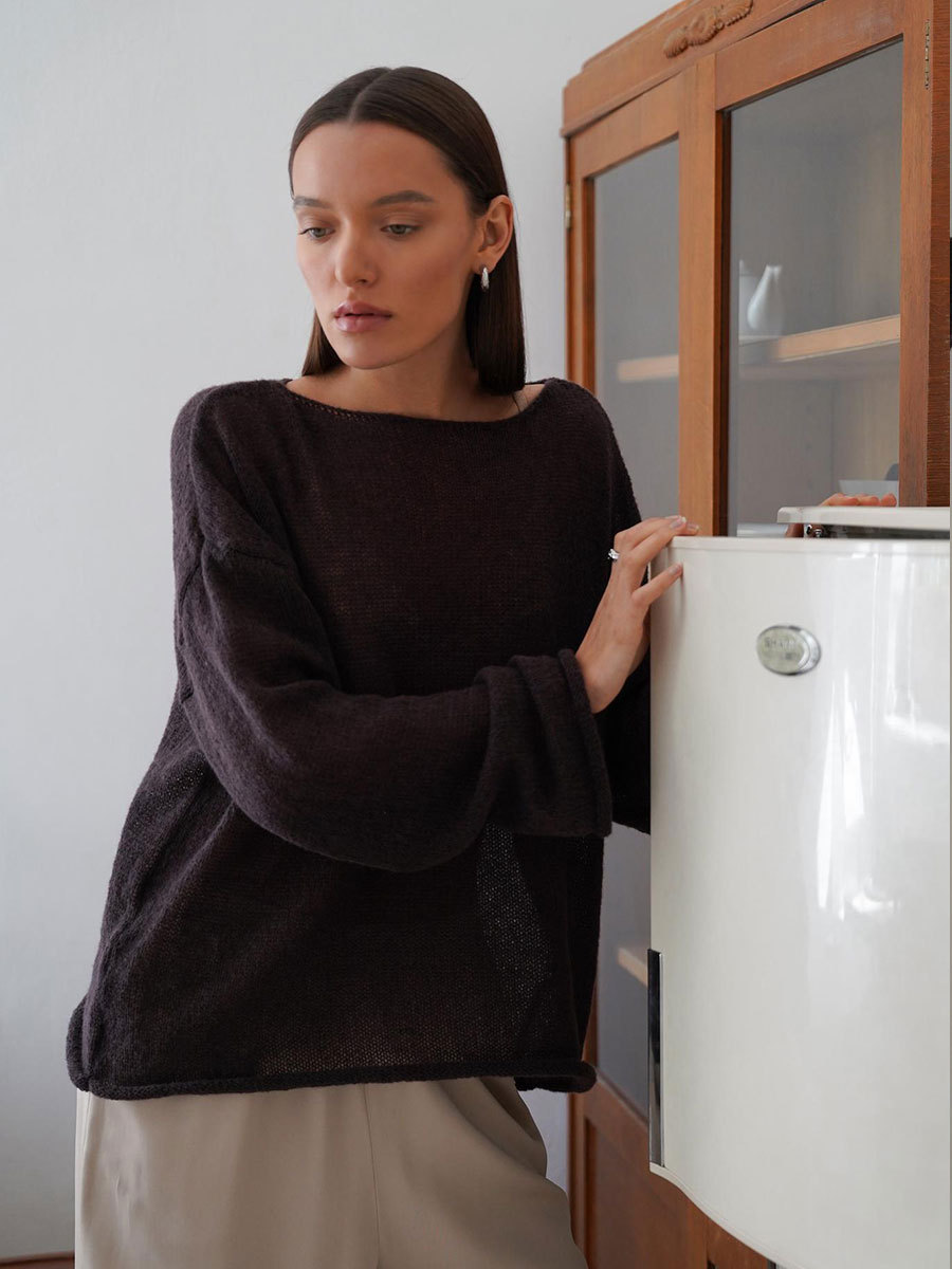 국경 간 중공 니트 셔츠 유럽과 미국 2025 년 봄과 여름 새로운 여성의 관점 얇은 대형 목 뿔 소매 티셔츠