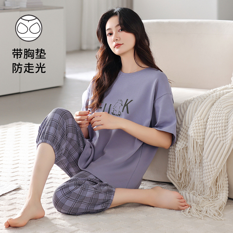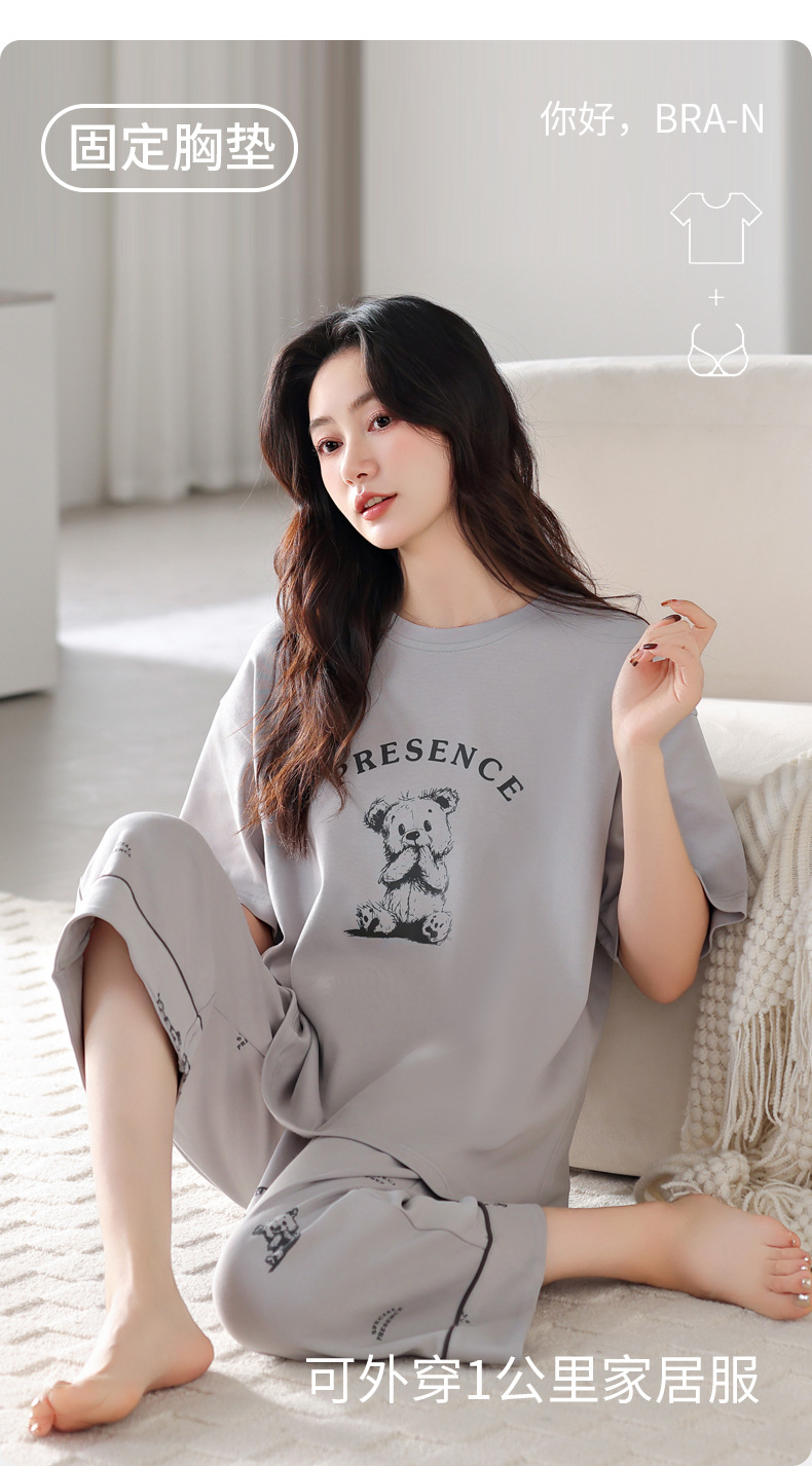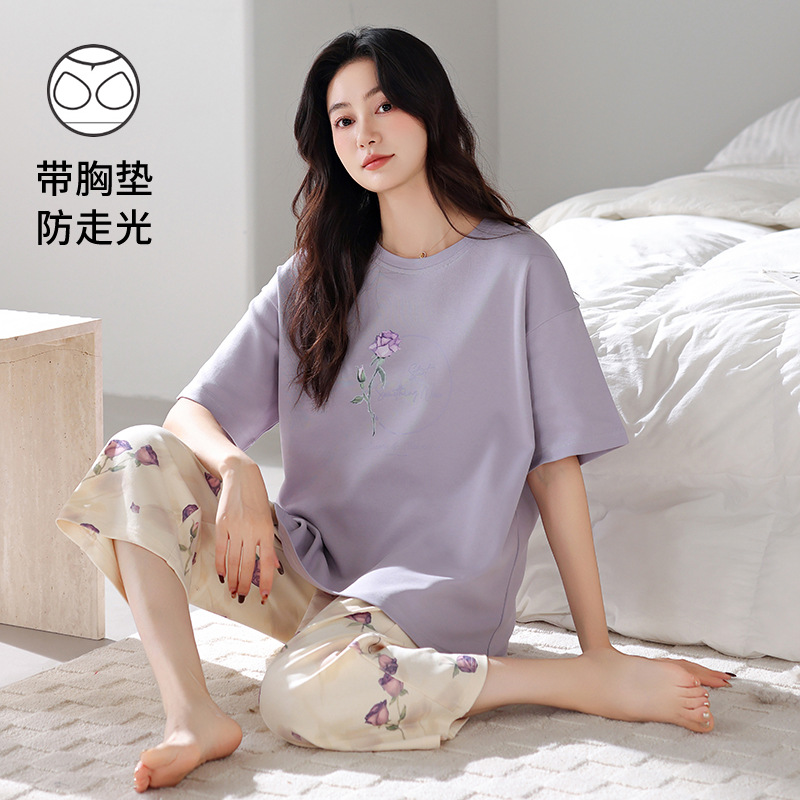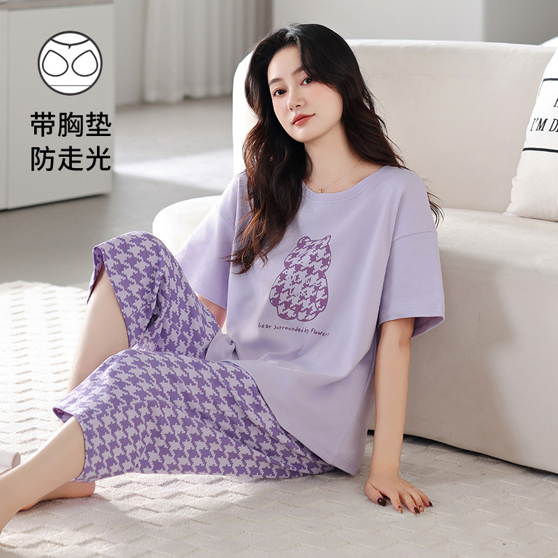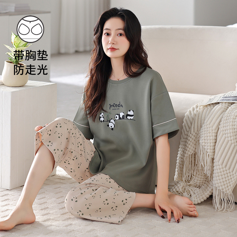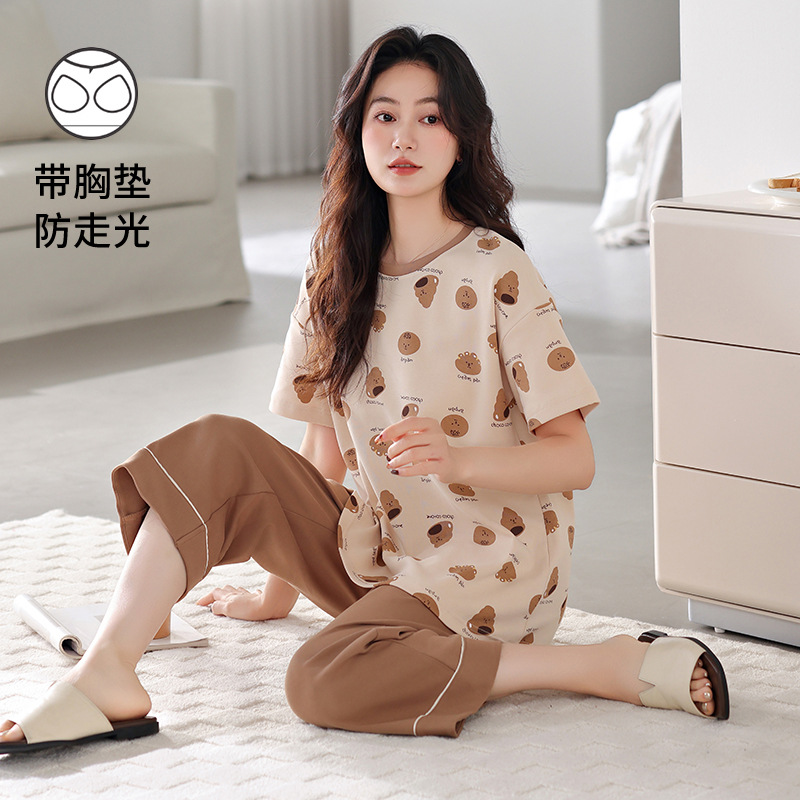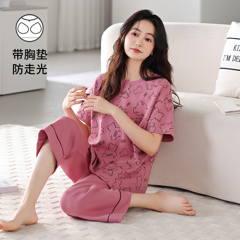 잠옷 여성의 여름 순면 반소매 바지 가슴 패드와 함께 바지 여름 2025 새로운 면 홈 의류 여름 얇은스토어 가기