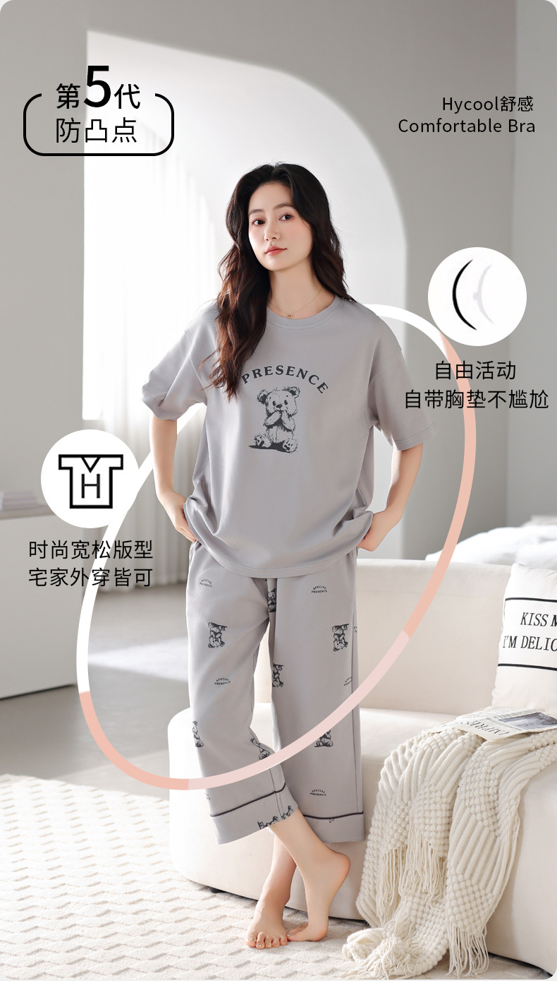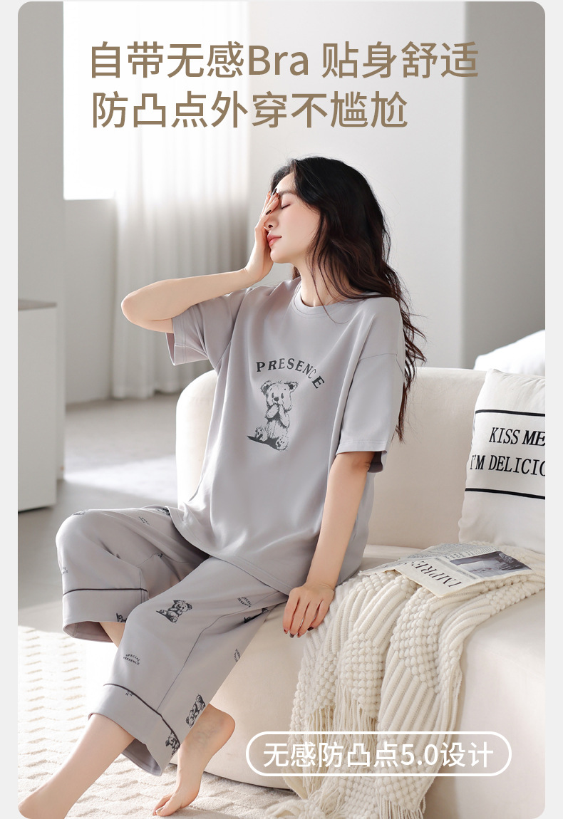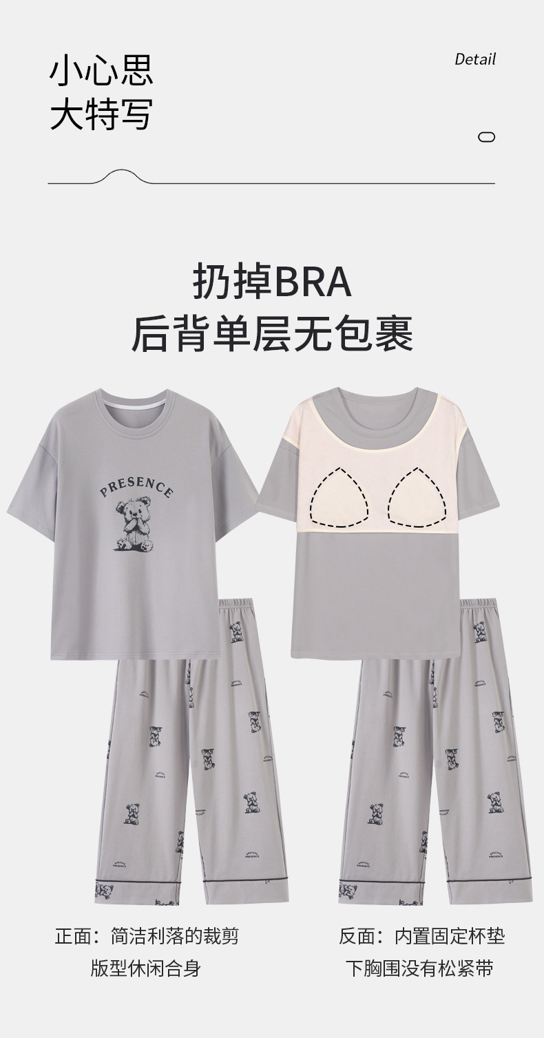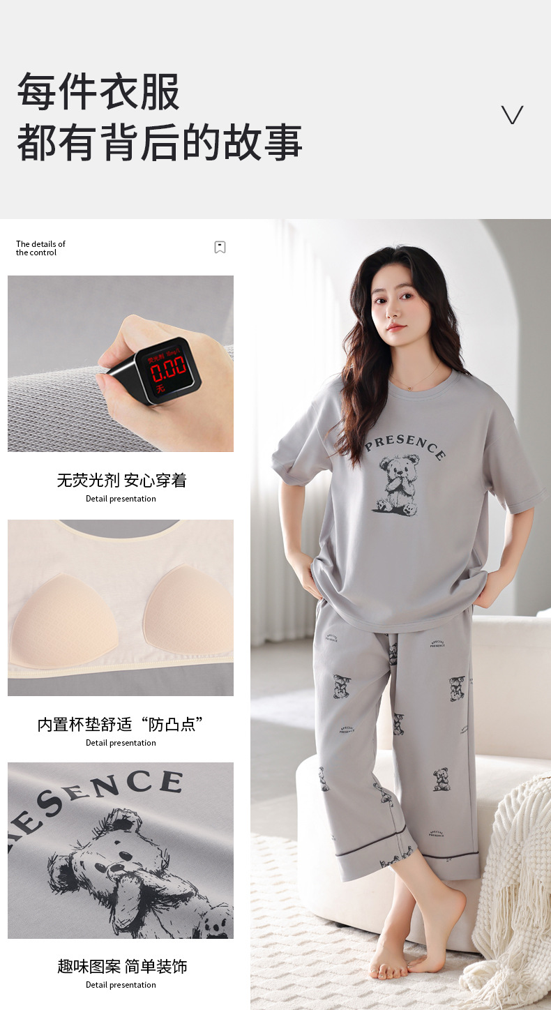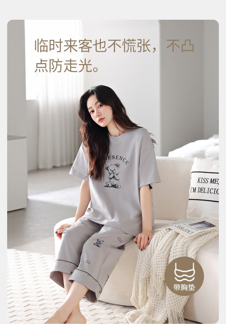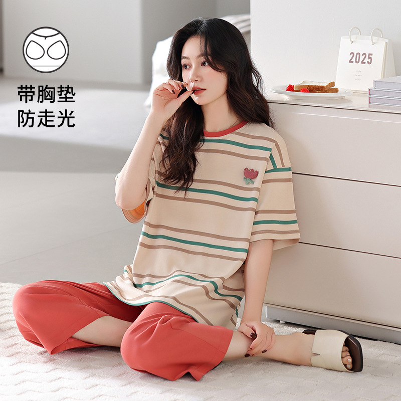 잠옷 여성의 여름 순면 반소매 바지 가슴 패드와 함께 바지 여름 2025 새로운 면 홈 의류 여름 얇은스토어 가기