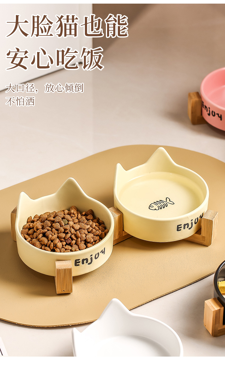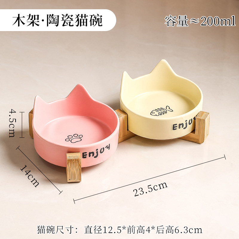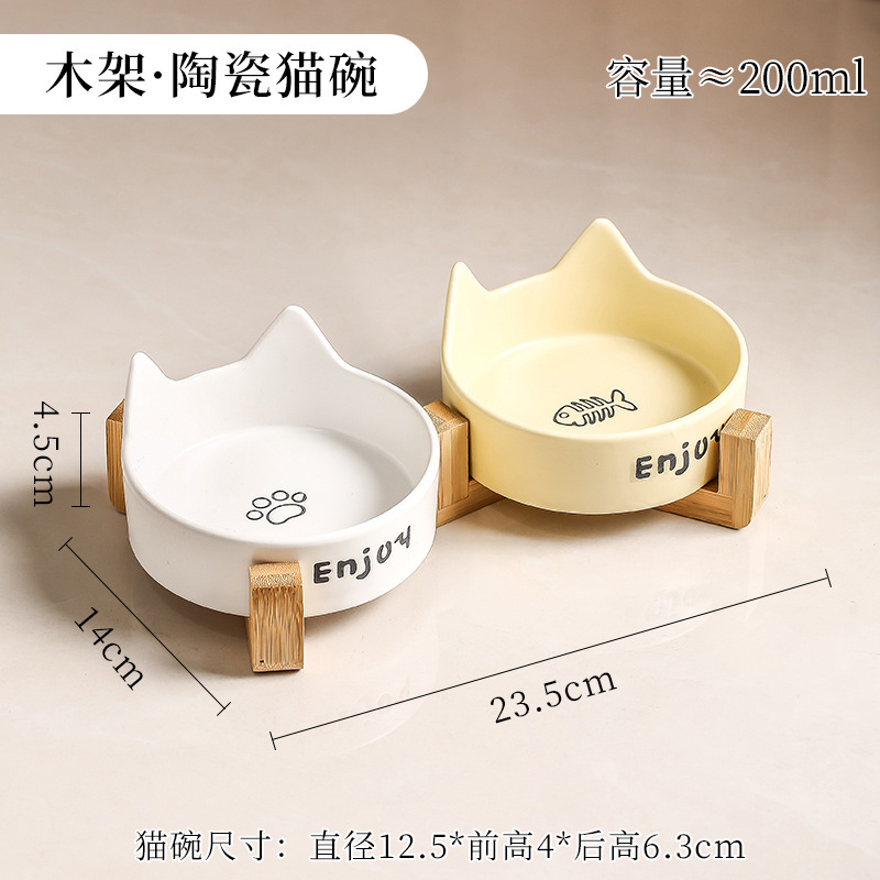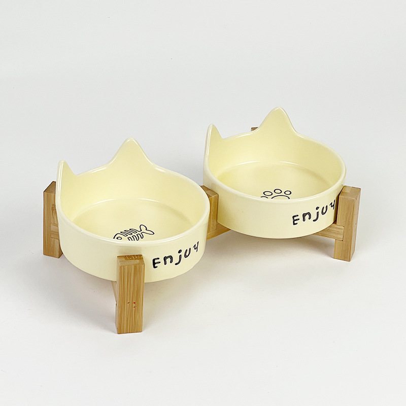 • 고양이귀 고양이발톱 생선뼈 그릇 [노란색] + 높이가 높아진 일체형 이중 그릇 나무 받침대