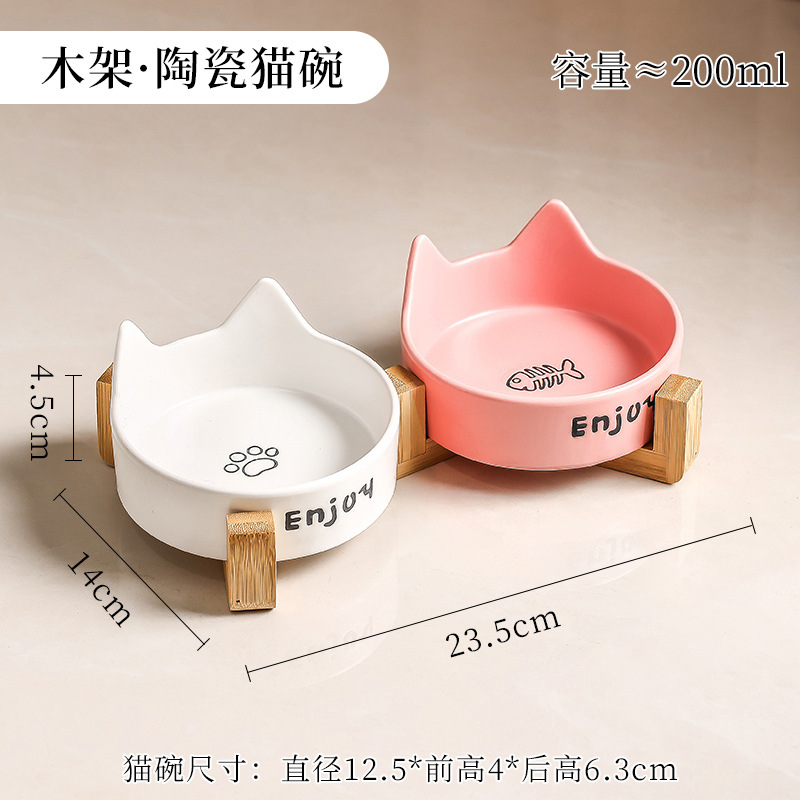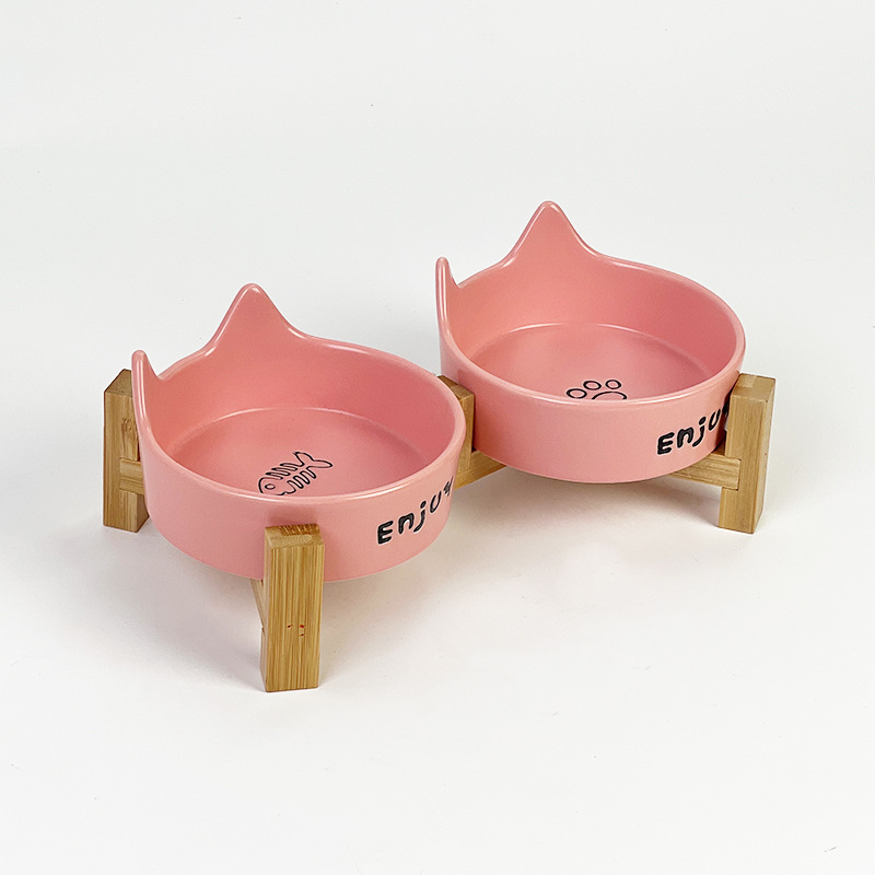 • 고양이귀 고양이발톱 생선뼈 그릇 [핑크] + 높이가 높아진 일체형 이중 그릇 나무 받침대