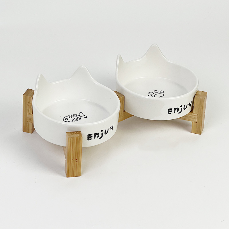 • 고양이 귀 모양 식기 [흰색 고양이 발바닥 + 검은색 물고기 뼈] + 2구 나무 받침대