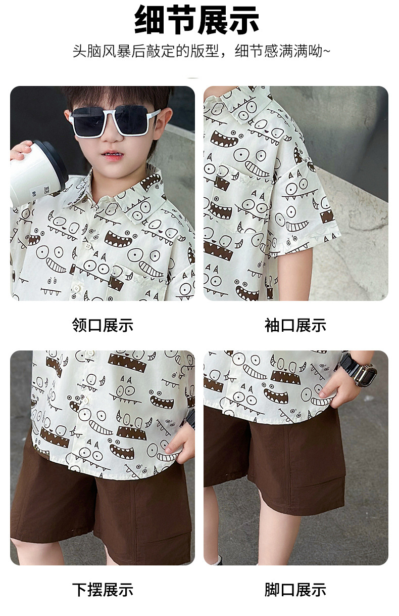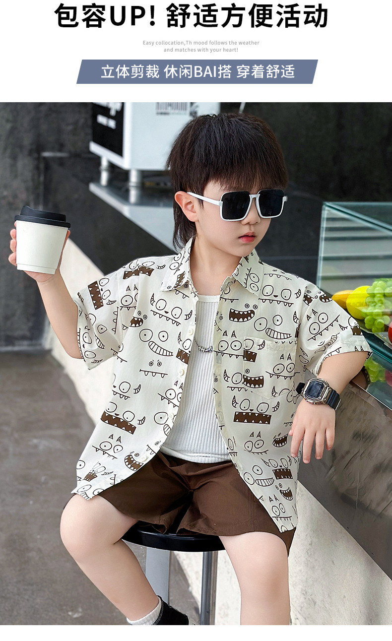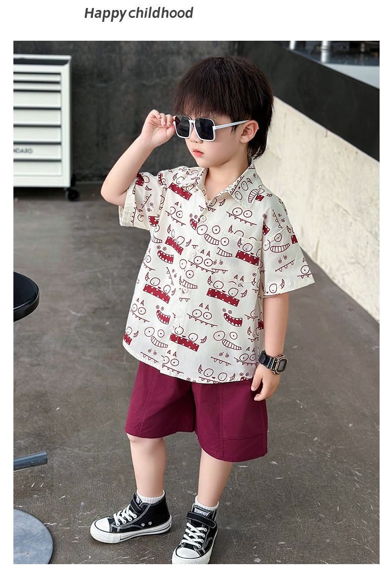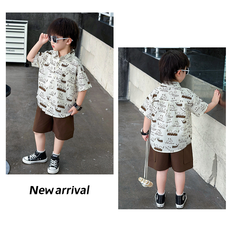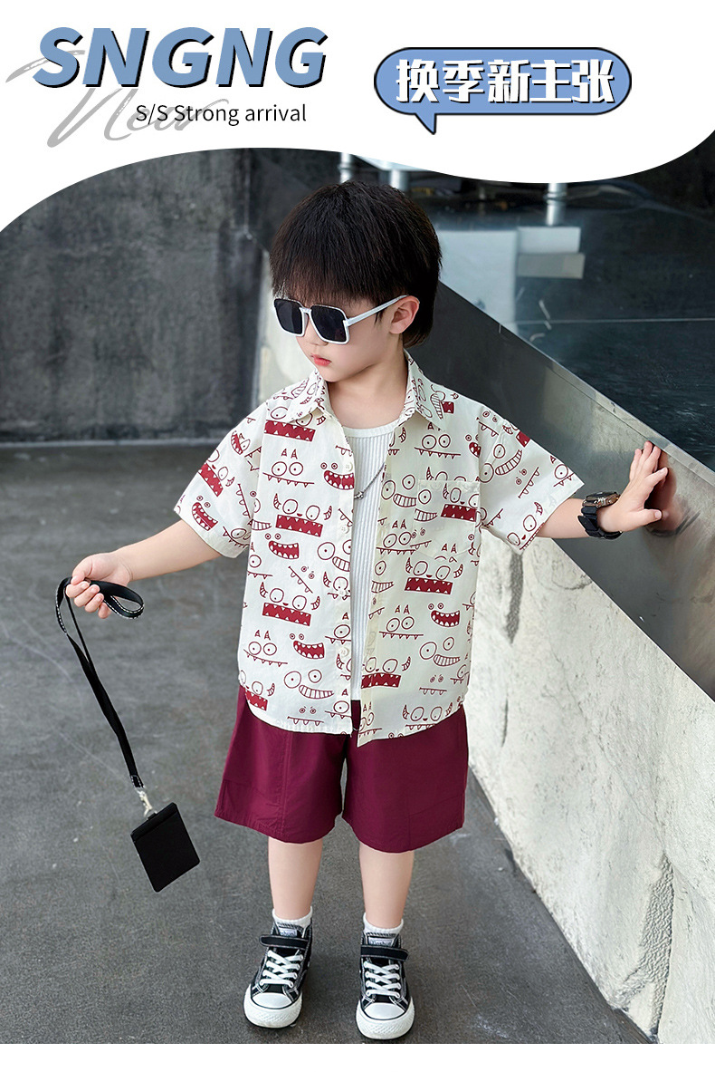 남아 및 여아용 순면 괴물 프린트 셔츠 세트, 새로운 스타일의 남아 및 여아용 캐주얼하고 시원하며 내구성이 뛰어나며 땀 흡수 기능이 있는 투피스 세트