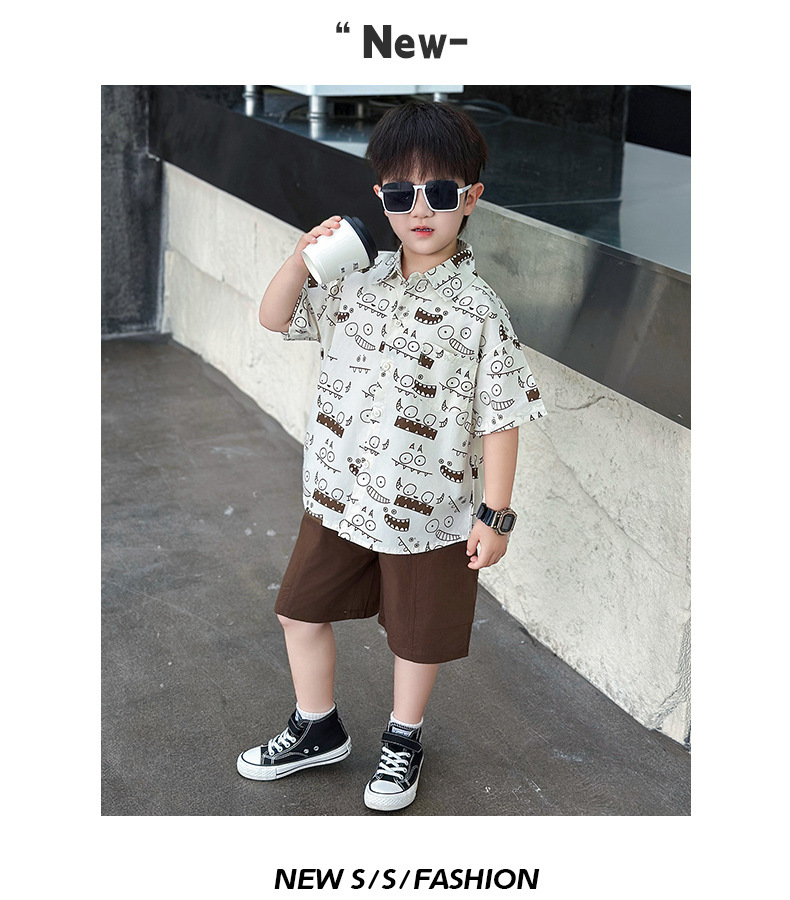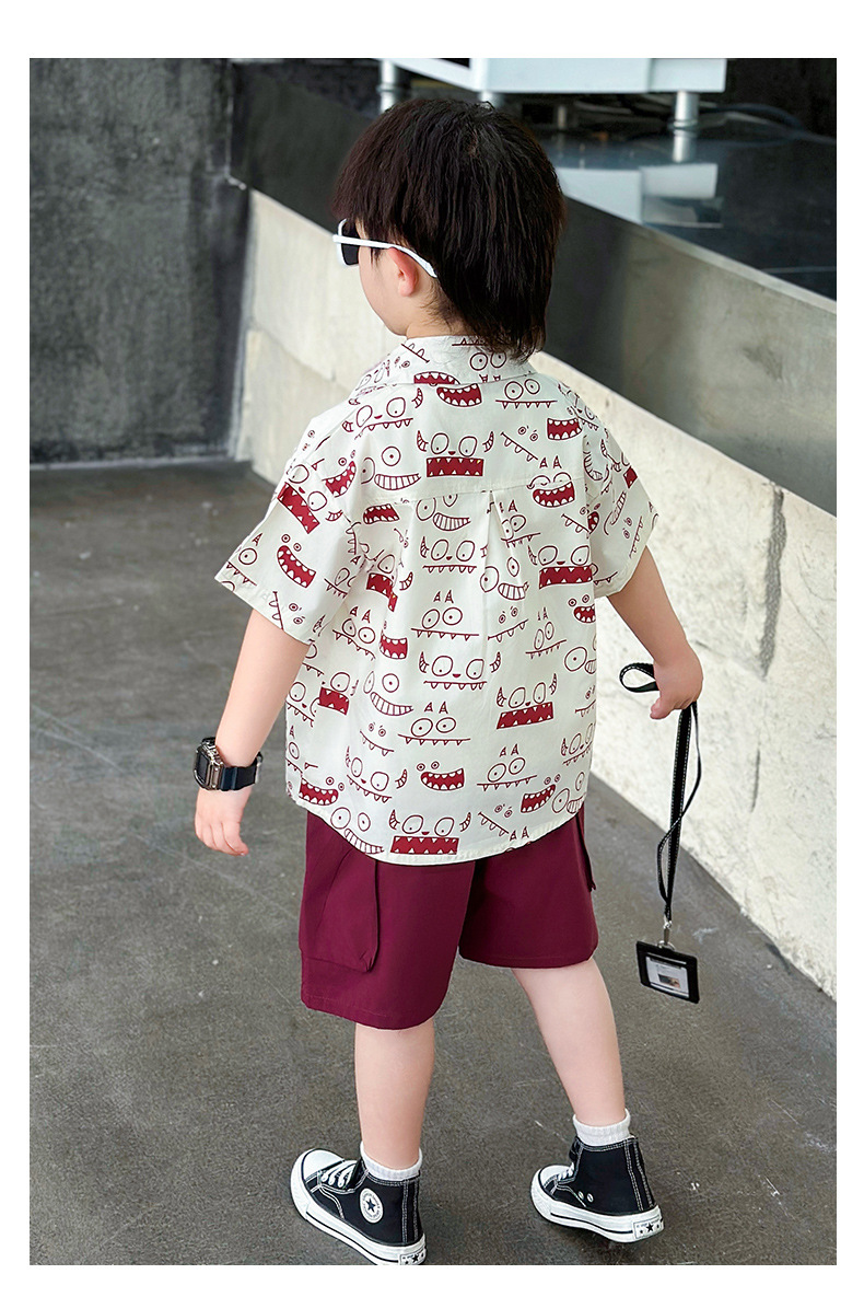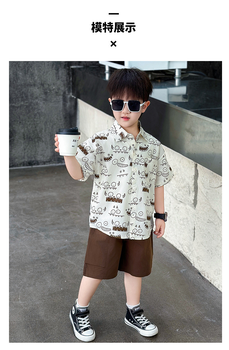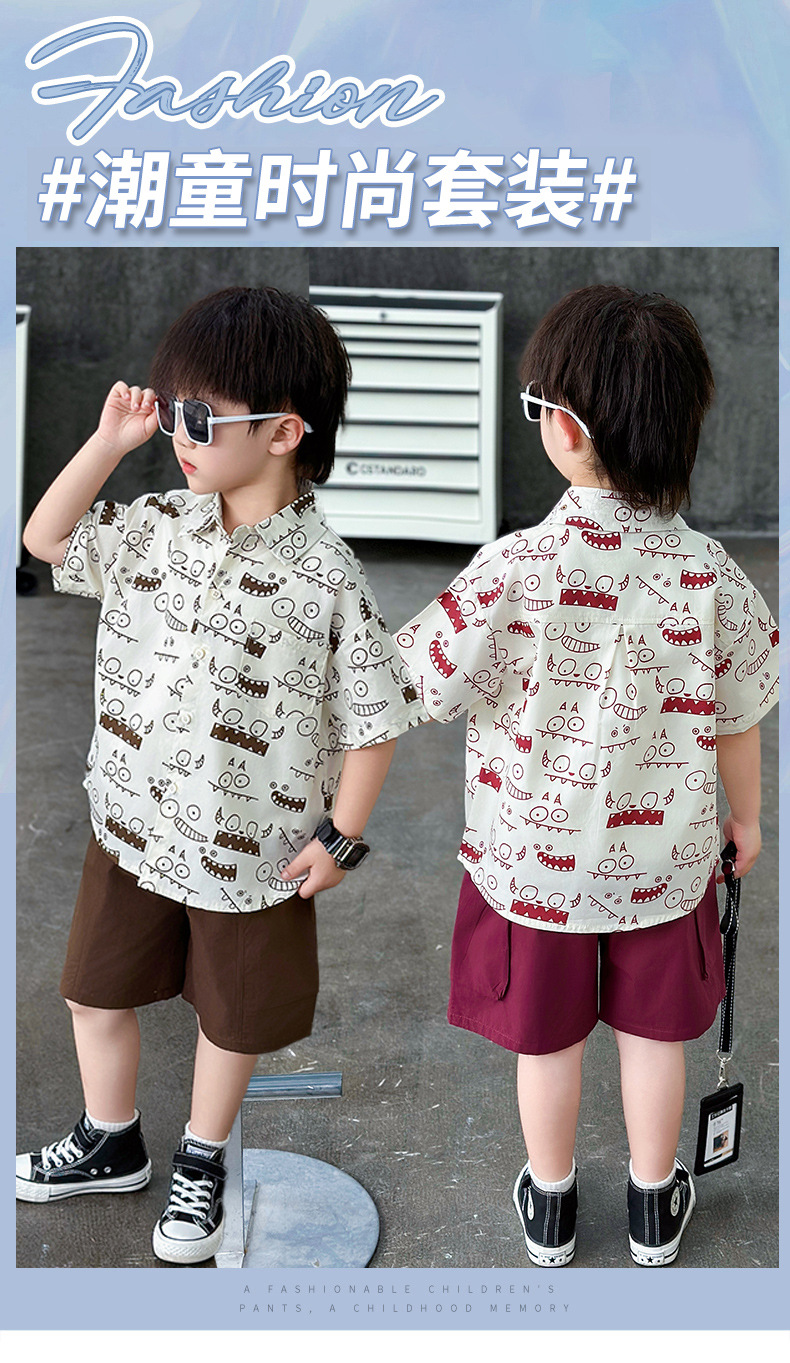 남아 및 여아용 순면 괴물 프린트 셔츠 세트, 새로운 스타일의 남아 및 여아용 캐주얼하고 시원하며 내구성이 뛰어나며 땀 흡수 기능이 있는 투피스 세트