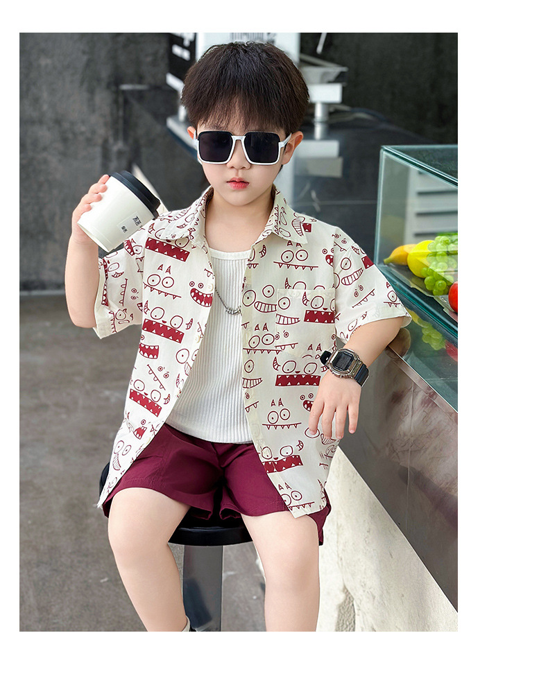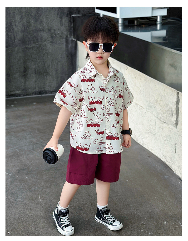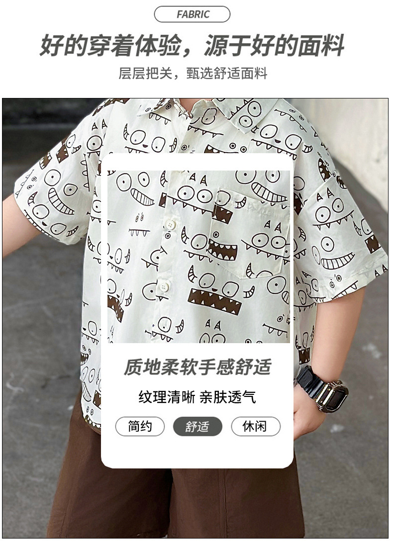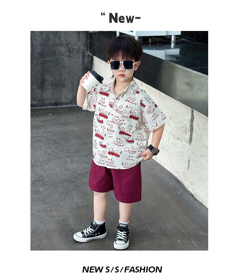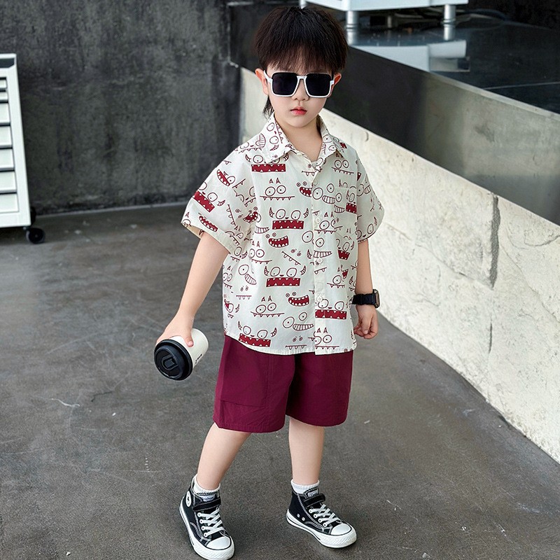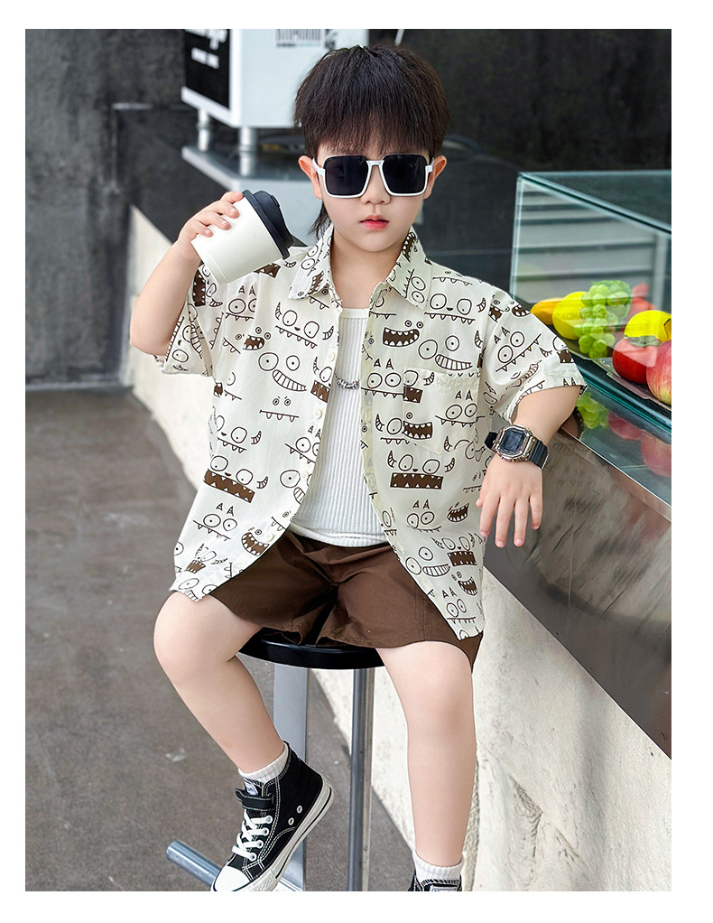 남아 및 여아용 순면 괴물 프린트 셔츠 세트, 새로운 스타일의 남아 및 여아용 캐주얼하고 시원하며 내구성이 뛰어나며 땀 흡수 기능이 있는 투피스 세트