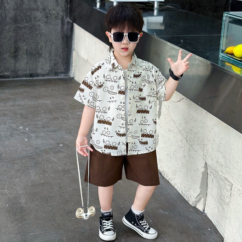 남아 및 여아용 순면 괴물 프린트 셔츠 세트, 새로운 스타일의 남아 및 여아용 캐주얼하고 시원하며 내구성이 뛰어나며 땀 흡수 기능이 있는 투피스 세트스토어 가기