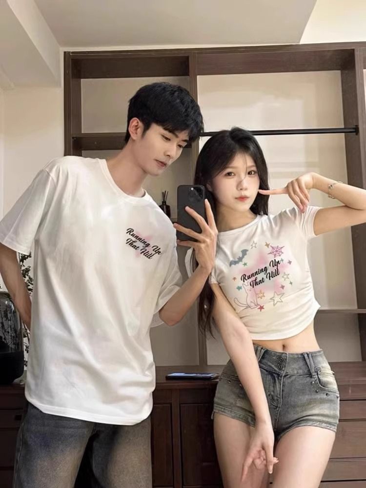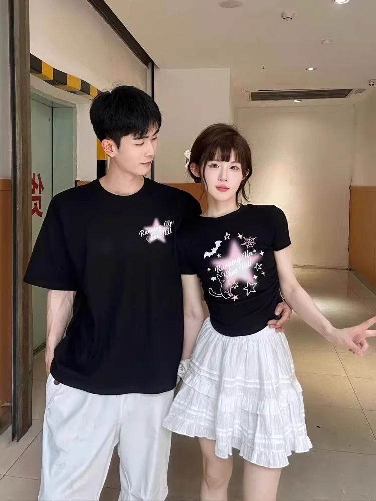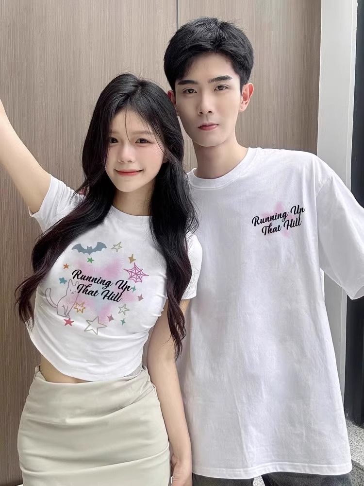 틈새 디자인 센스 길고 짧은 세트 코튼 다른 커플 원피스 티셔츠 짧은 소매 2025 새로운 여름스토어 가기