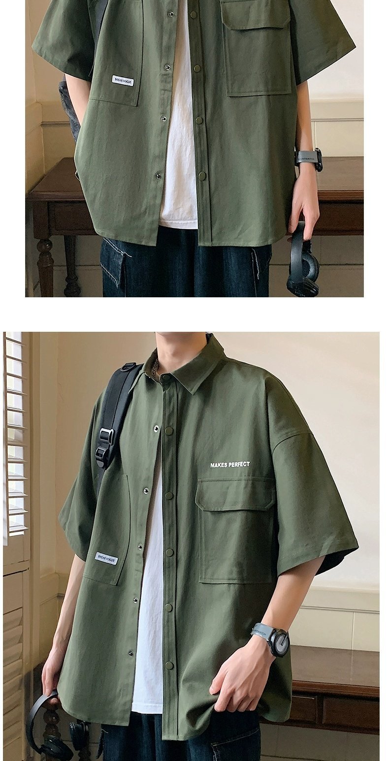 작업복 반팔 셔츠 남성 여름 얇은 얼음 실크 트렌디 셔츠 소년 여름 캐주얼 루즈 인치 셔츠 재킷