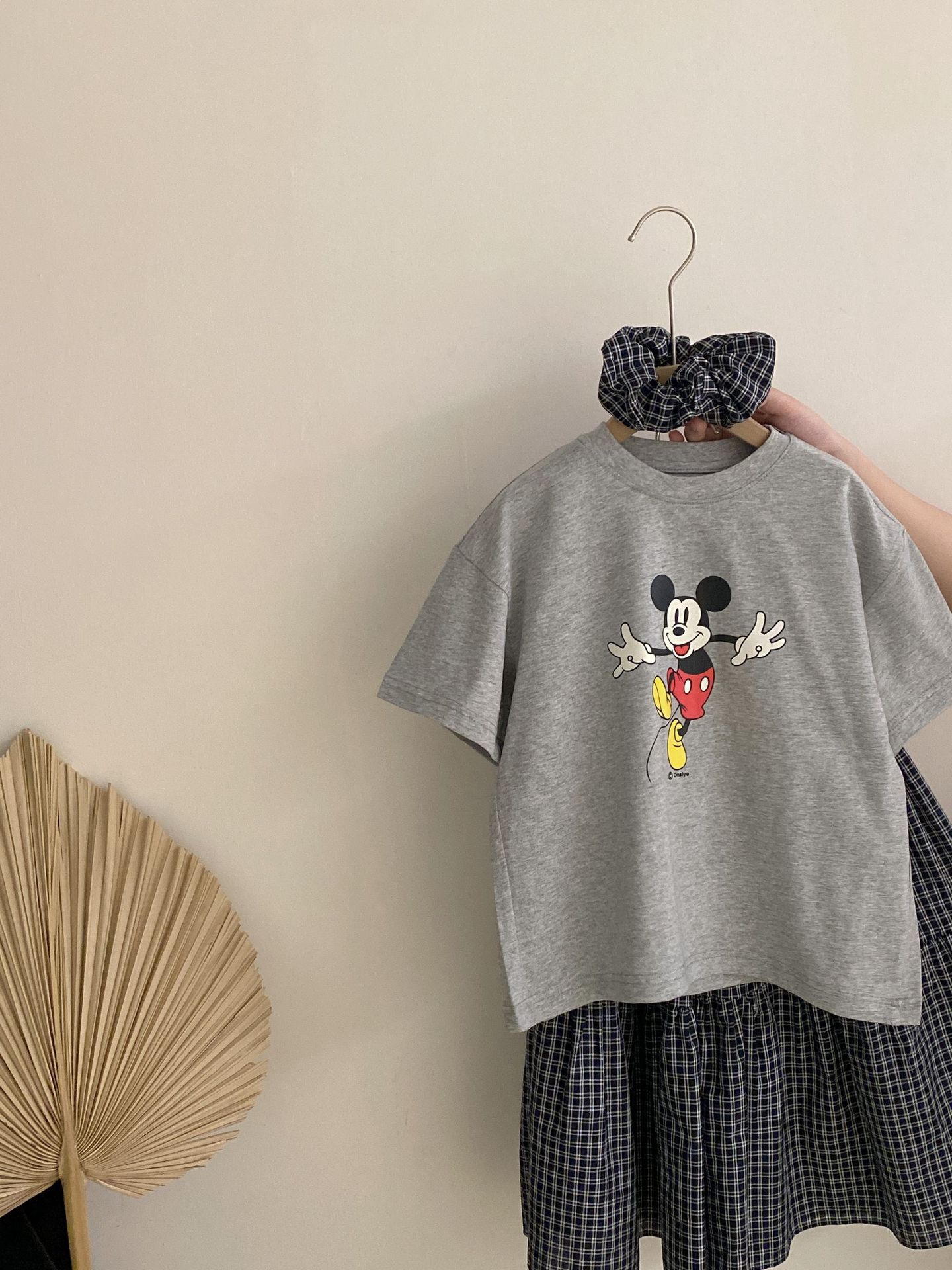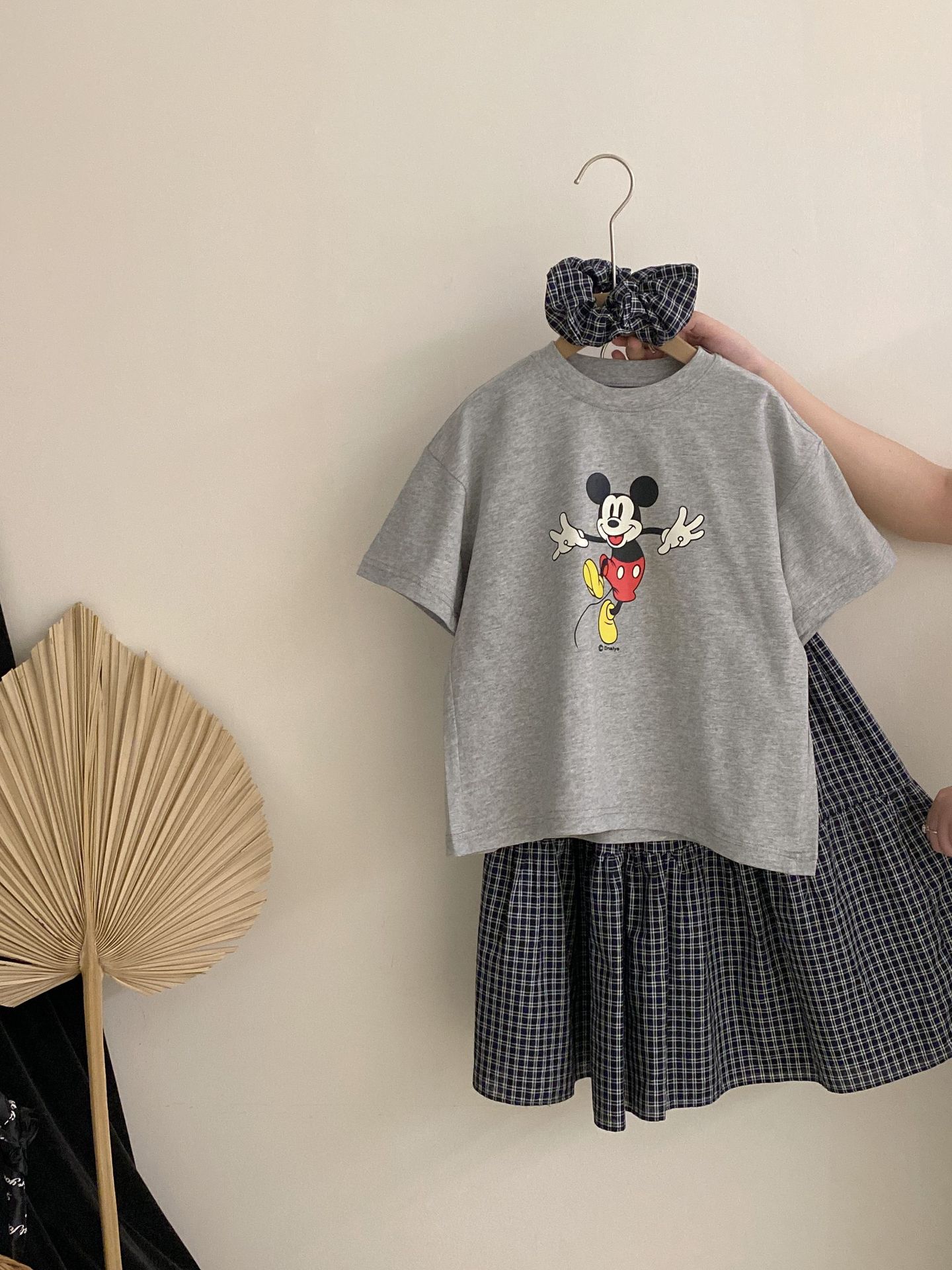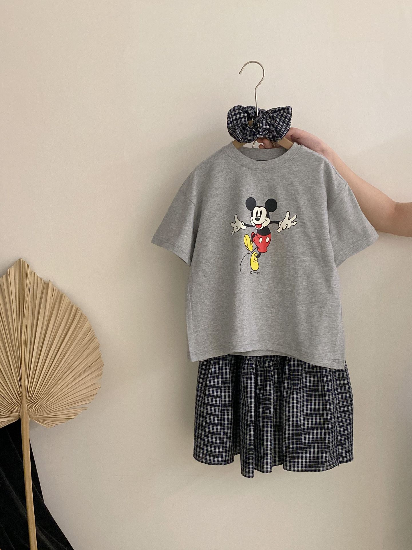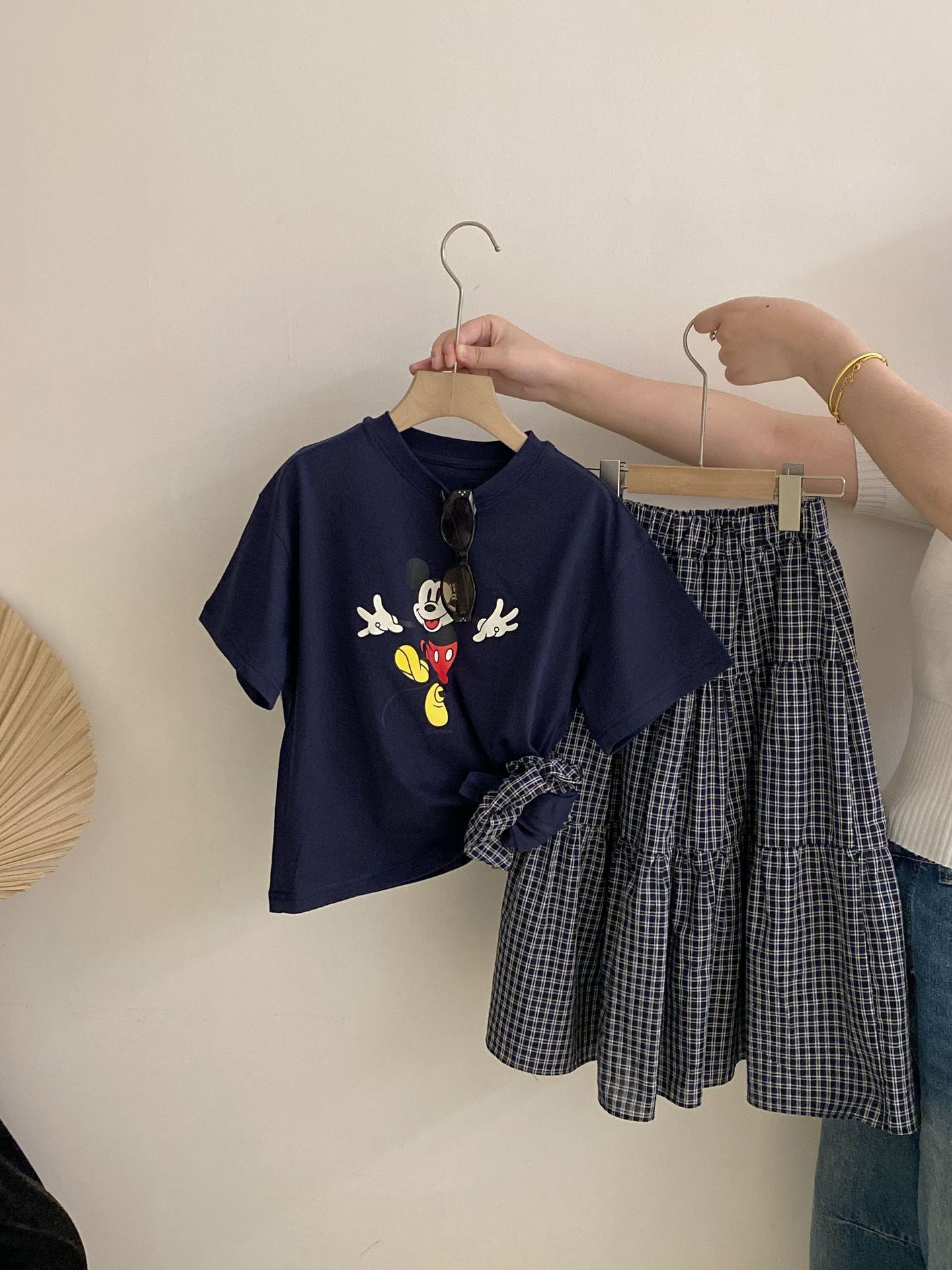 한국 스타일 걸스 여름 새 만화 미키 마우스 반팔 티셔츠 2025 올 매치 격자 무늬 스커트 투피스 유행 세트스토어 가기