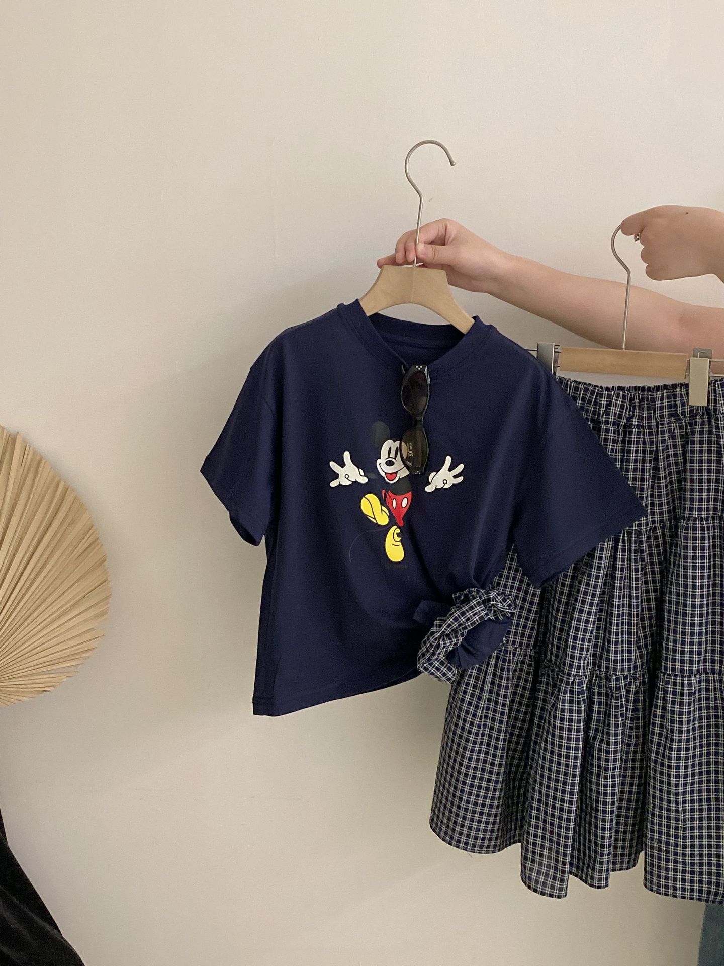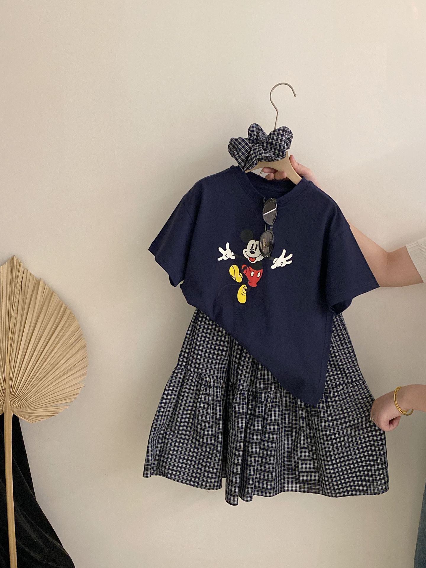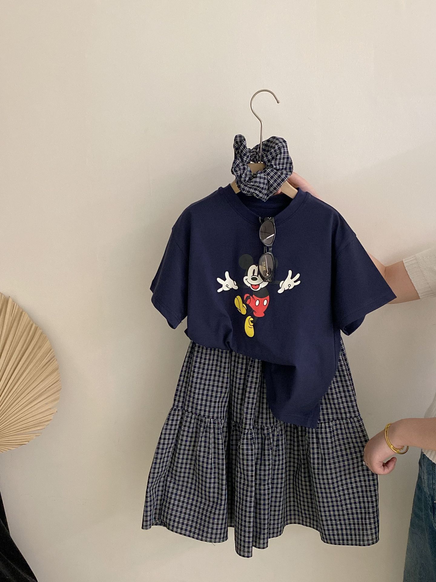 한국 스타일 걸스 여름 새 만화 미키 마우스 반팔 티셔츠 2025 올 매치 격자 무늬 스커트 투피스 유행 세트스토어 가기