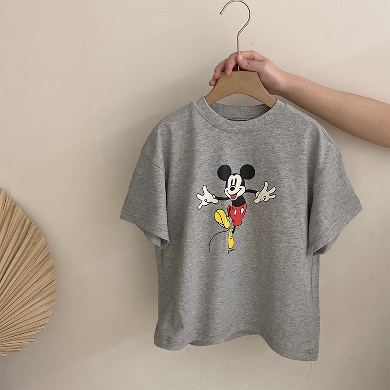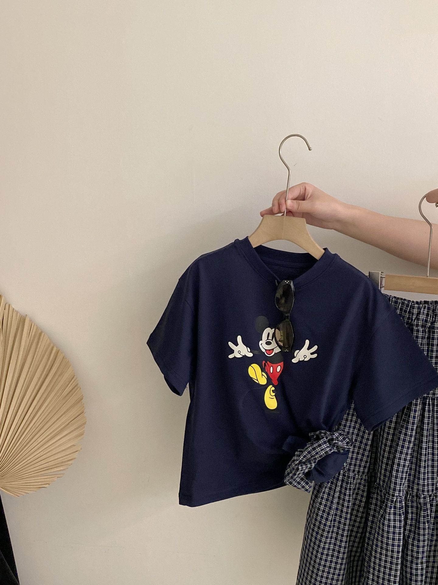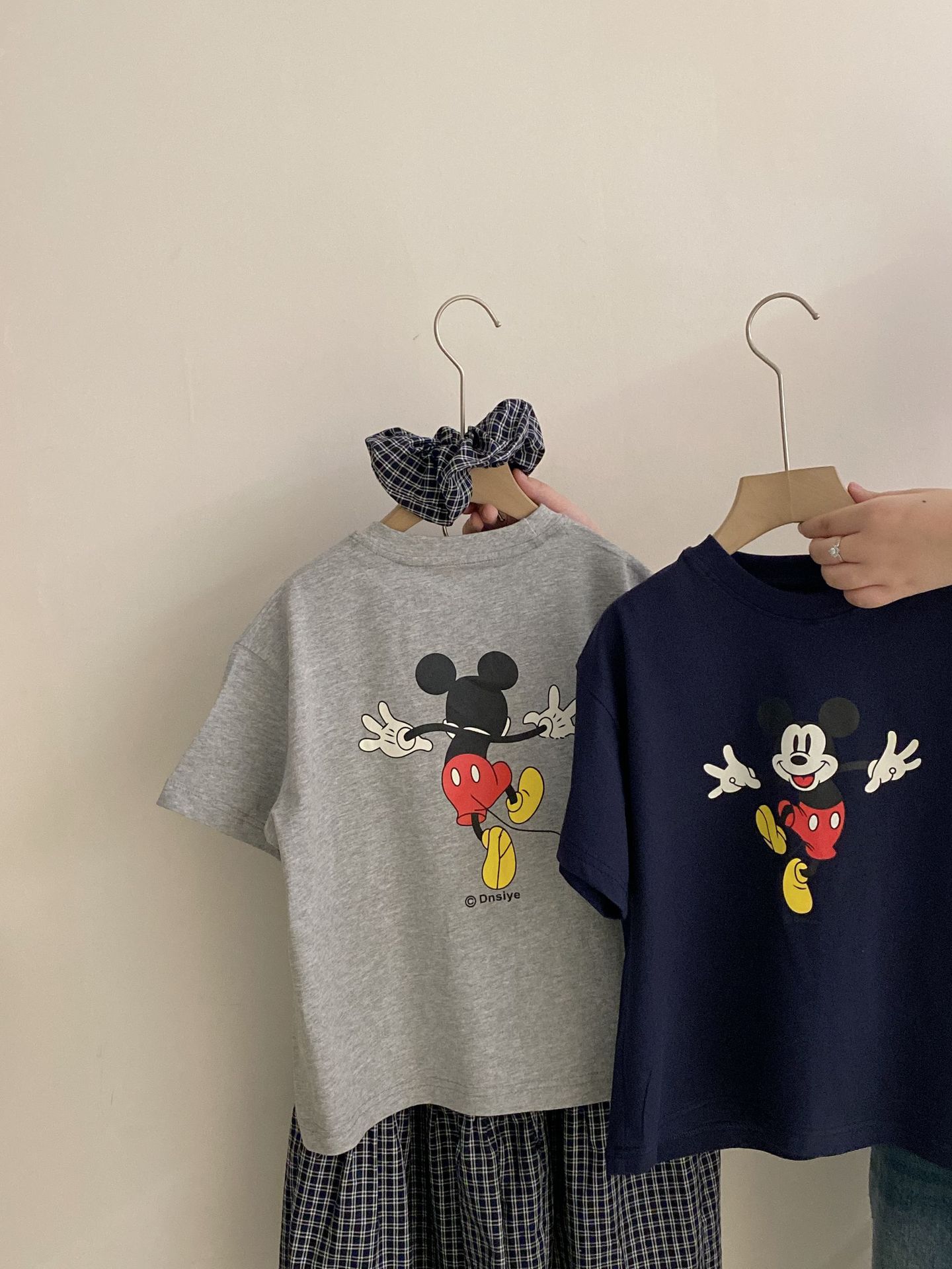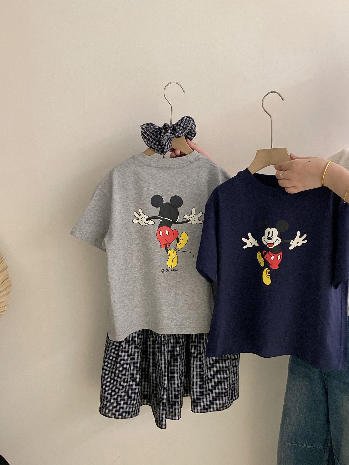 한국 스타일 걸스 여름 새 만화 미키 마우스 반팔 티셔츠 2025 올 매치 격자 무늬 스커트 투피스 유행 세트스토어 가기