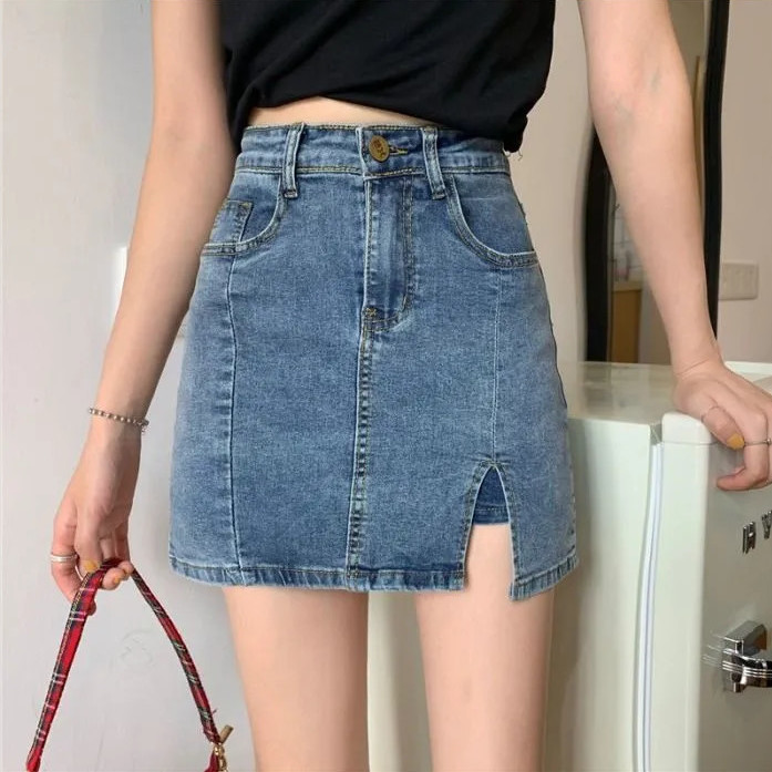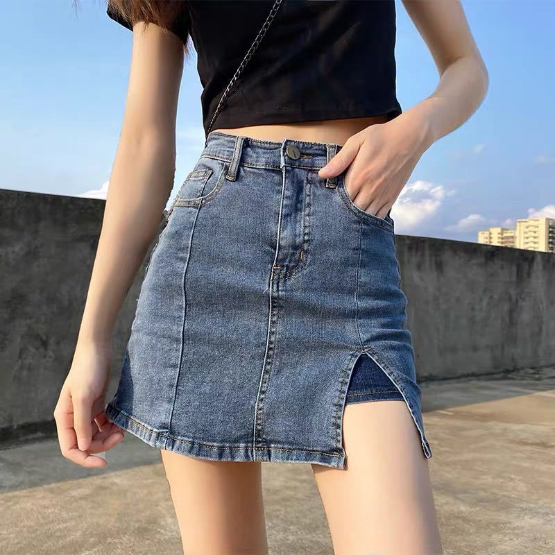 봄과 여름 2025 새로운 눈부심 방지 데님 흉상 스커트 높은 허리 탄성 슬림 A 라인 스플릿 힙합 스커트스토어 가기