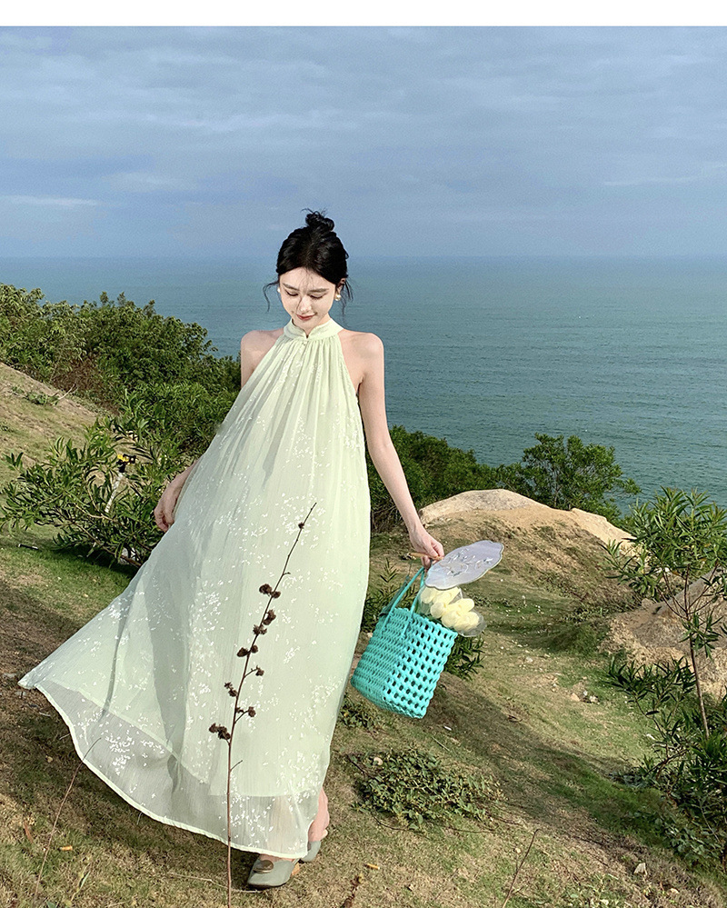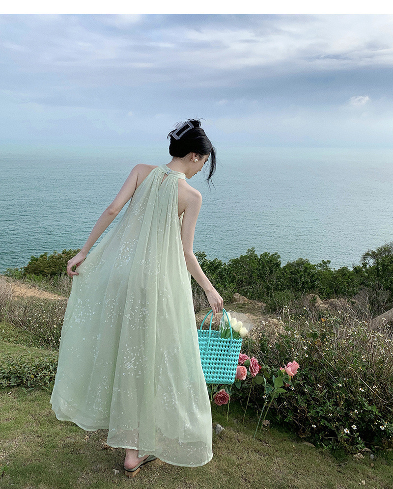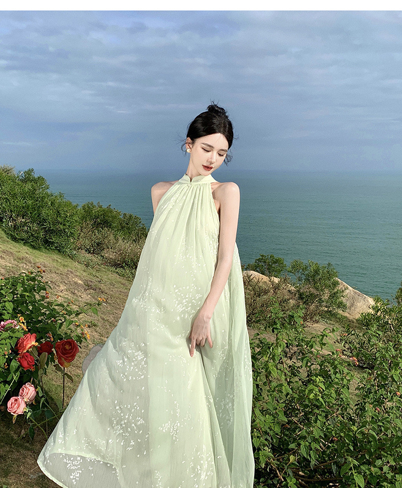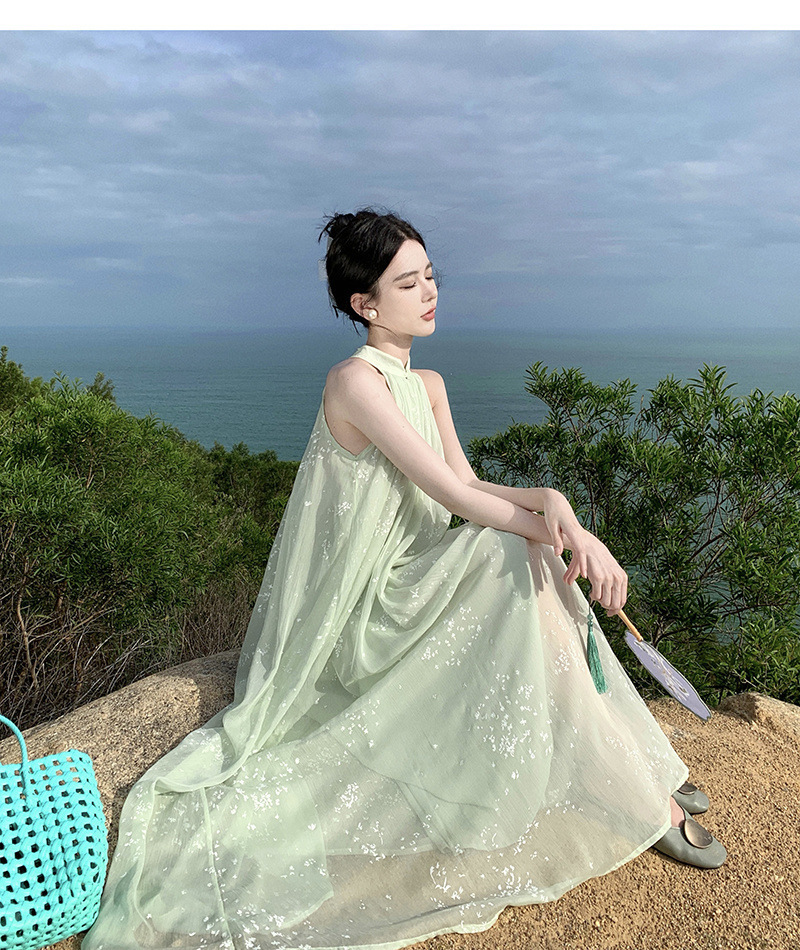 궈펑 청삼 수정 느슨한 민소매 녹색 대형 스윙 원피스 여자 2025 년 여름 휴가 꽃 쉬폰 원피스스토어 가기