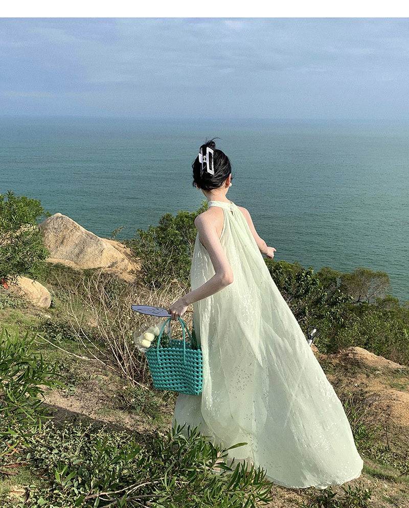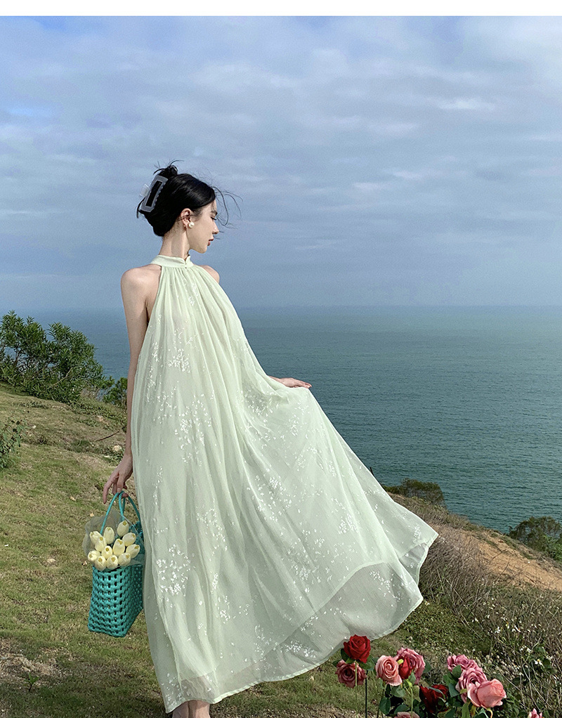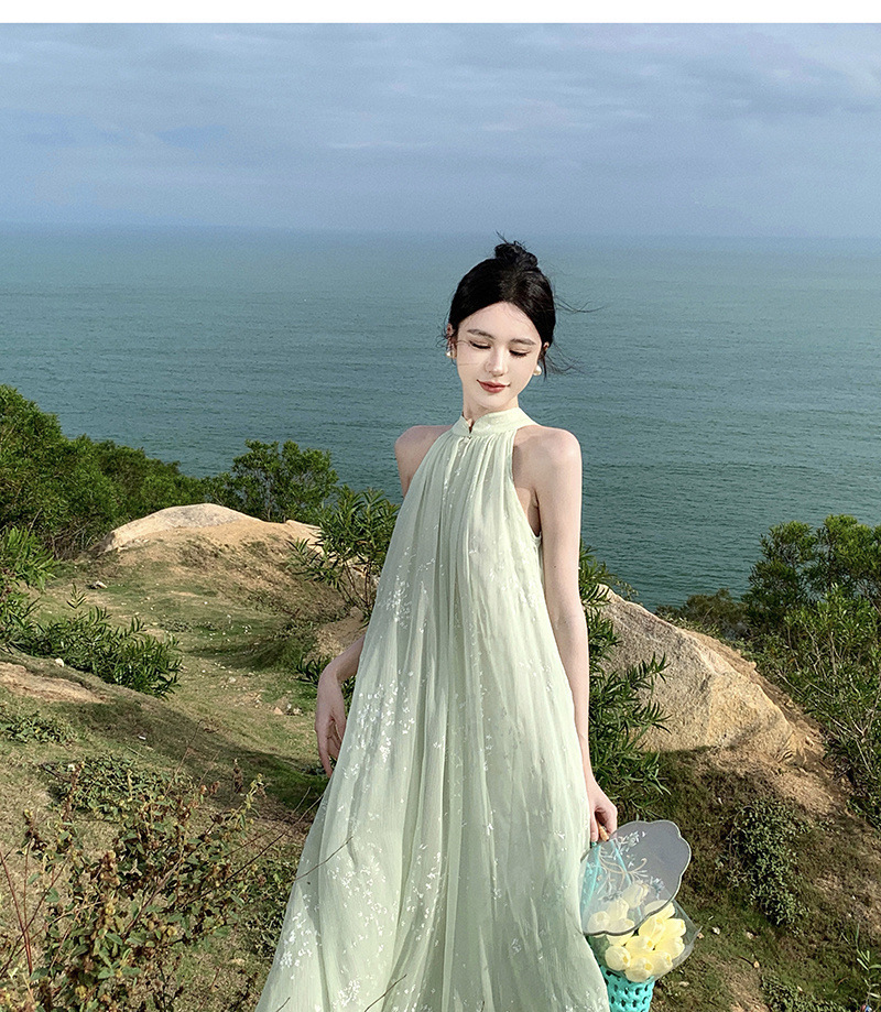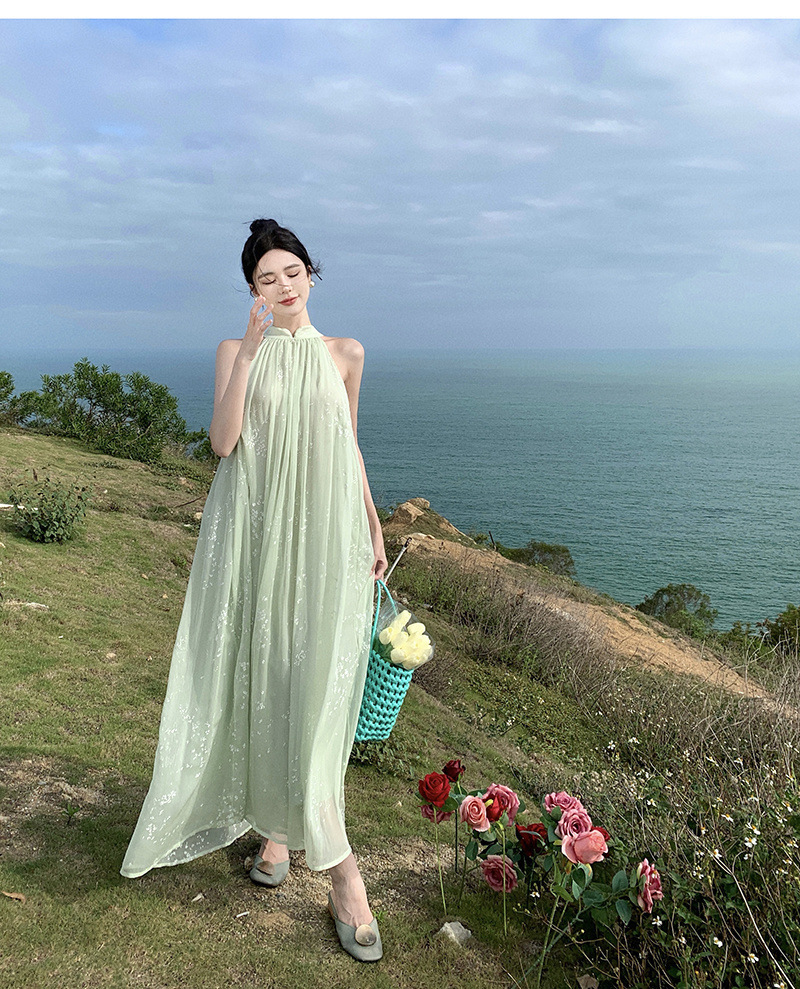 궈펑 청삼 수정 느슨한 민소매 녹색 대형 스윙 원피스 여자 2025 년 여름 휴가 꽃 쉬폰 원피스스토어 가기