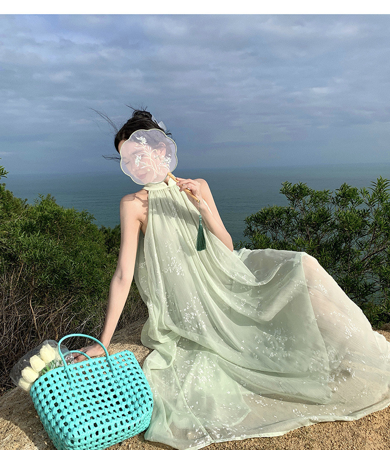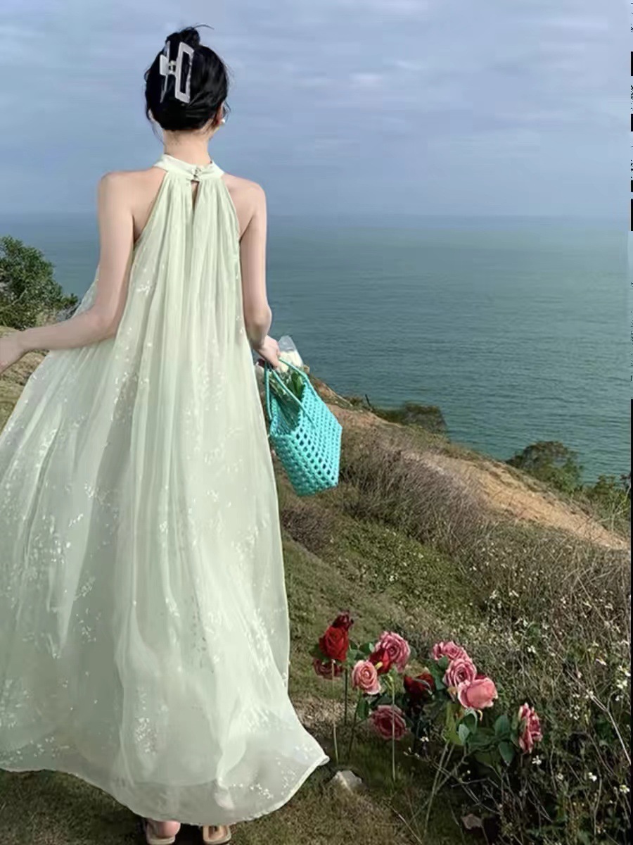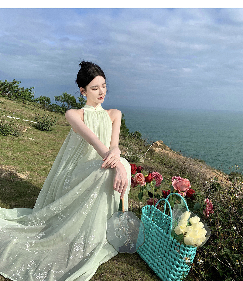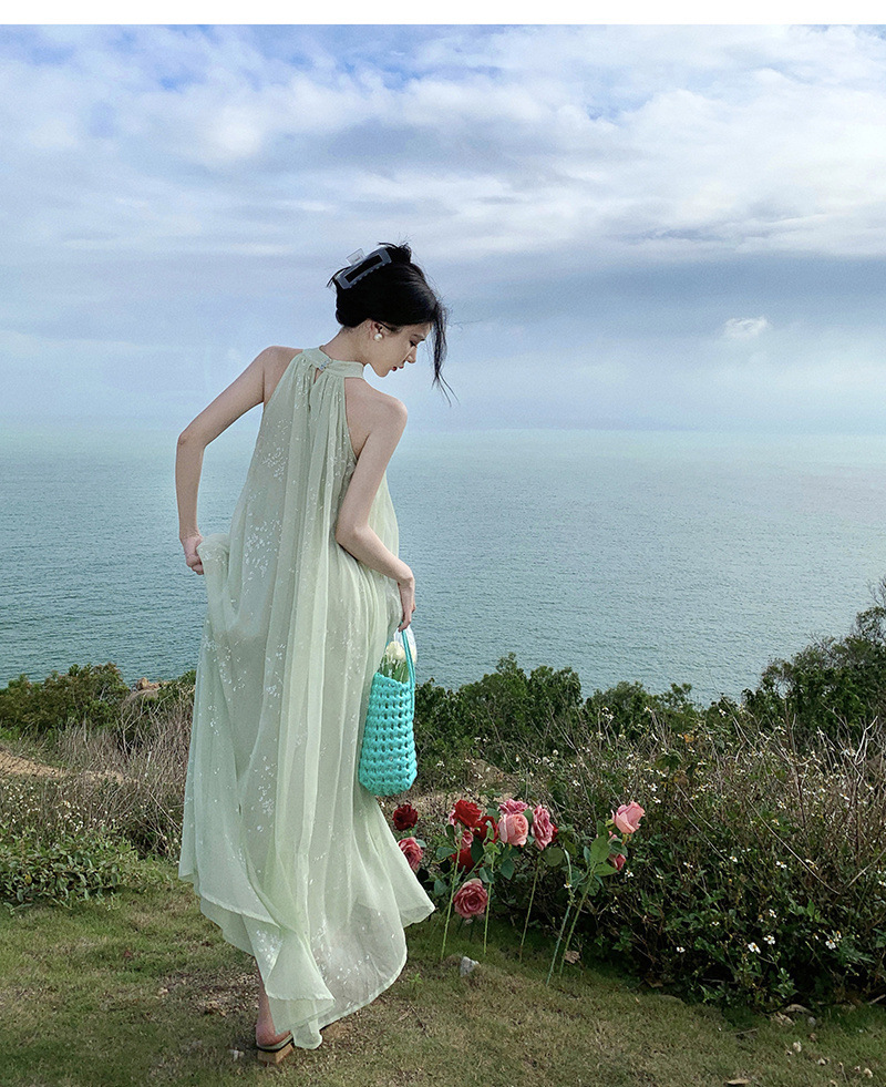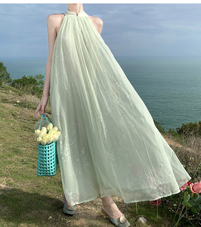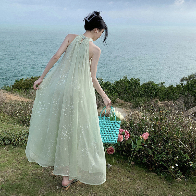 궈펑 청삼 수정 느슨한 민소매 녹색 대형 스윙 원피스 여자 2025 년 여름 휴가 꽃 쉬폰 원피스