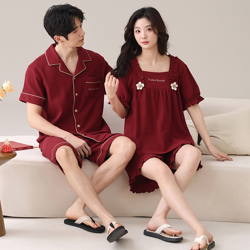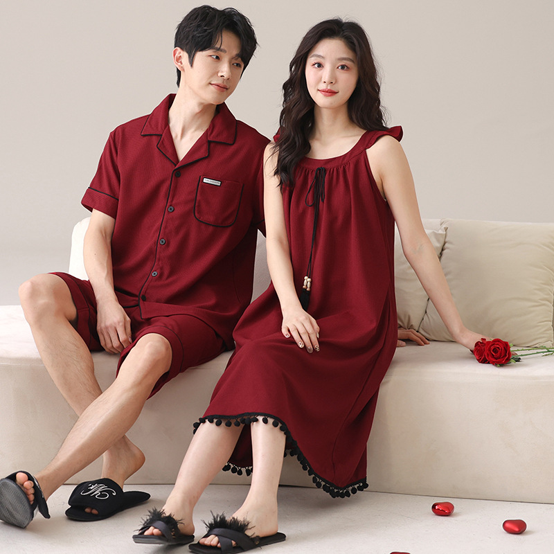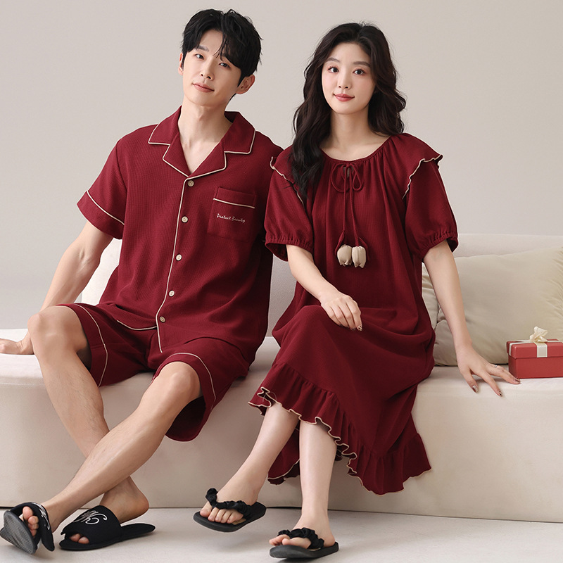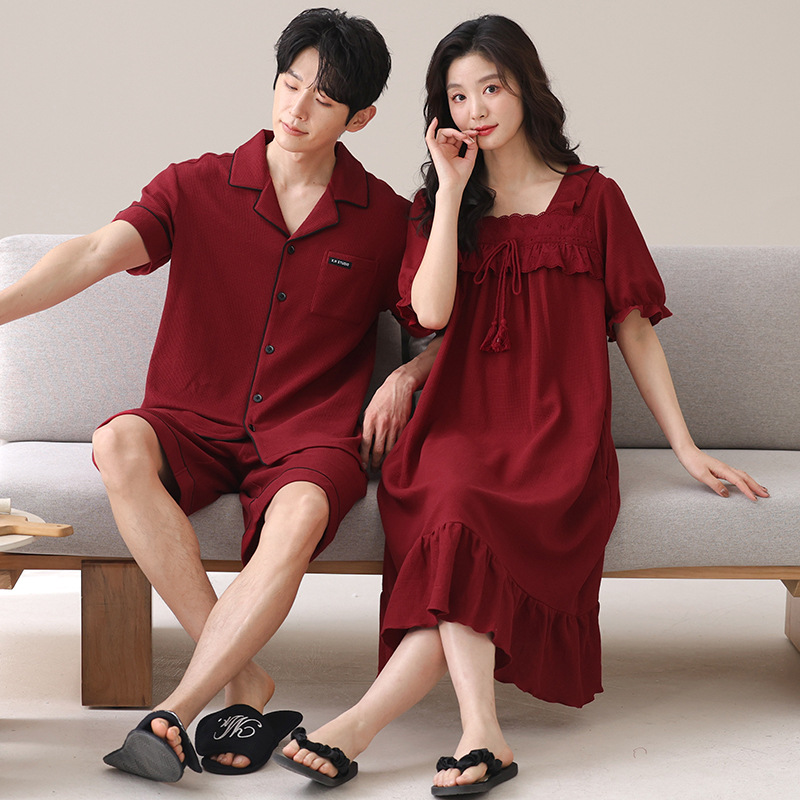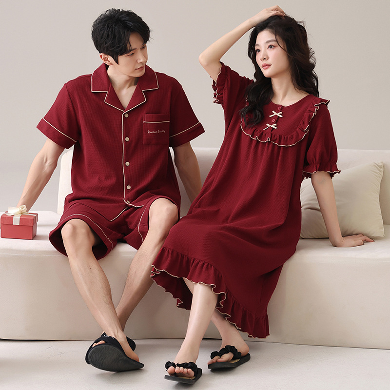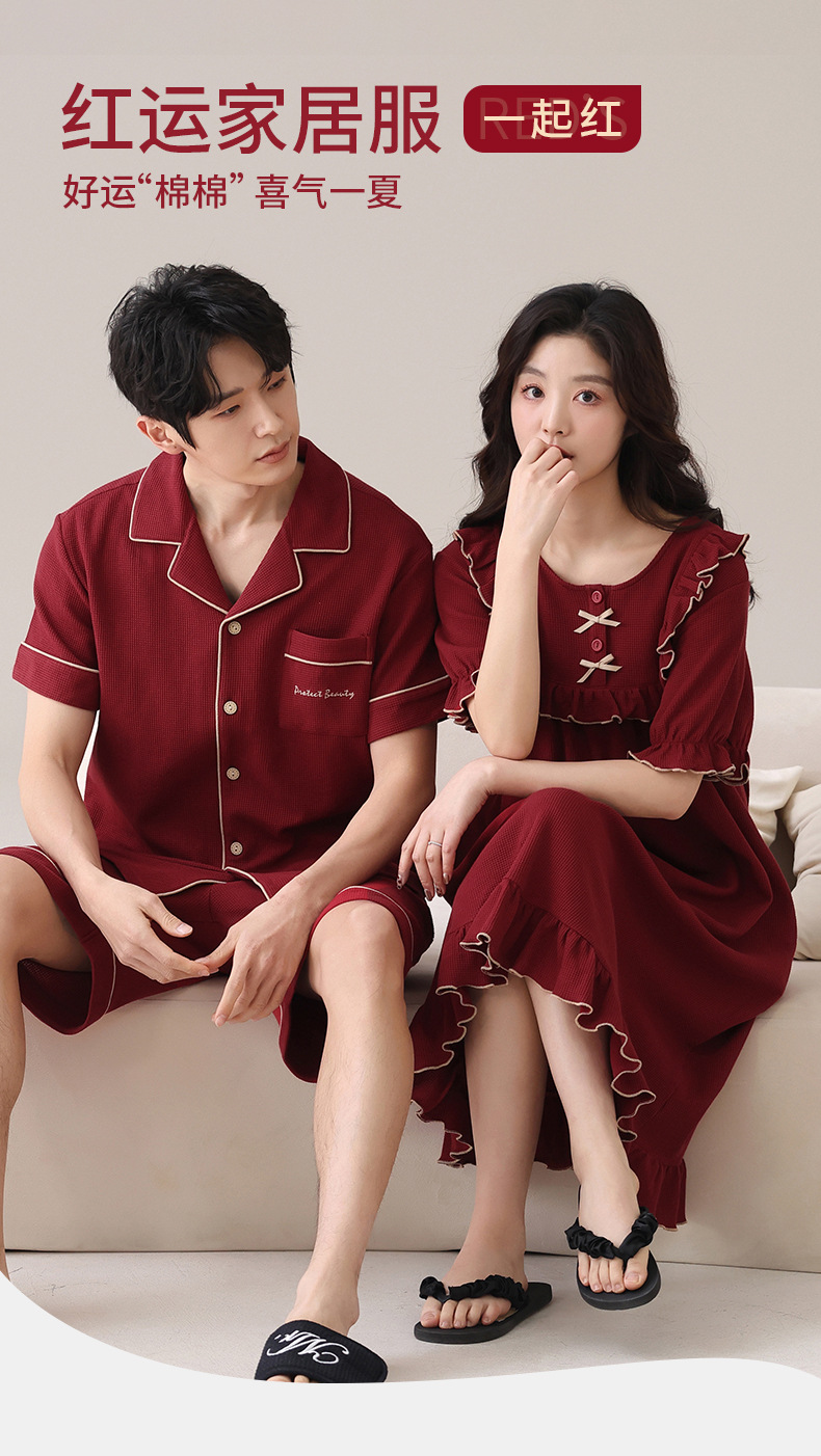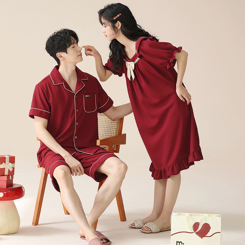 2025 새로운 커플 잠옷 순면 여름 신혼 남성 반팔 세트 레드 여성의 나이트 드레스 웨딩 홈 의류스토어 가기