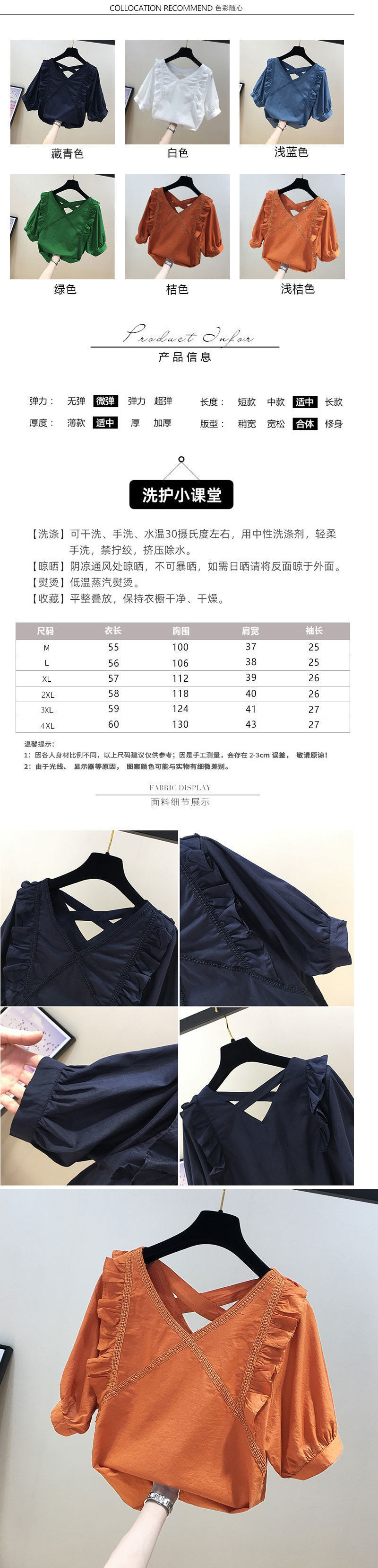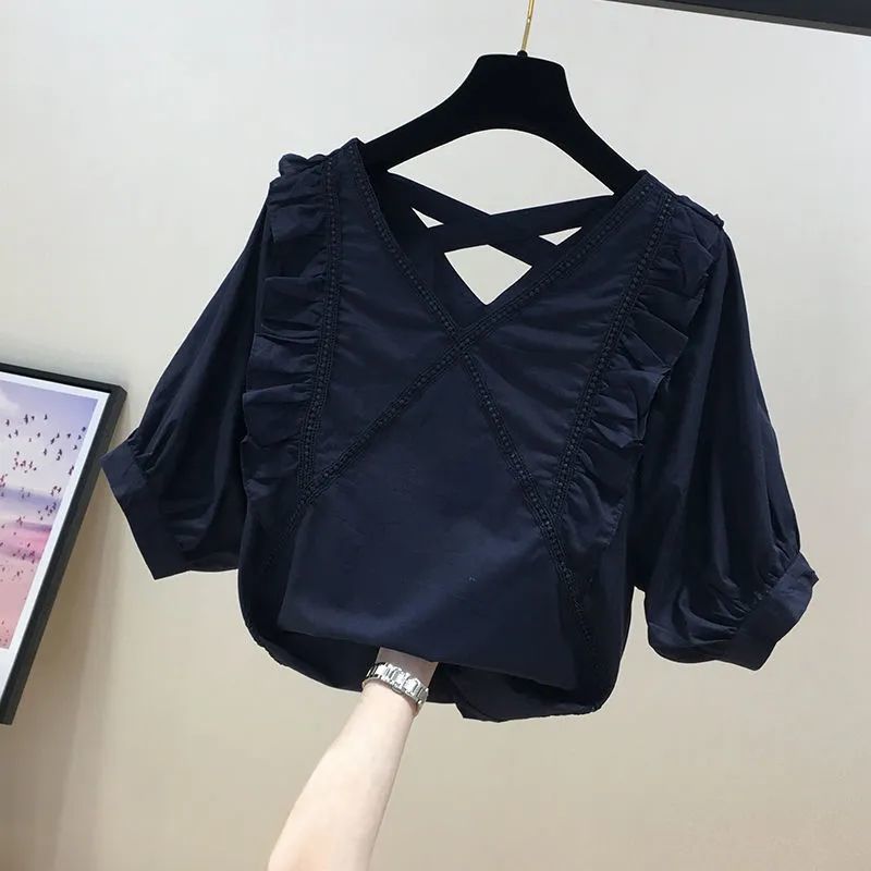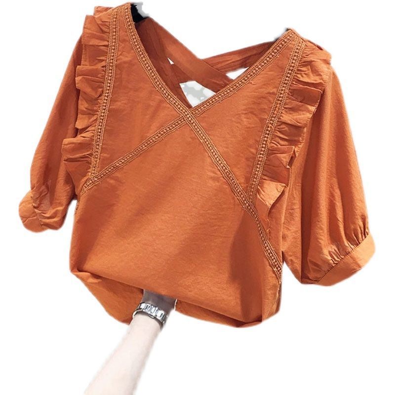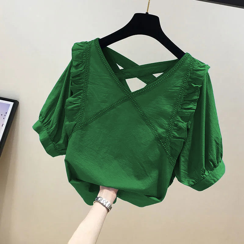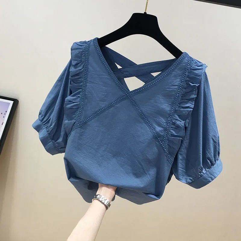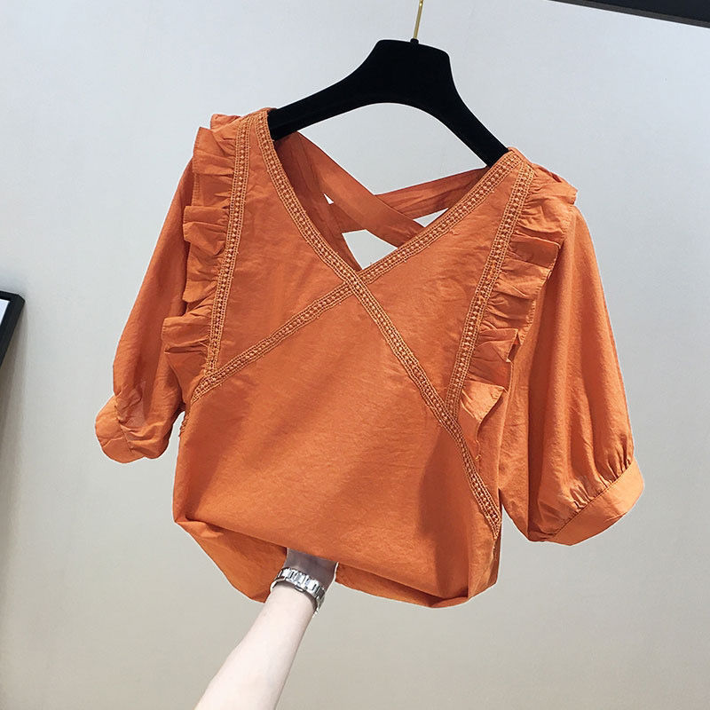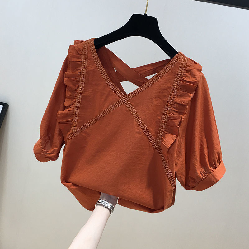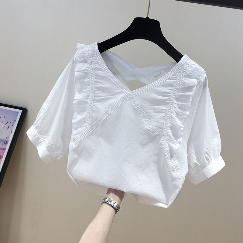 유럽풍 레이스 스플리싱 반팔 쉬폰 셔츠, 여성스럽고 스타일리시한 브이넥 탑, 시크하고 나이를 줄여주는 살을 커버해 날씬해 보이는 셔츠