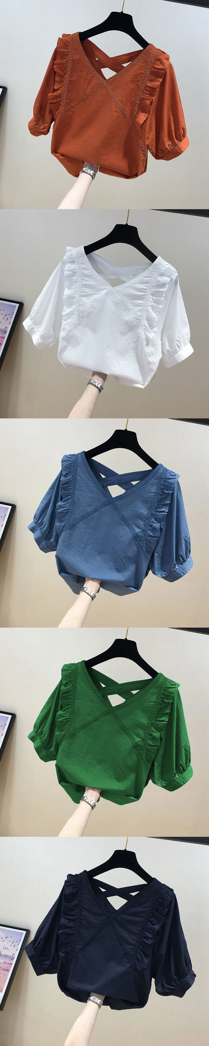 유럽풍 레이스 스플리싱 반팔 쉬폰 셔츠, 여성스럽고 스타일리시한 브이넥 탑, 시크하고 나이를 줄여주는 살을 커버해 날씬해 보이는 셔츠스토어 가기