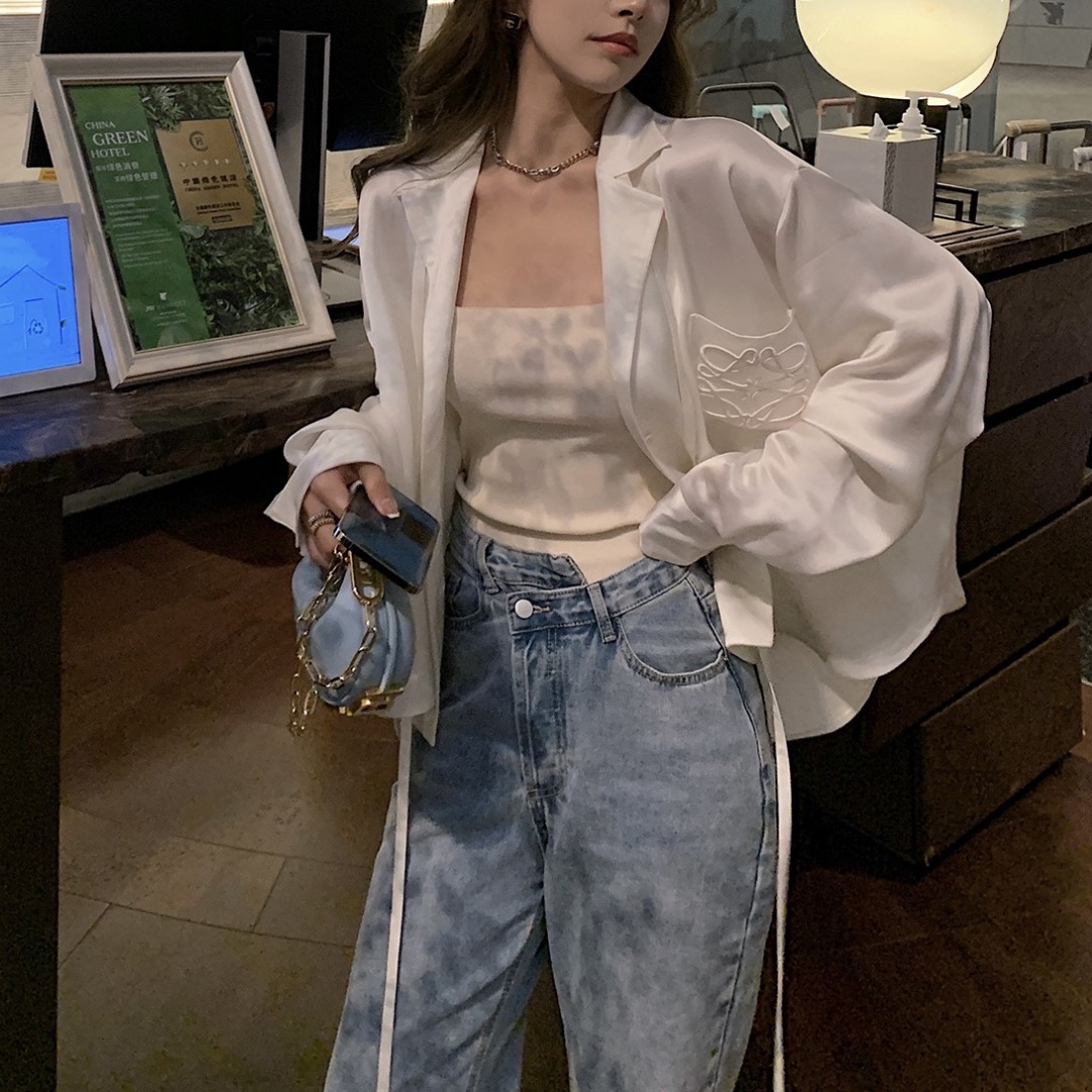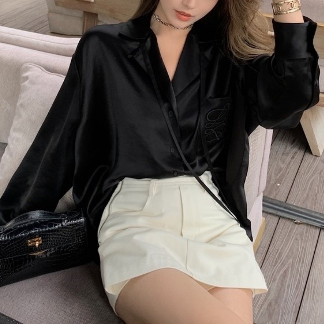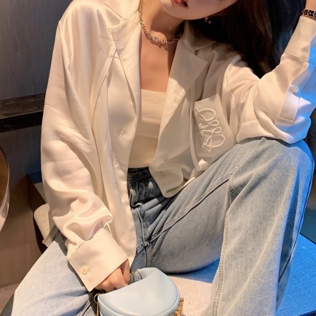 봄 여름 LO*WE 아세테이트 셔츠 여성 고급 새틴 광택 1.8만 바늘 자수 셔츠 가디건스토어 가기