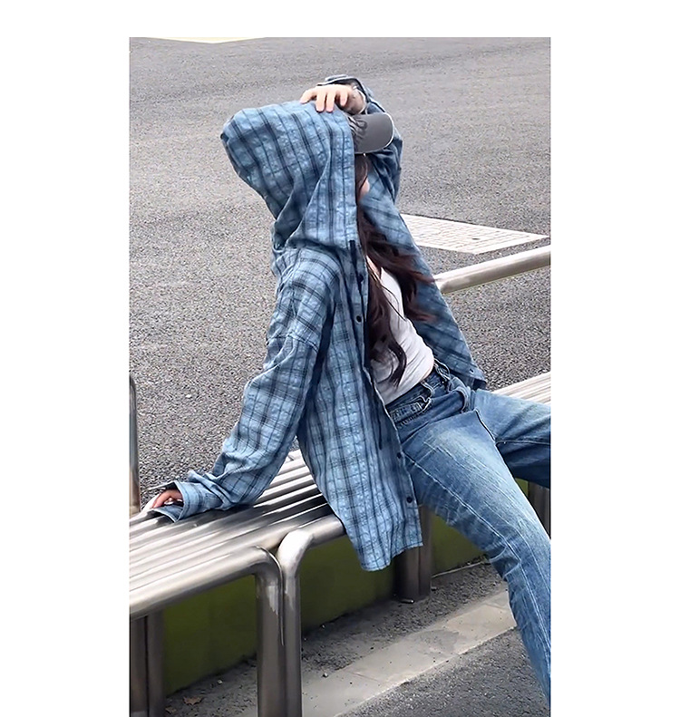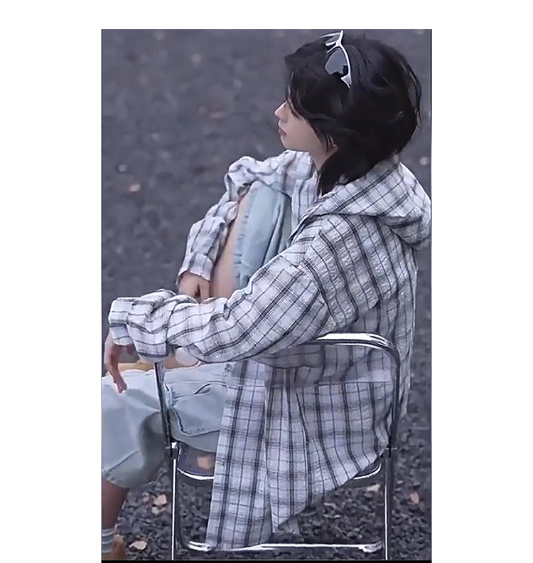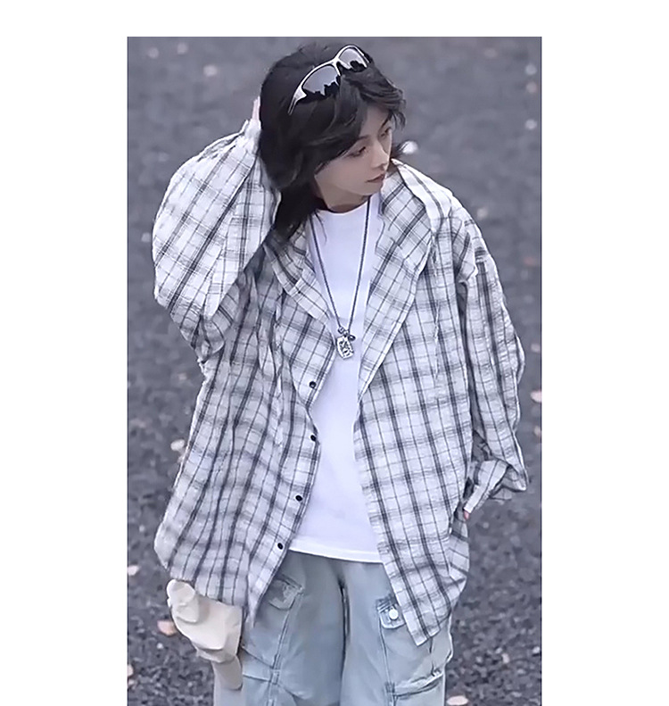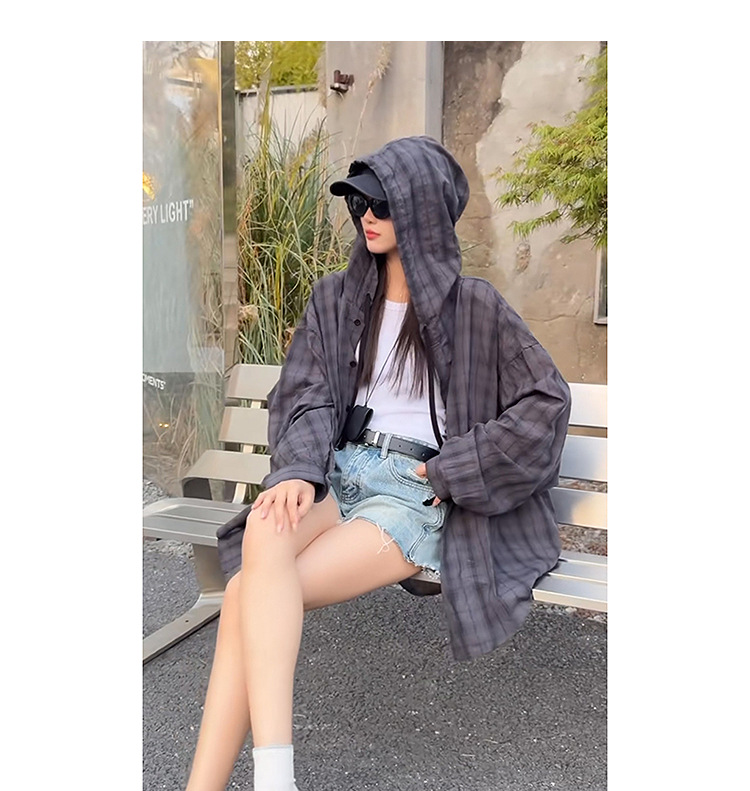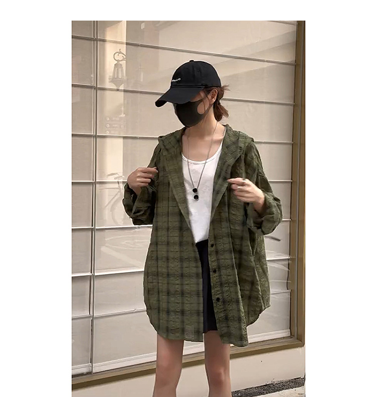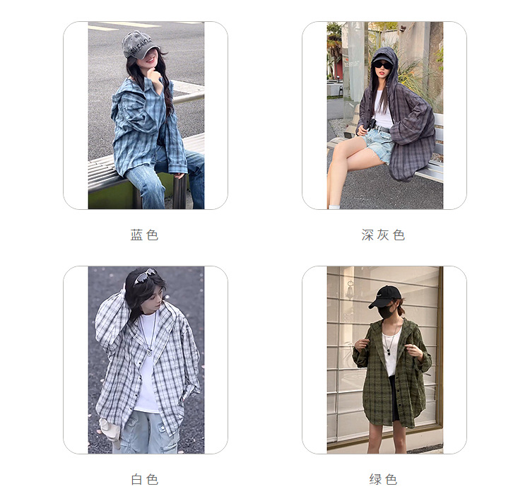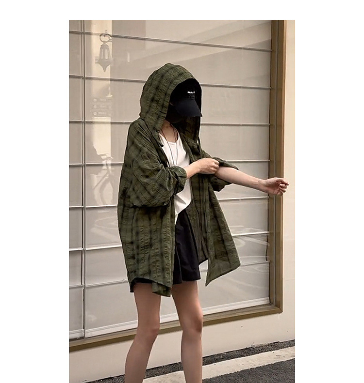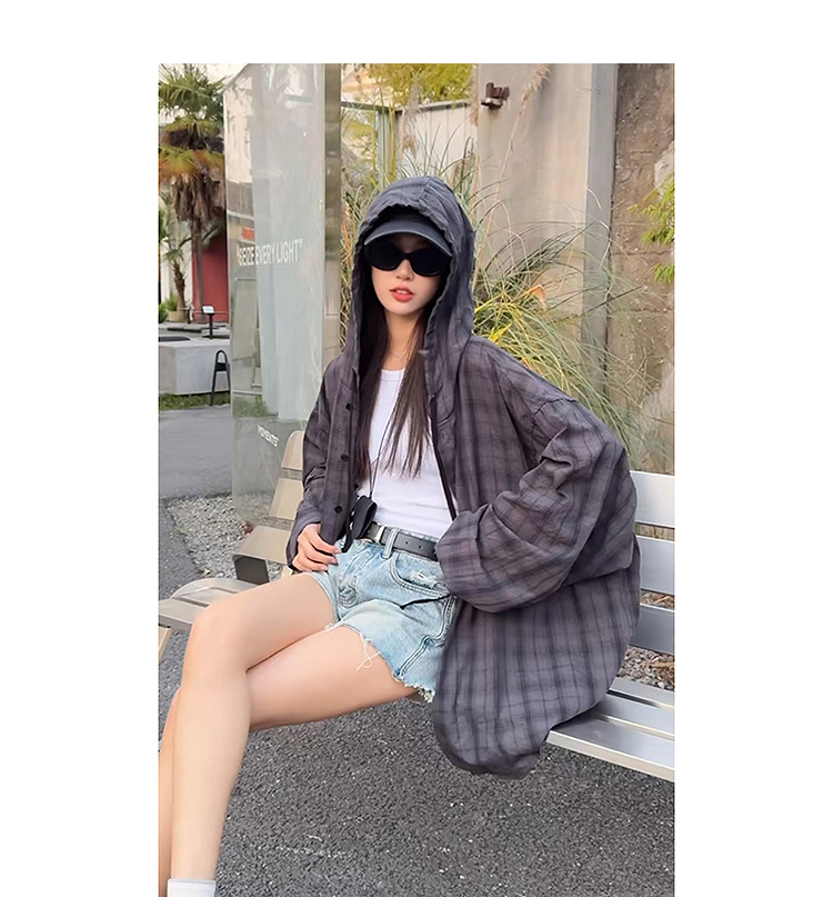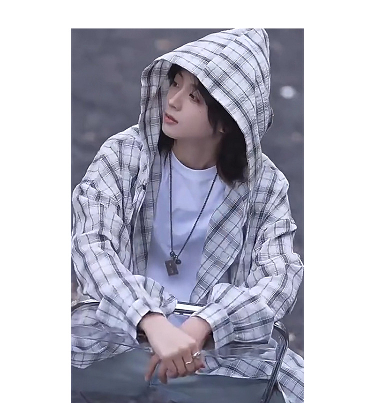 긴 소매 후드 체크 무늬 선스크린 셔츠 남자 여름 복고풍 아이스 실크 빠른 건조 캐주얼 게으른 커플 셔츠 재킷 남자스토어 가기