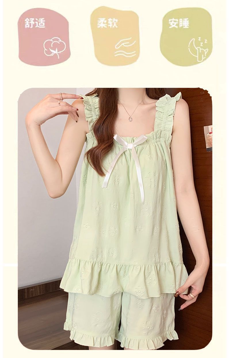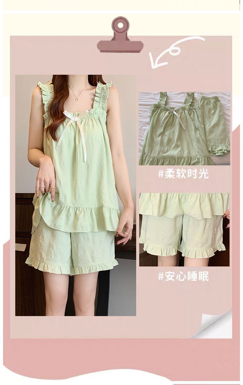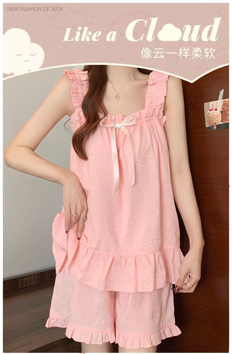 여름 새로운 달콤한 인터넷 연예인 구름 코튼 벨트 가슴 패드 슬링 파자마 여성 느슨한 외투 홈 의류 세트스토어 가기
