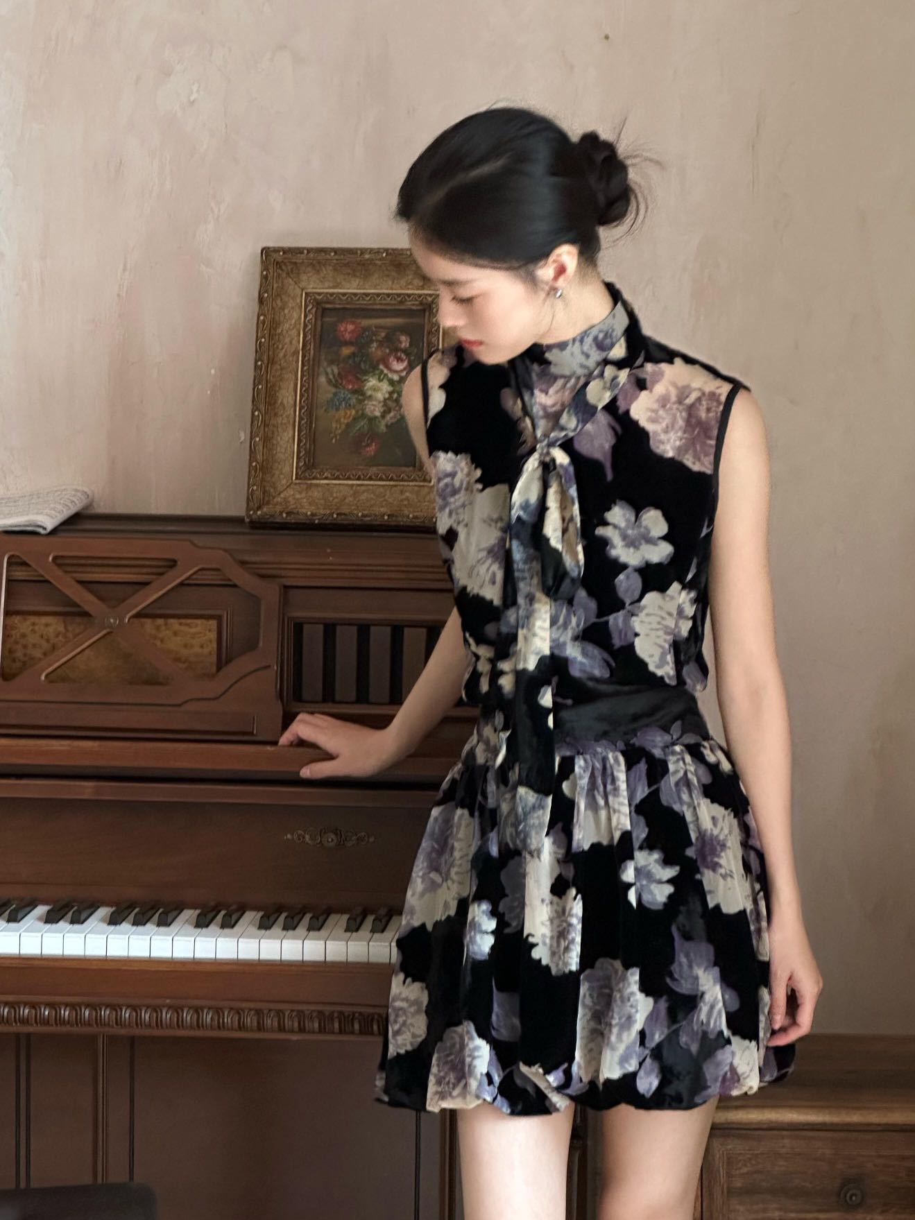 2026 봄 여름 신상 프렌치 스타일 레트로 블랙 쉬폰 허리라인 꽃무늬 셔츠와 활용도 높은 스커트 세트 여성용스토어 가기