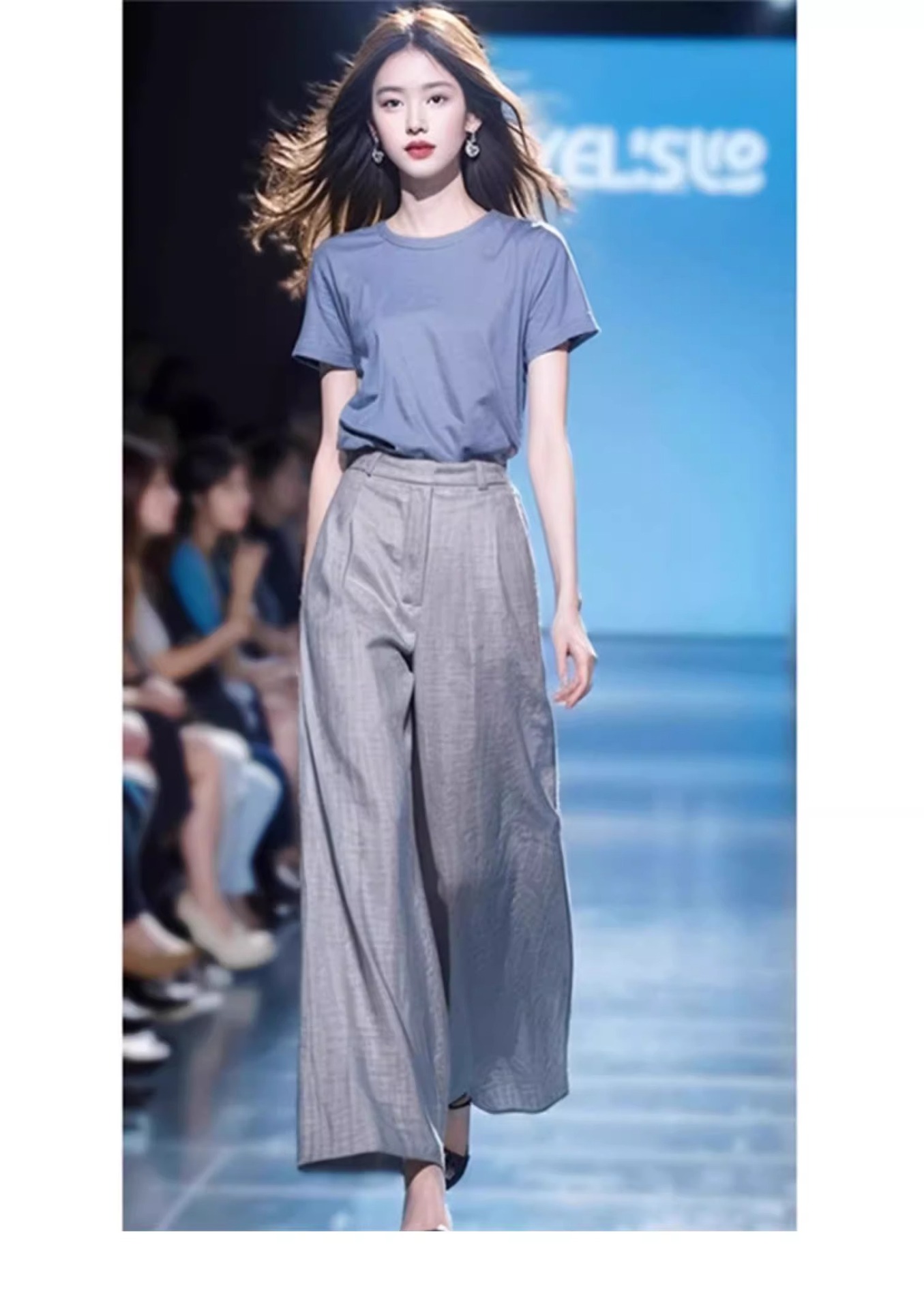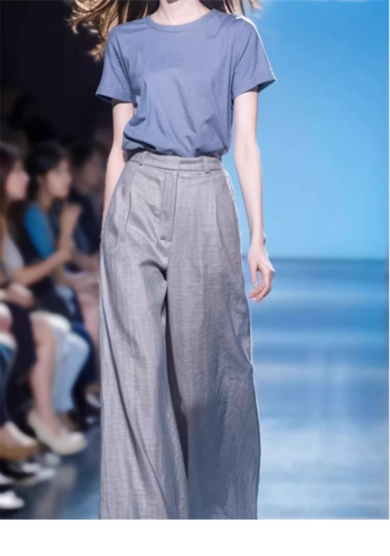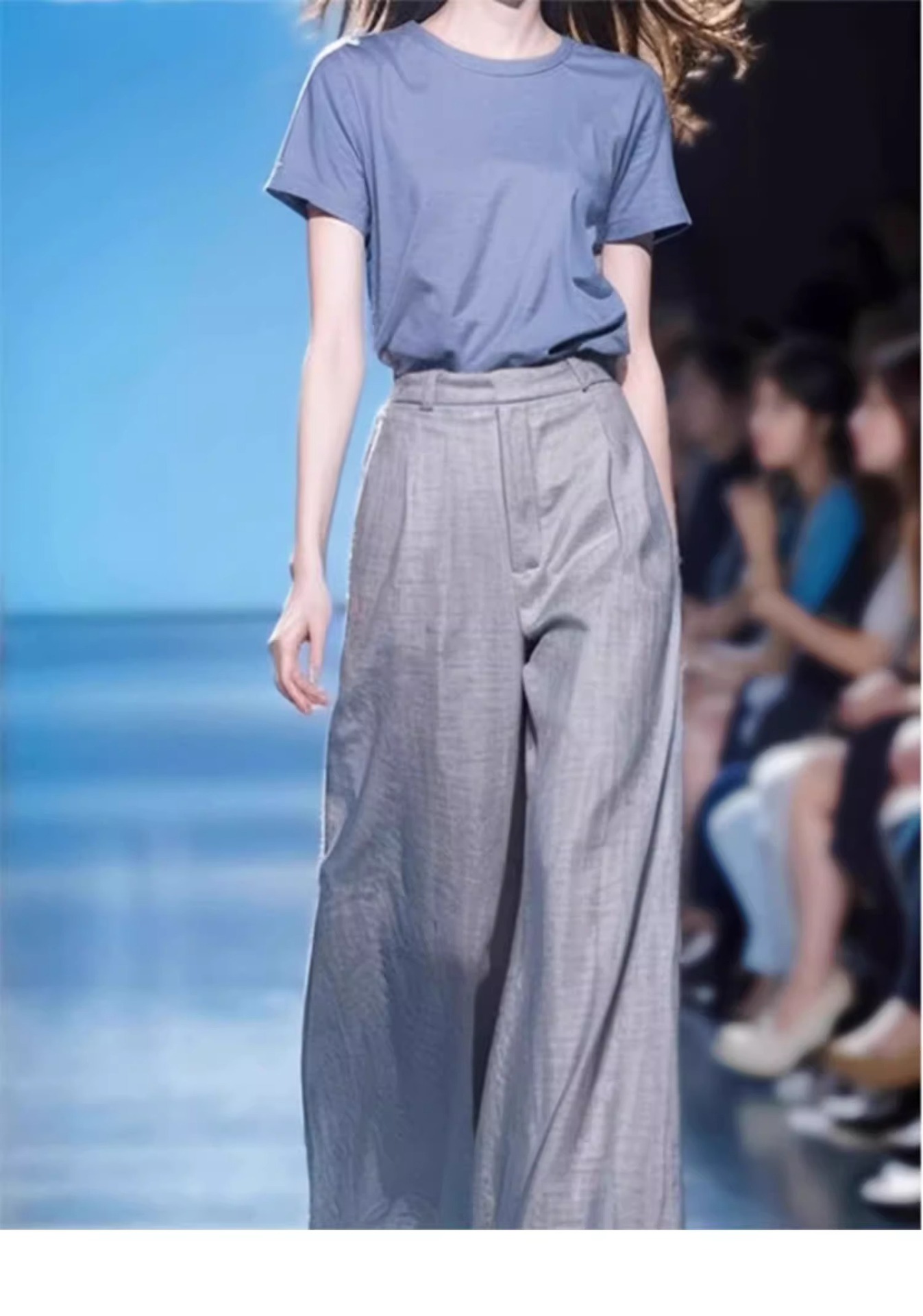 소금 스타일 라이트 성숙한 바람 A와 Sa 간단한 패션 서양식 시대 감소 블루 반팔 최고 캐주얼 세트 바지 여름 여성