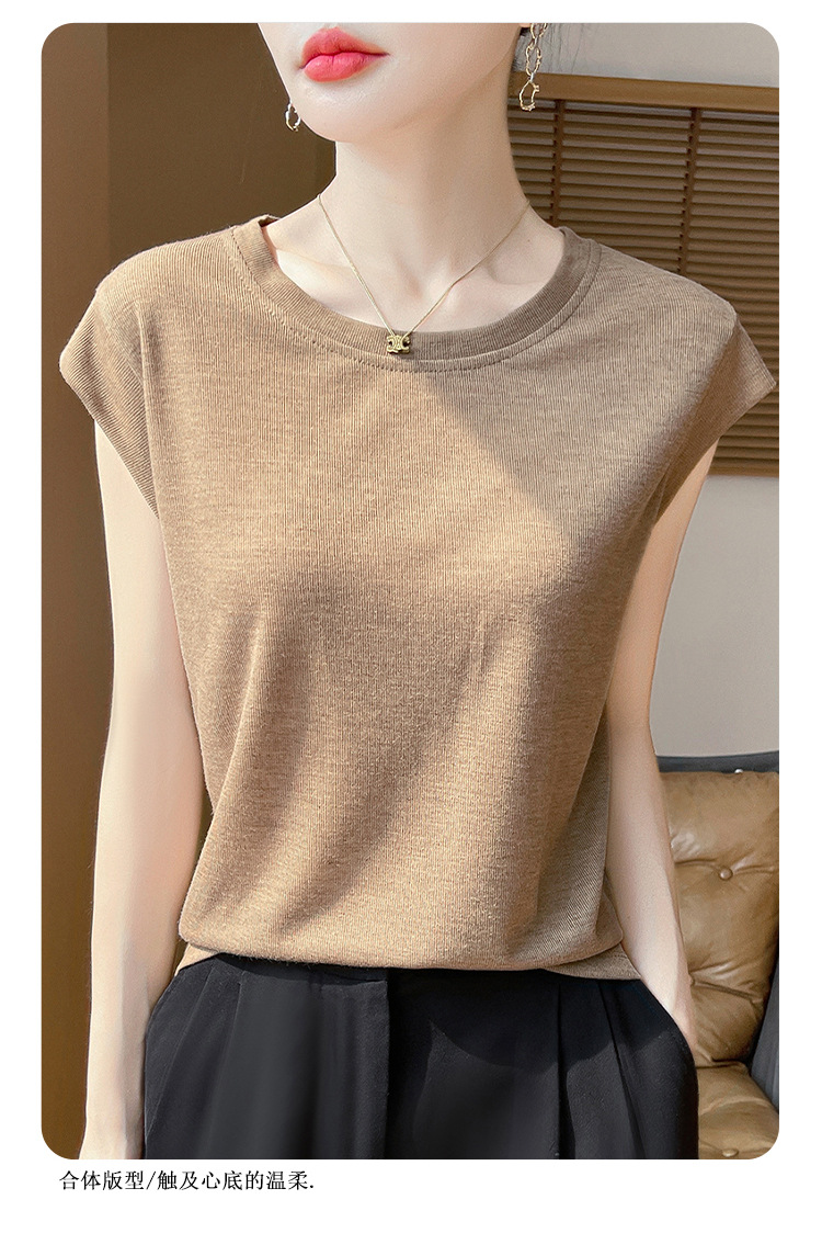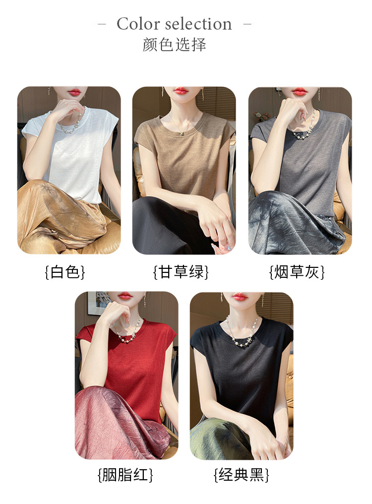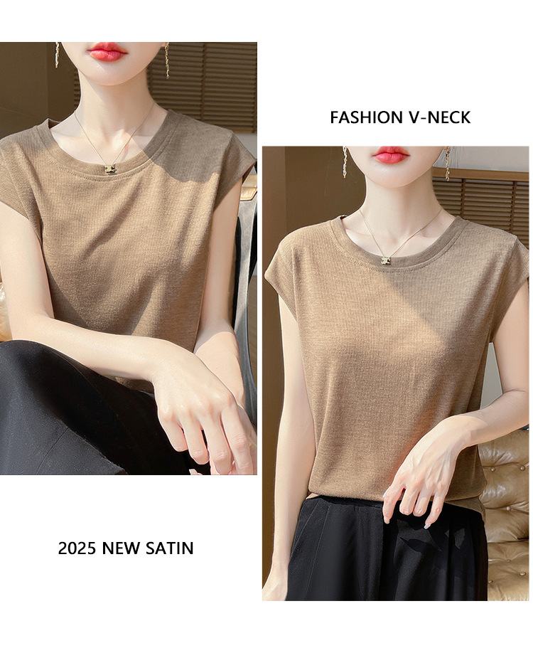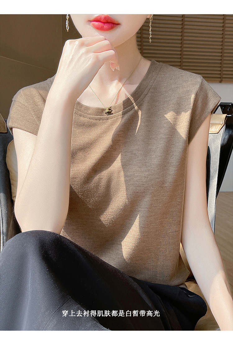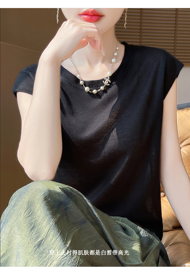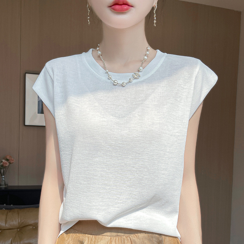 2025 년 여름 새로운 Lyocell 혼합 풀오버 솔리드 컬러베이스 경량 라운드 넥 니트 작은 플라잉 슬리브 반팔 티셔츠