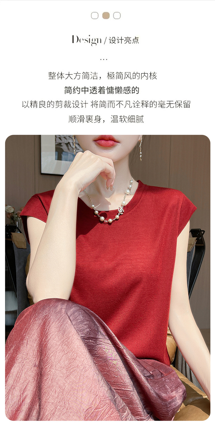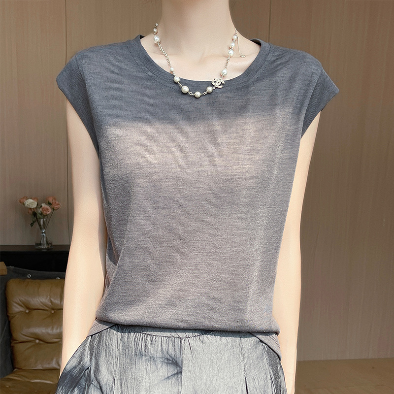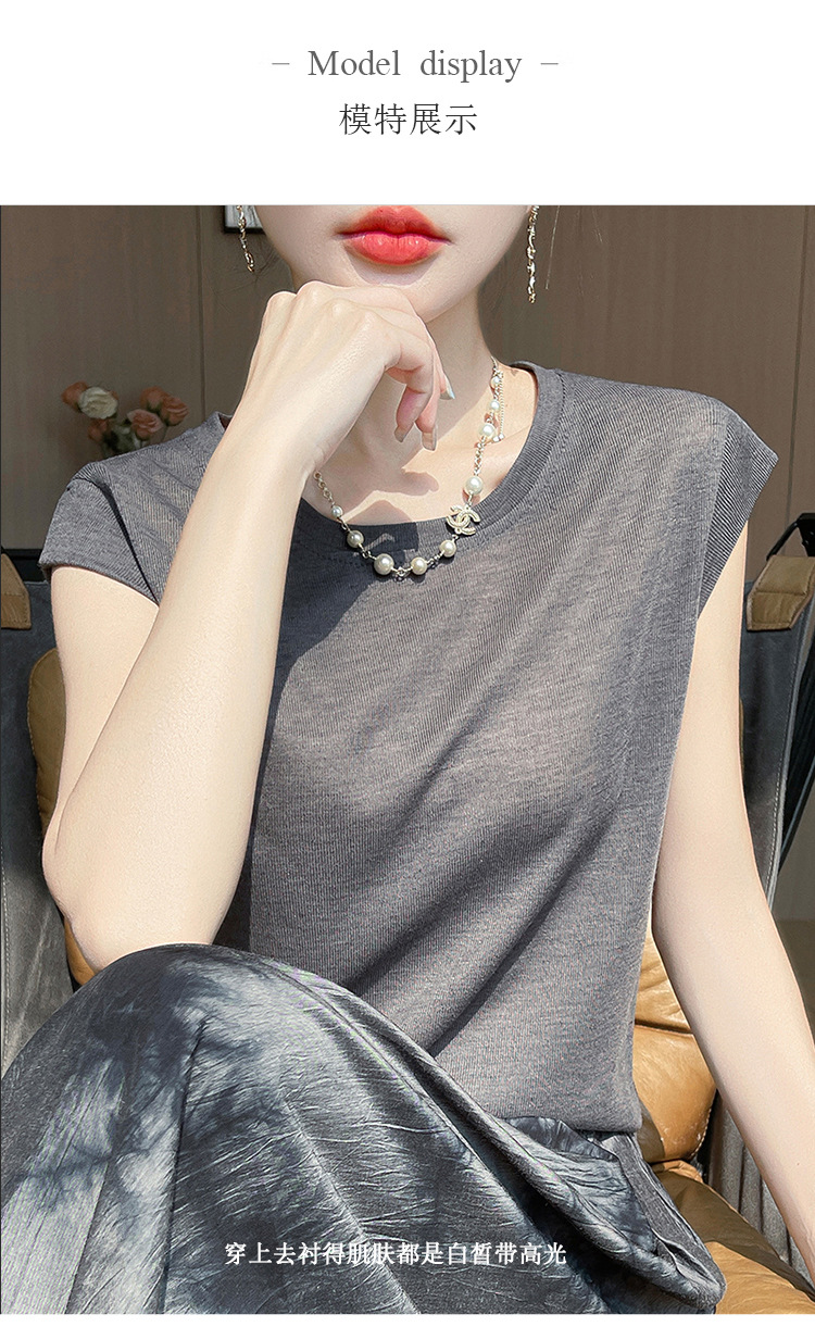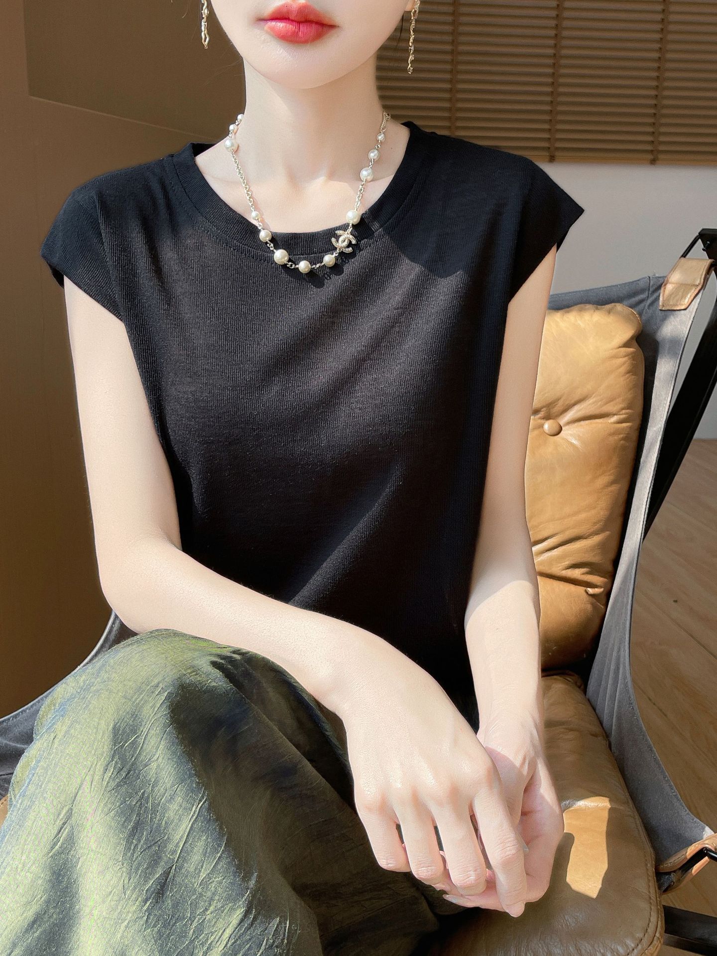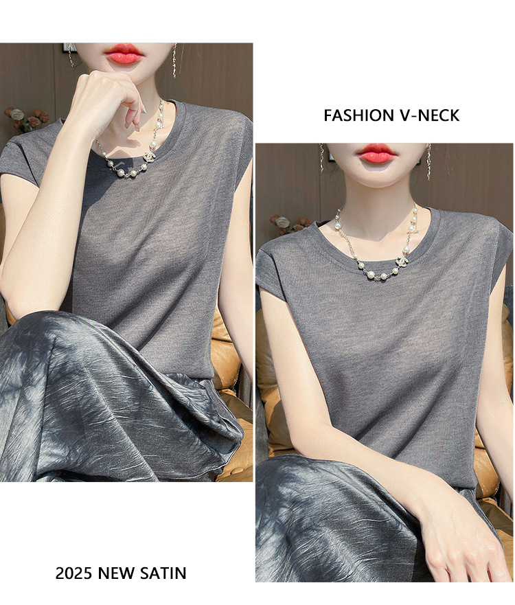 2025 년 여름 새로운 Lyocell 혼합 풀오버 솔리드 컬러베이스 경량 라운드 넥 니트 작은 플라잉 슬리브 반팔 티셔츠