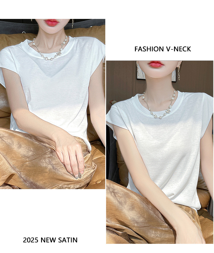 2025 년 여름 새로운 Lyocell 혼합 풀오버 솔리드 컬러베이스 경량 라운드 넥 니트 작은 플라잉 슬리브 반팔 티셔츠스토어 가기