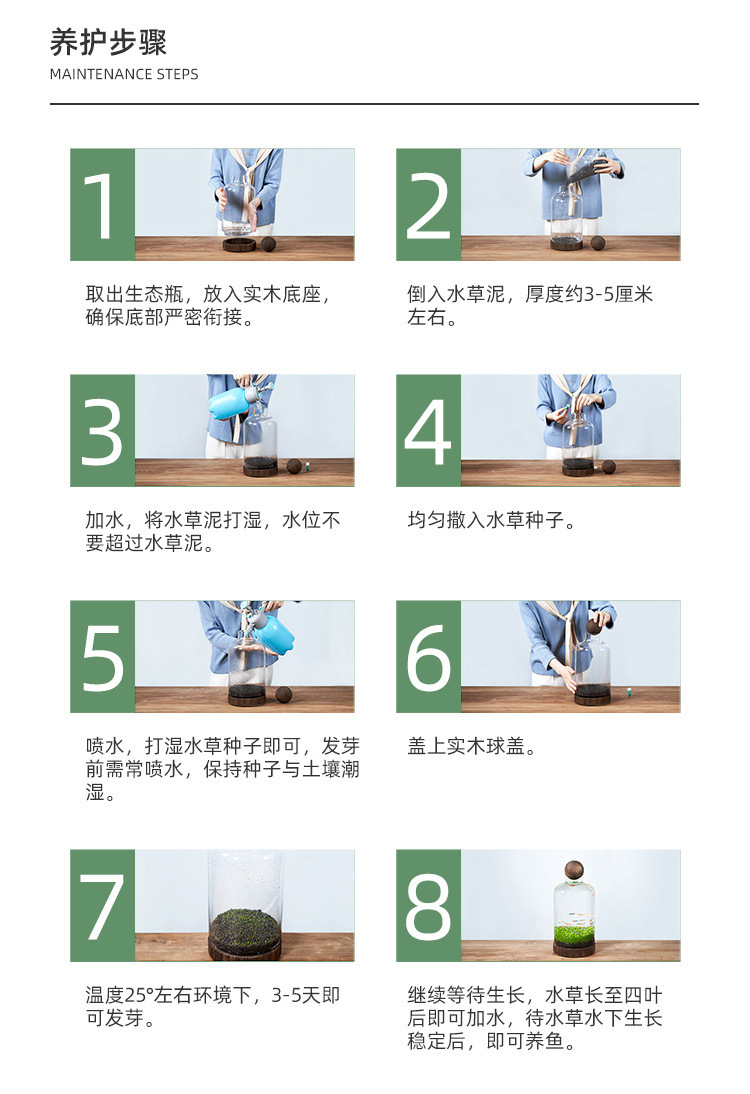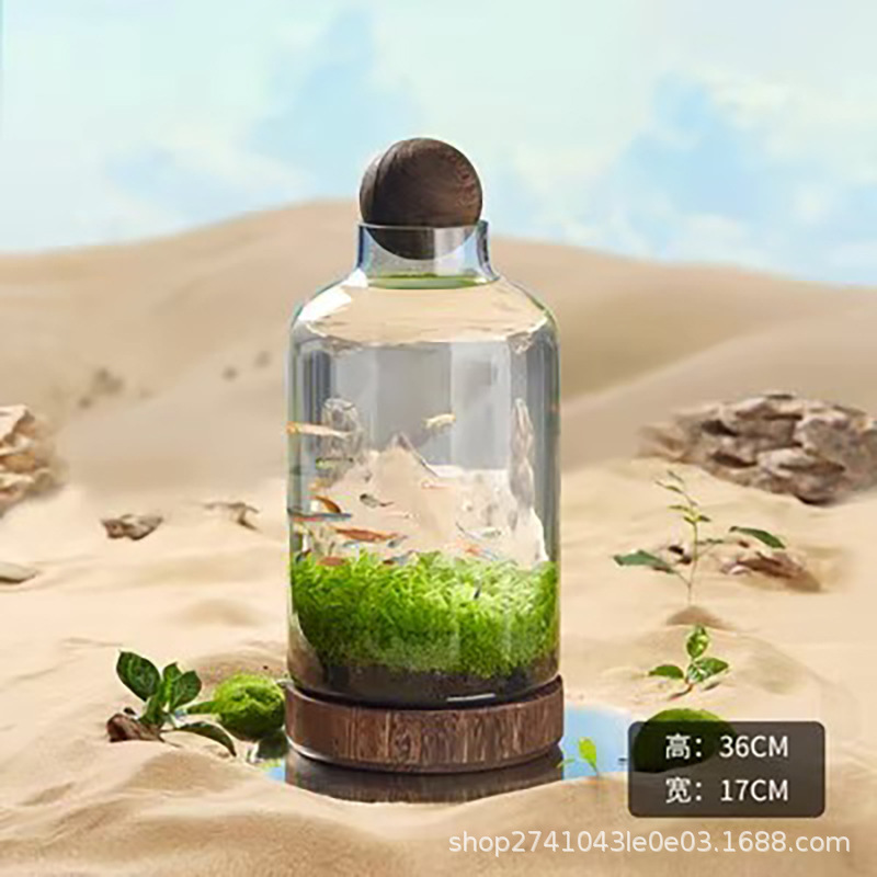 새로운 투명 생태 유리 어항, 두꺼운 유리 어항, 나무 받침대와 나무 공이 있는 생태병, 고급스러운 도매스토어 가기