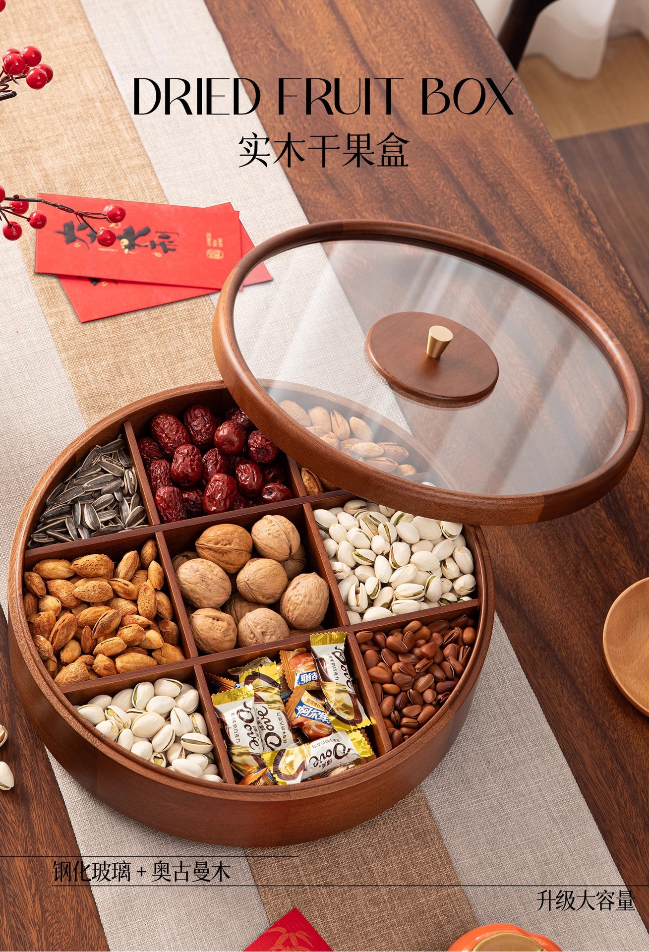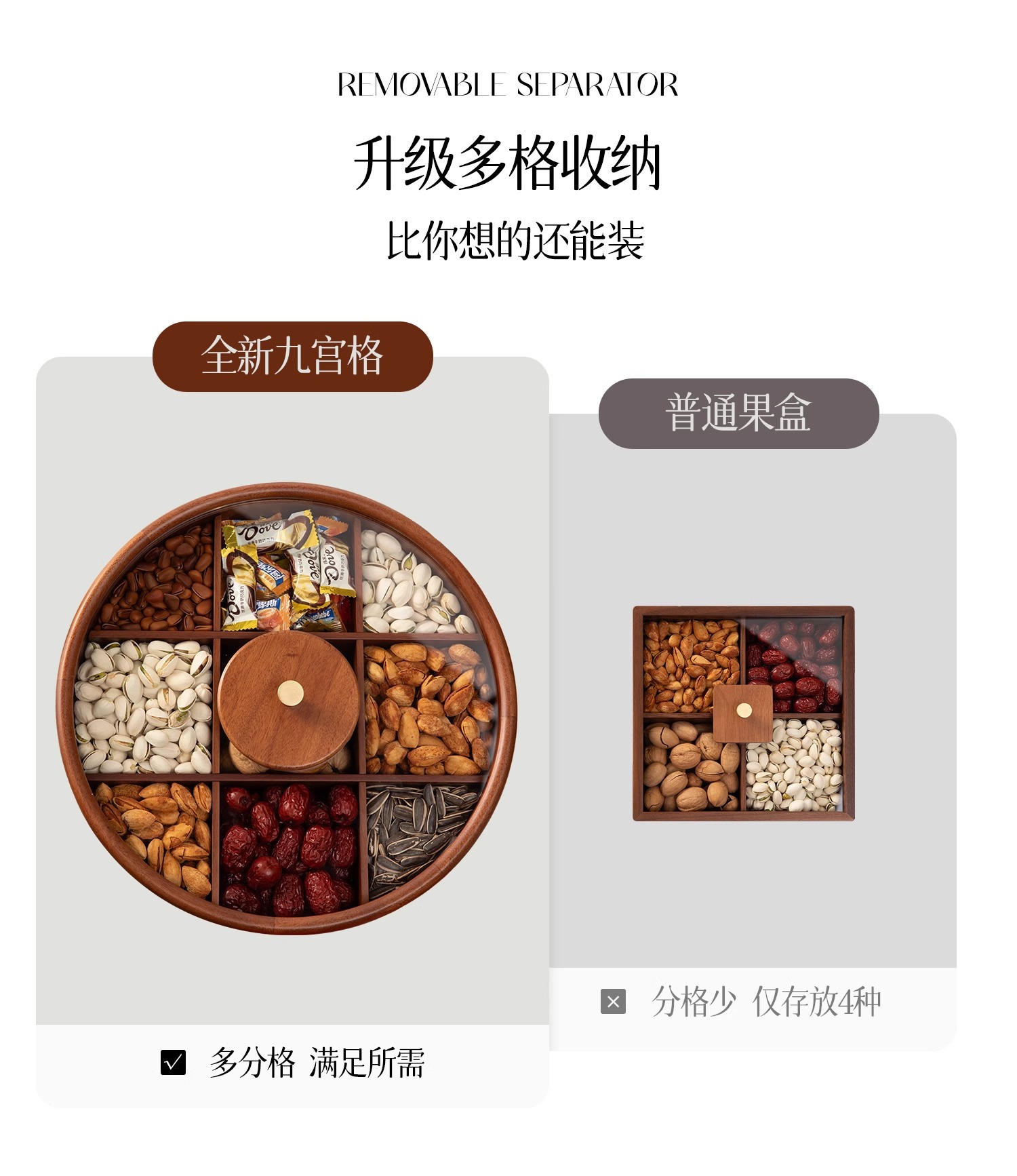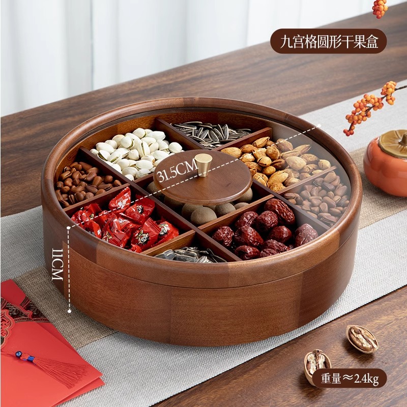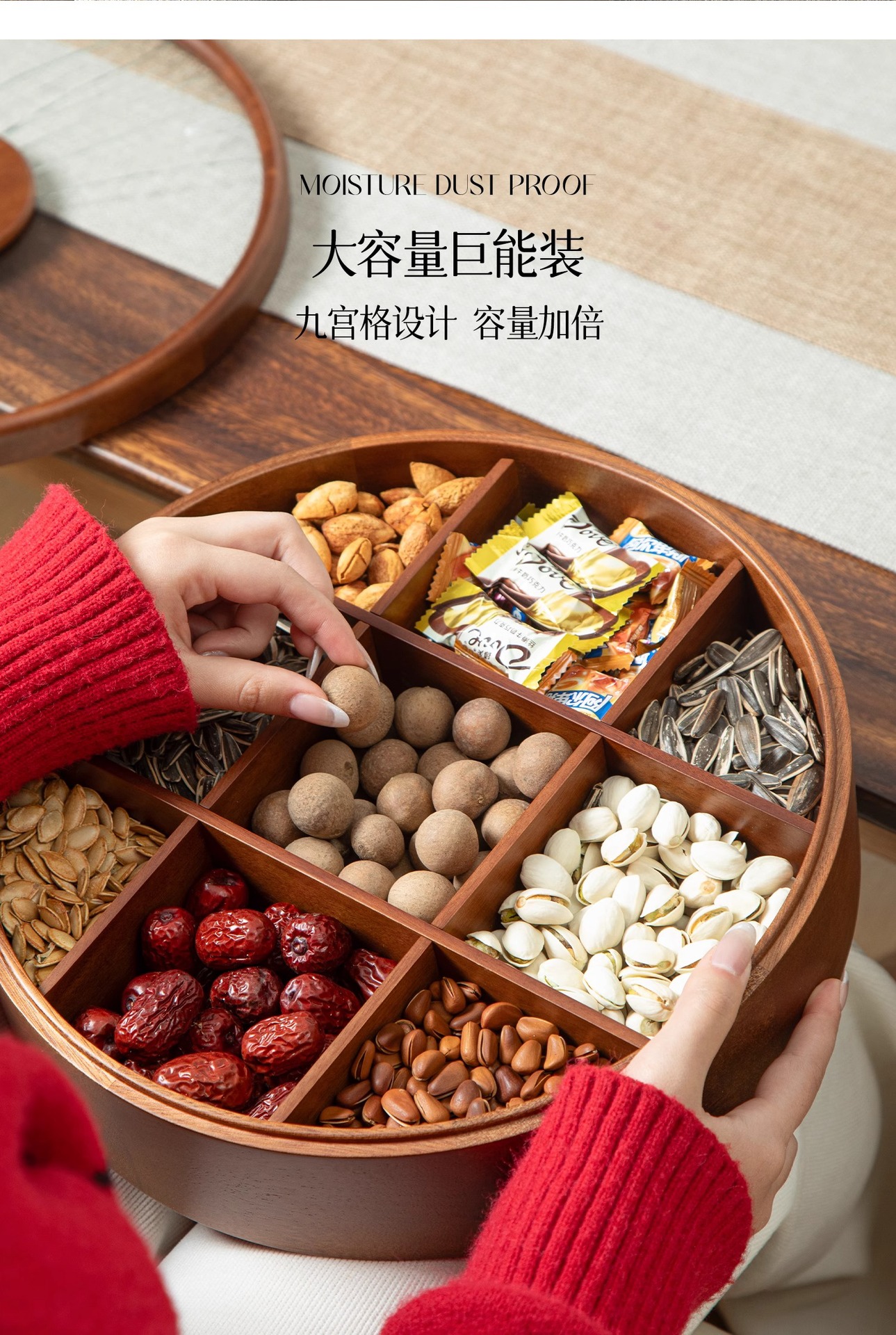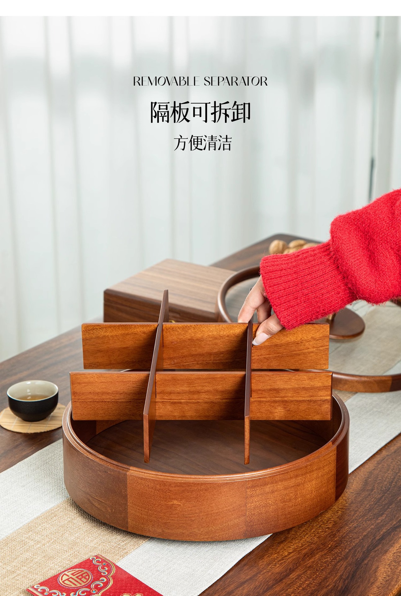 가정용 말린 과일 스낵 과일 접시, 오르가움 나무 원형 고급 클래식 새로운 중국 스타일의 Jiugongge 과일 접시 상자스토어 가기