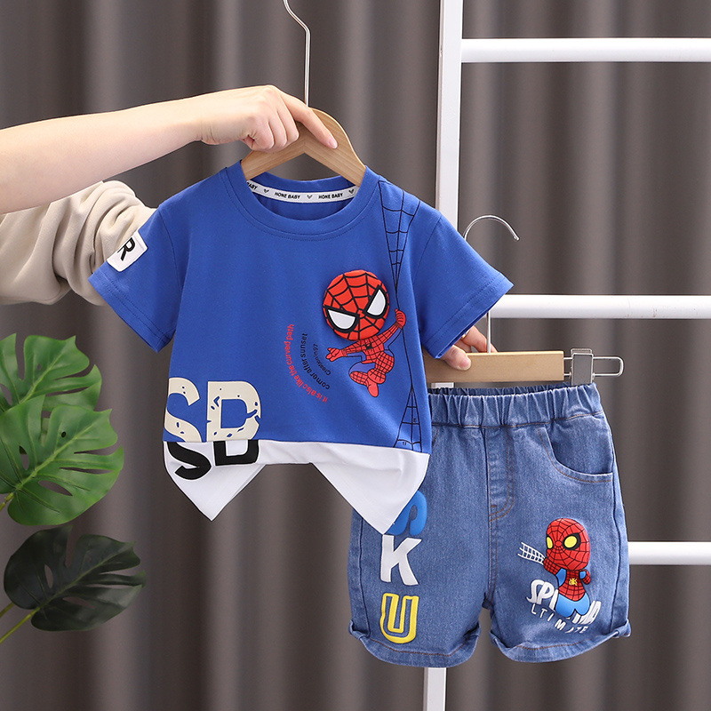 여름 콘트라스트 컬러 아동복 남성 아기 만화 세트 반팔 티셔츠 한국식 스티칭 콘트라스트 컬러 캐주얼 투피스