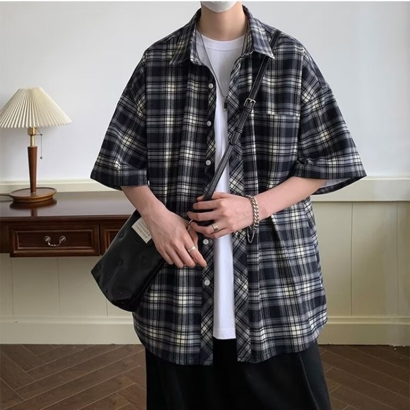빈티지 거리 격자 무늬 짧은 소매 셔츠 남성과 여성 여름 트렌디 한 십대 클린 핏 루즈 캐주얼 셔츠 재킷