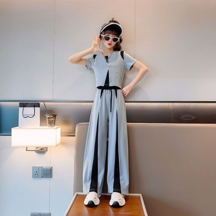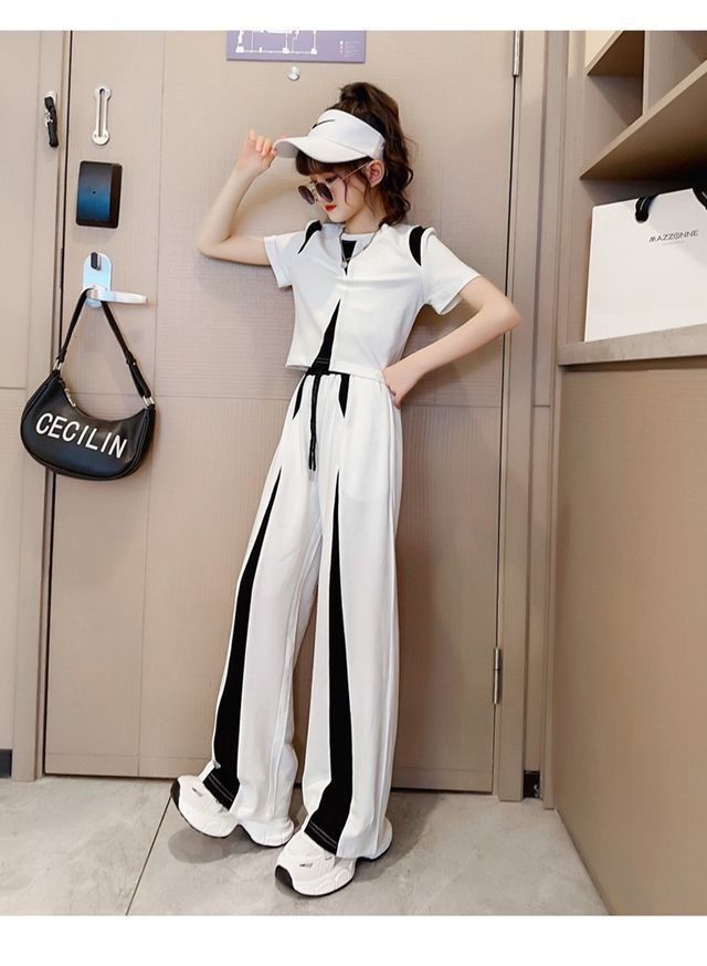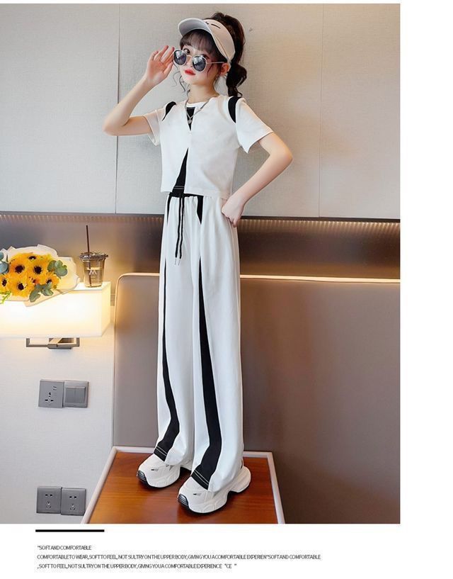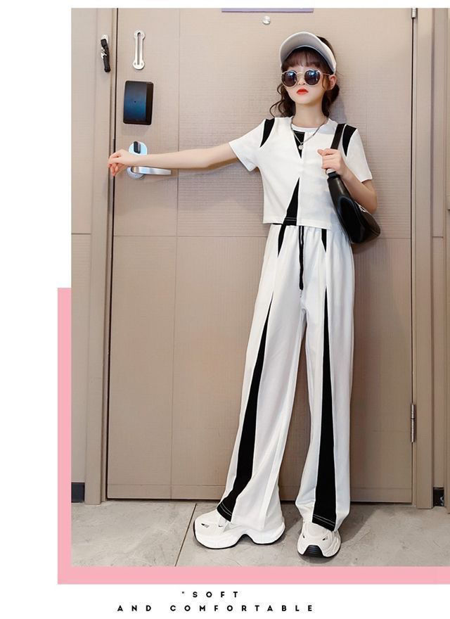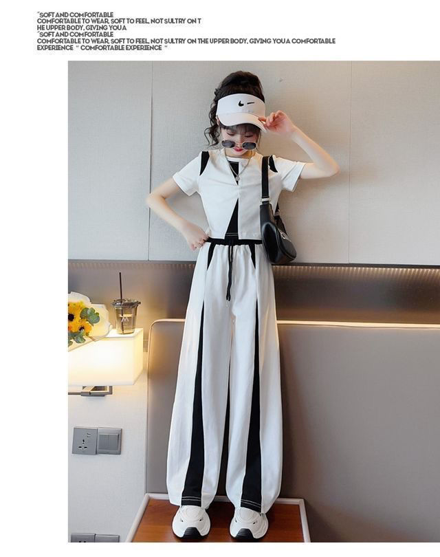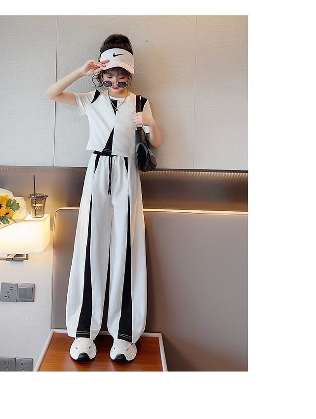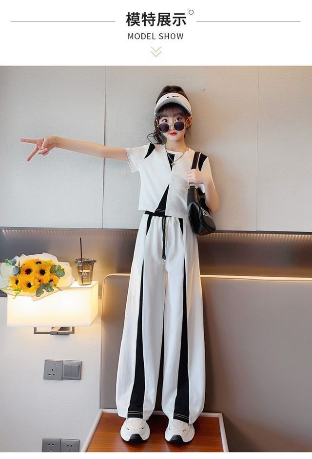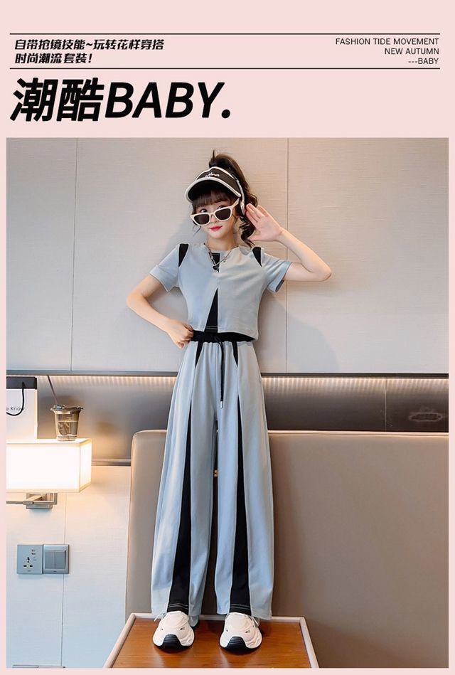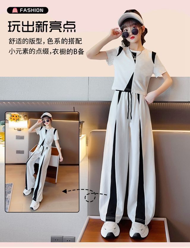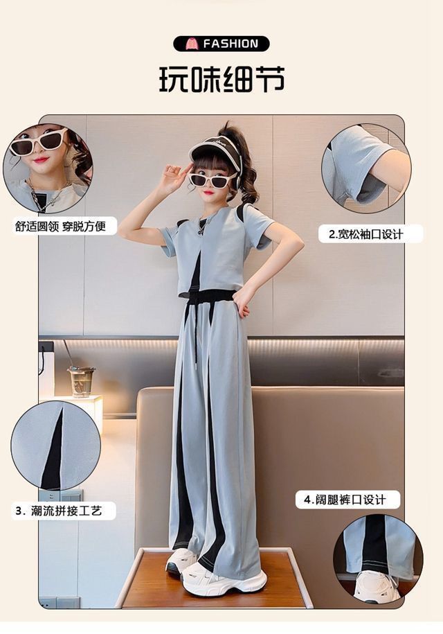 여자 여름 정장 2025 새로운 스타일 중대형 어린이 스타일 스플 라이스 느슨한 와이드 레그 팬츠 캐주얼 라운드 넥 티셔츠 정장스토어 가기