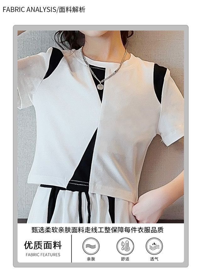 여자 여름 정장 2025 새로운 스타일 중대형 어린이 스타일 스플 라이스 느슨한 와이드 레그 팬츠 캐주얼 라운드 넥 티셔츠 정장