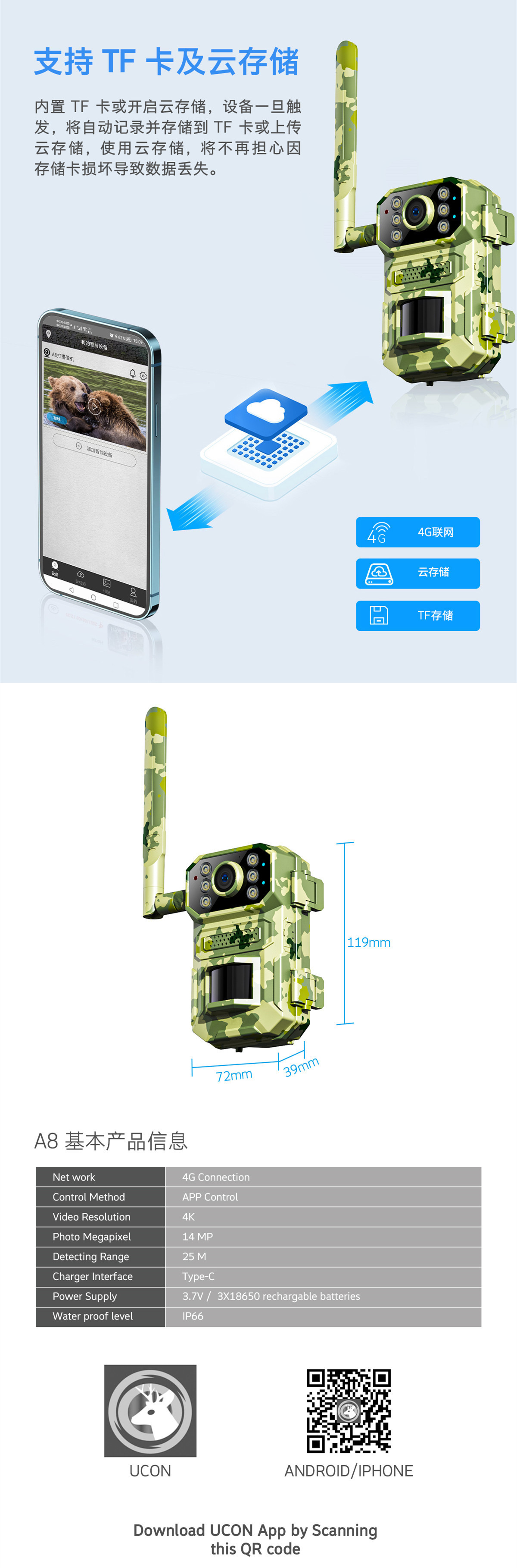 存储:支持 SD Card 4GB-64GB 及 云存储(不含卡)