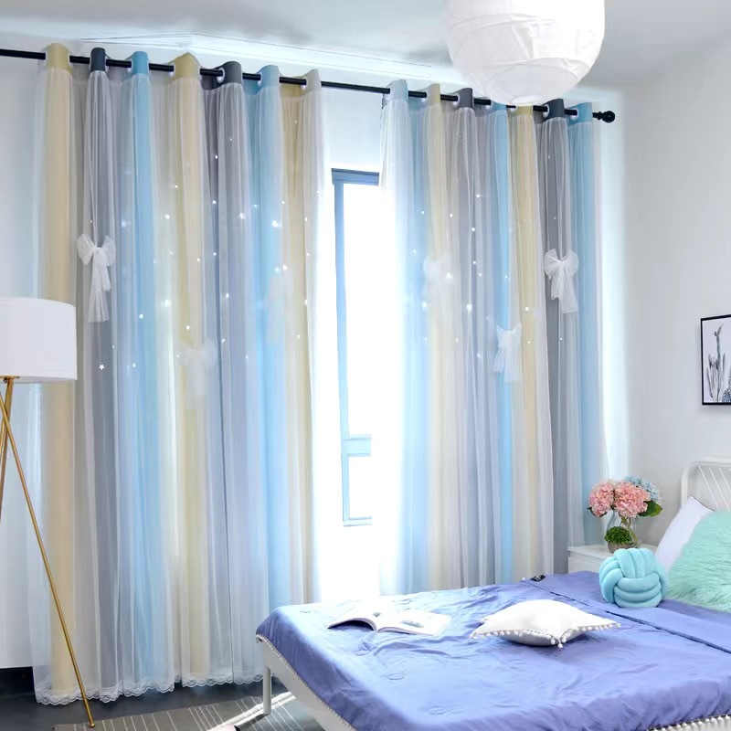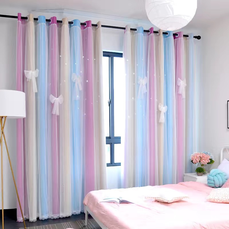 인터넷 연예인 공주 스타일 소녀 방 커튼 침실 차광 중공 별 발코니 베드 창 이중 레이어 천 원사 통합