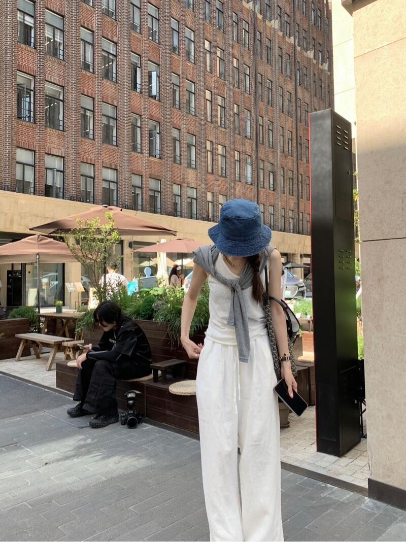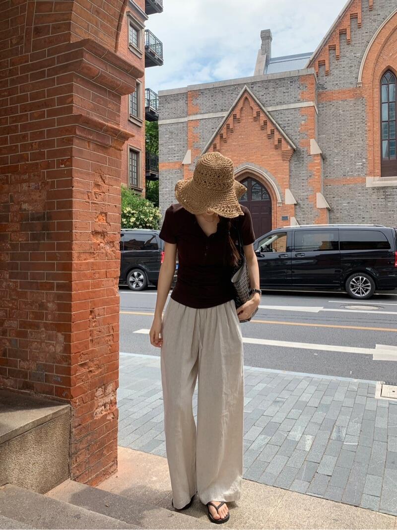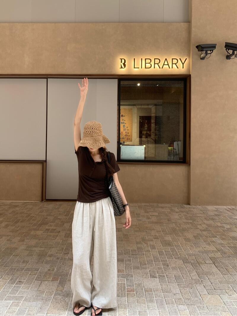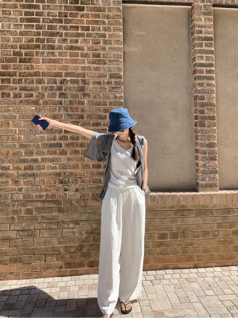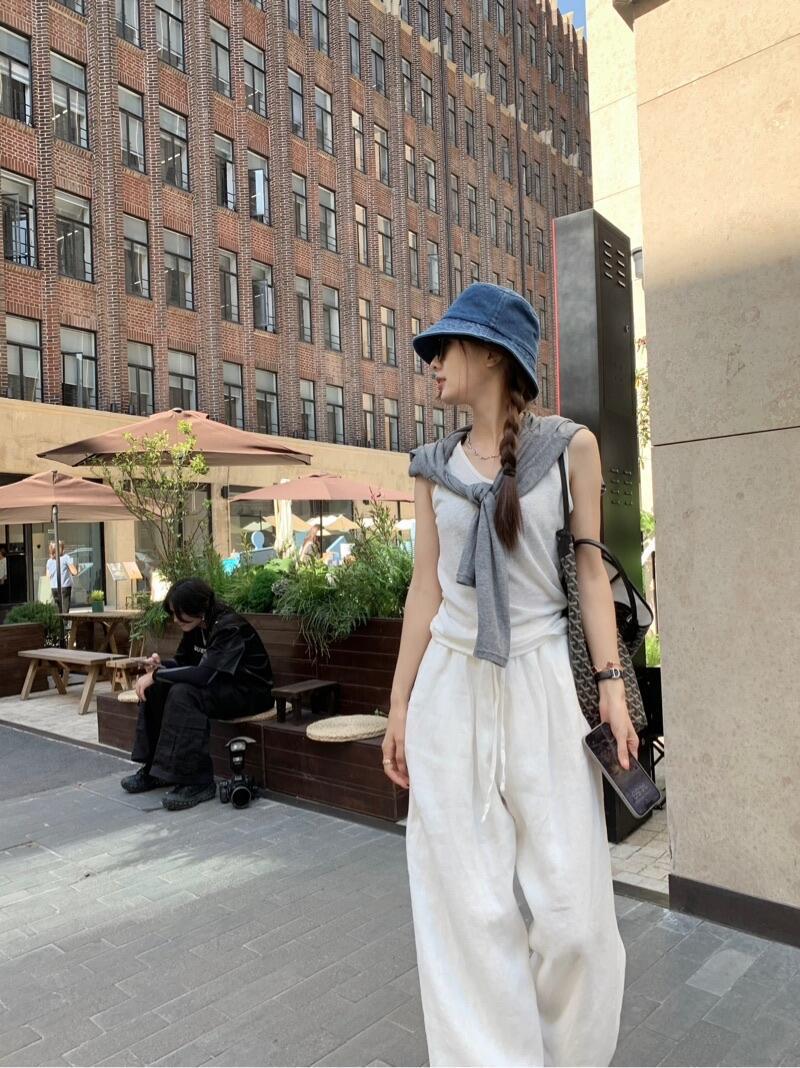 Linen Pants 불투과성 라이닝 디자인 느슨한 허리 레이스 업 미니멀리스트 바지 고층 화이트 코튼 리넨 캐주얼 바지스토어 가기
