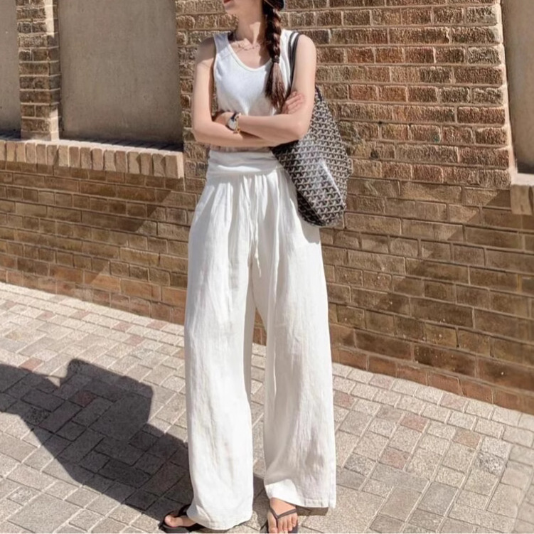 Linen Pants 불투과성 라이닝 디자인 느슨한 허리 레이스 업 미니멀리스트 바지 고층 화이트 코튼 리넨 캐주얼 바지