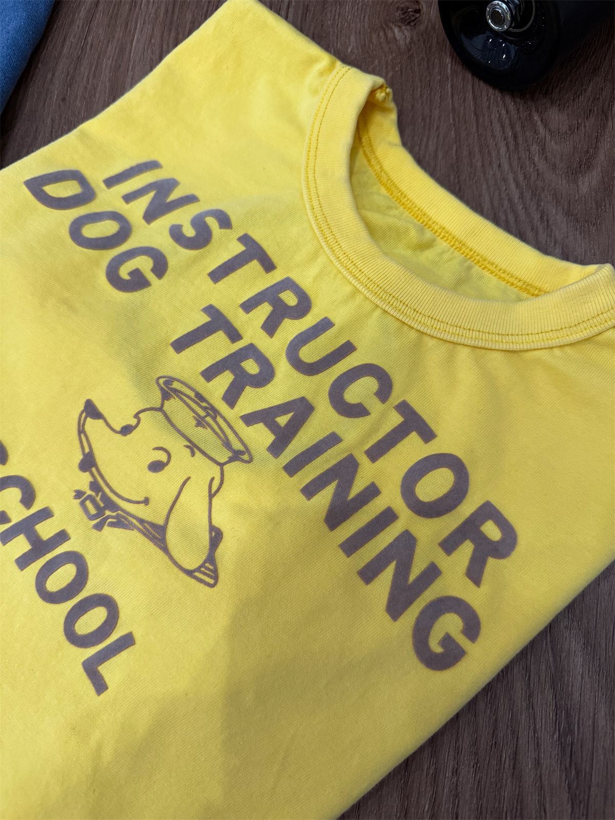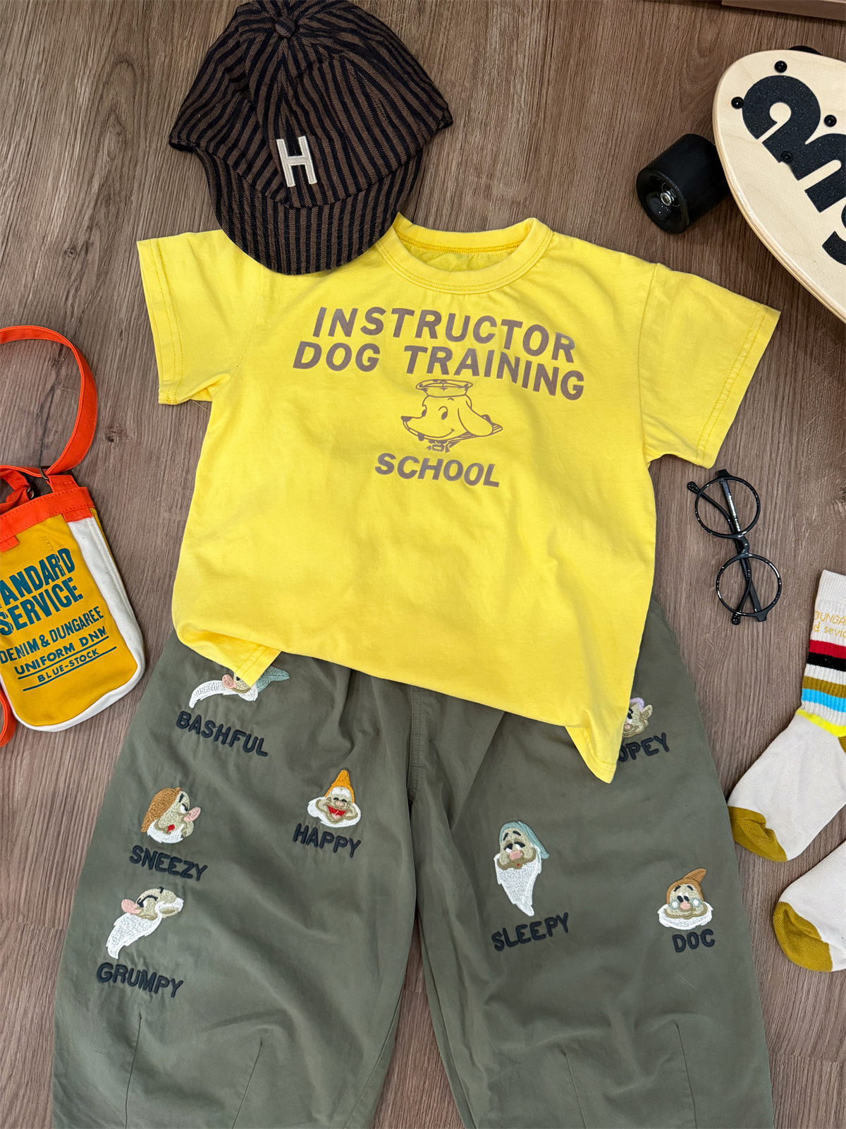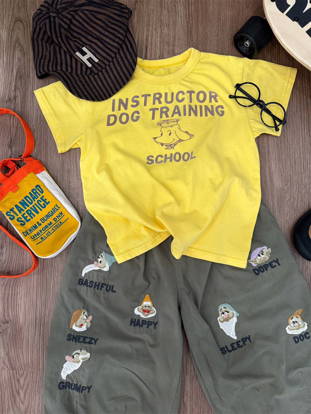 • 노란색 개 머리 티셔츠(튀긴 색상과 디스트레스드 플록 자수)