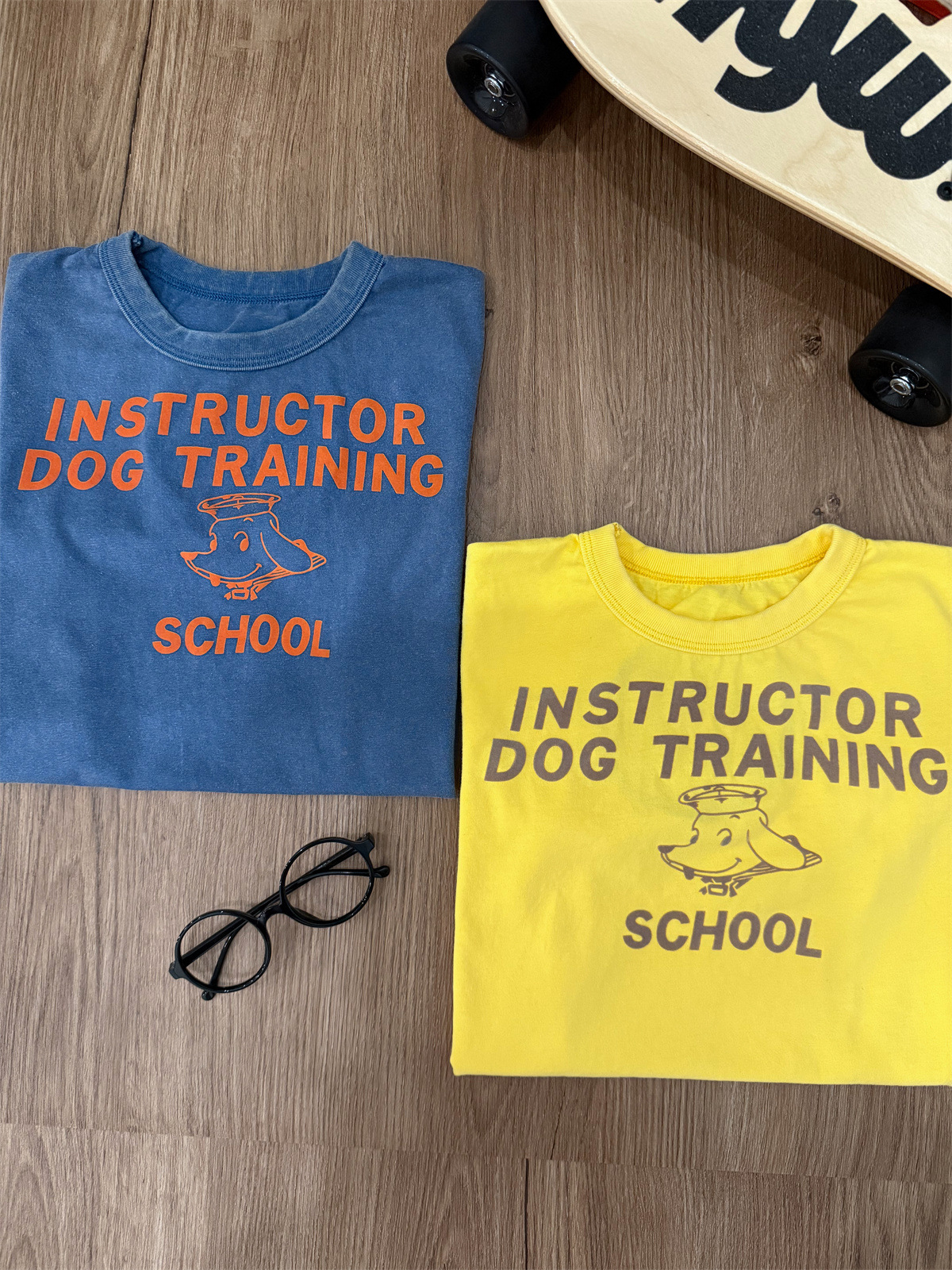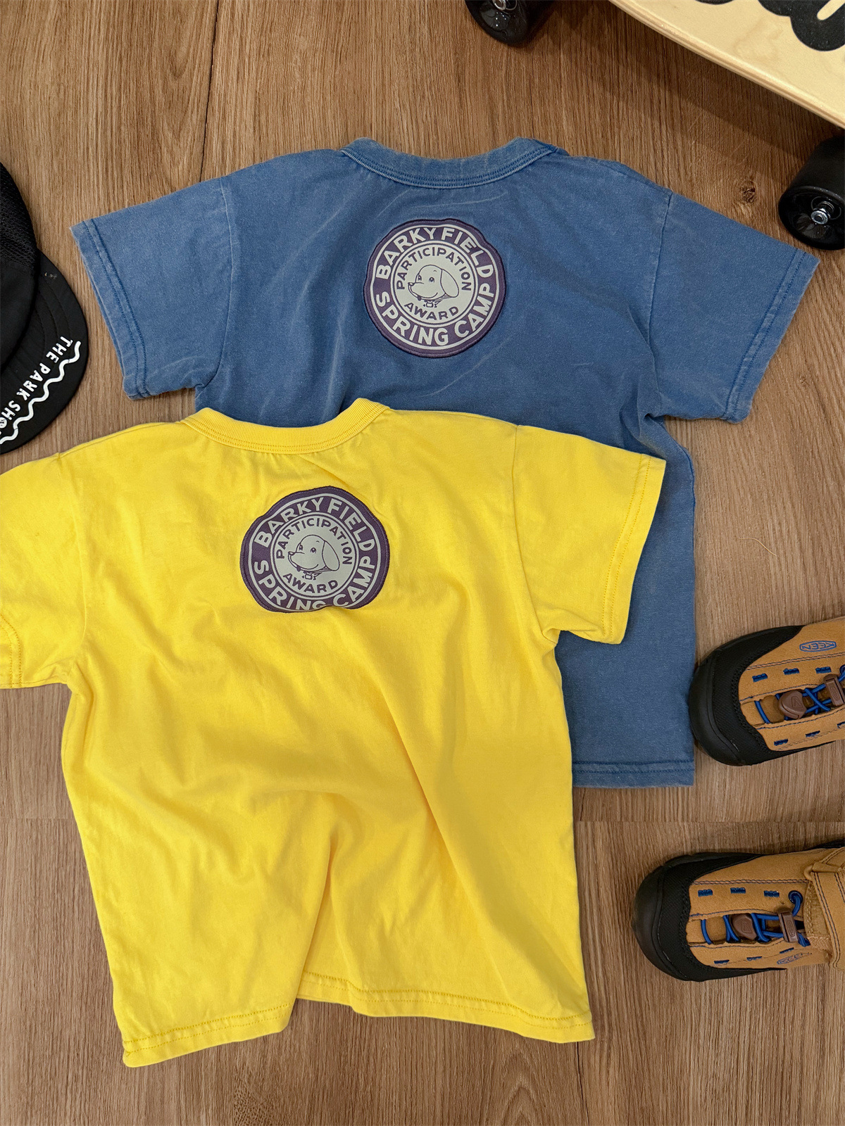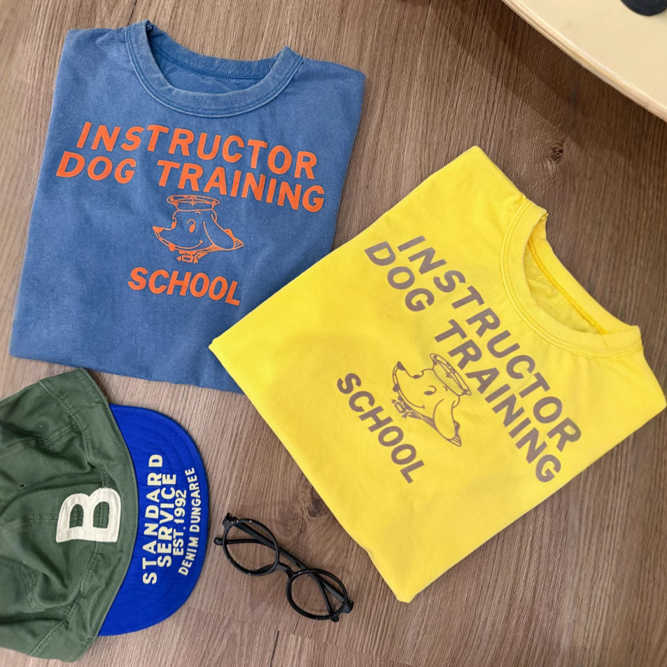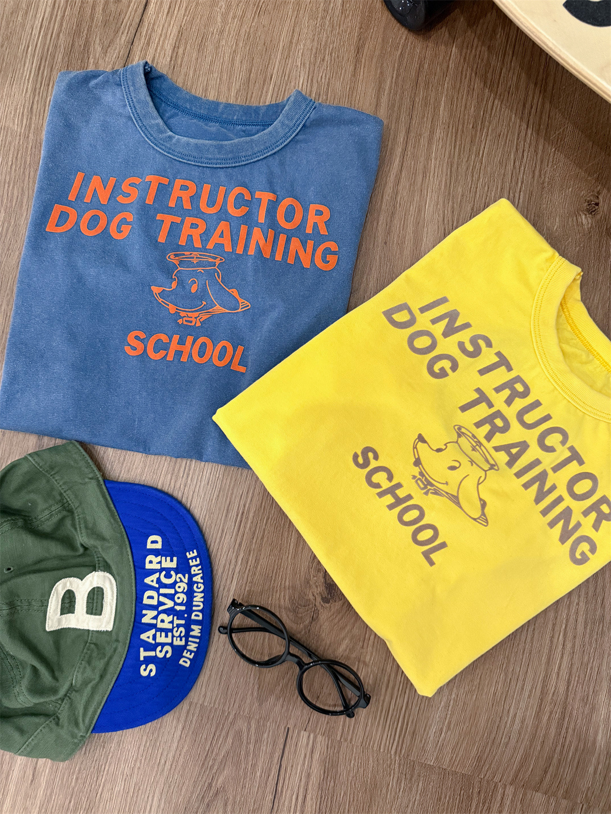 • 노란색 개 머리 티셔츠(튀긴 색상과 디스트레스드 플록 자수)