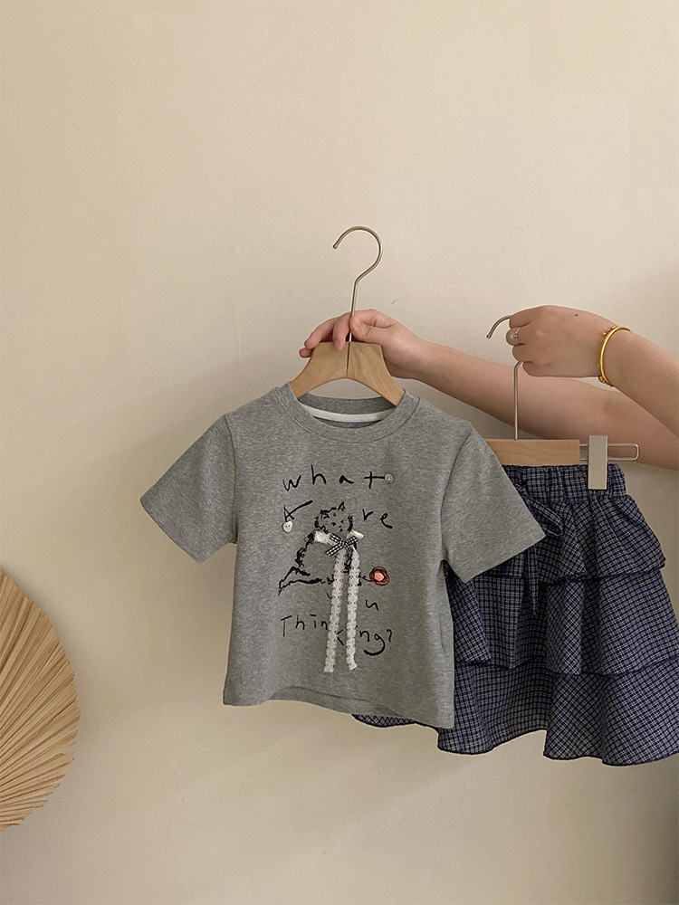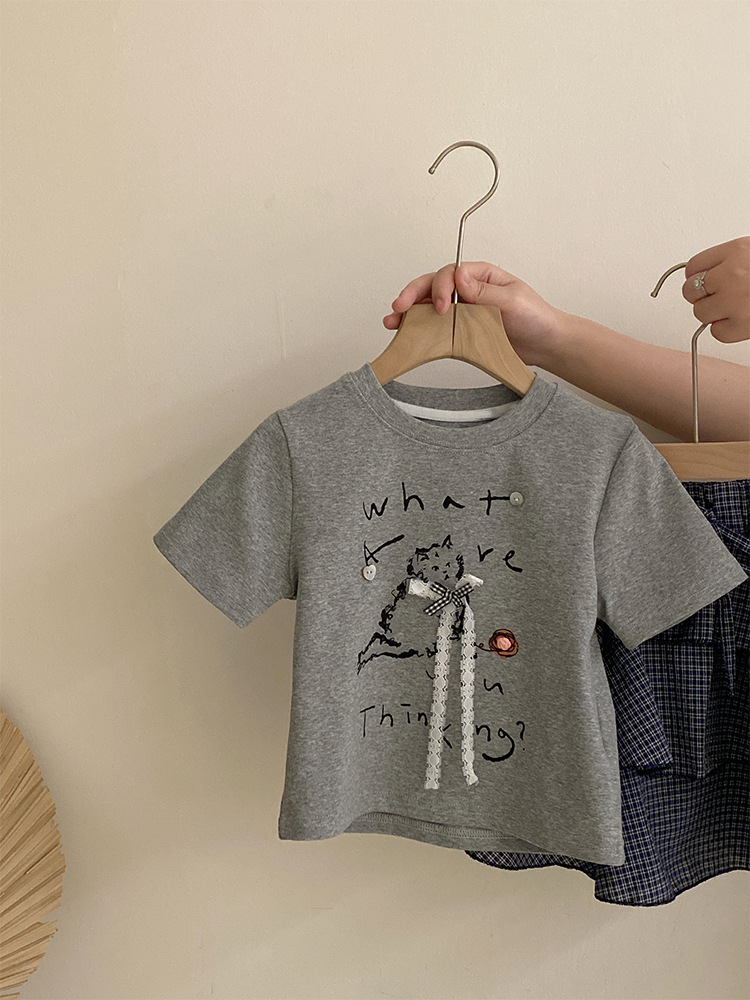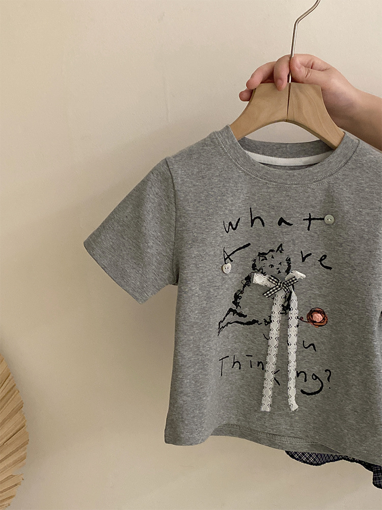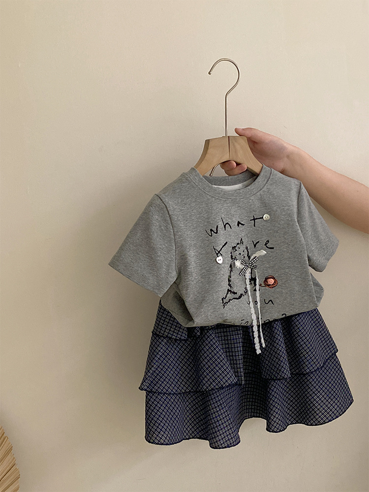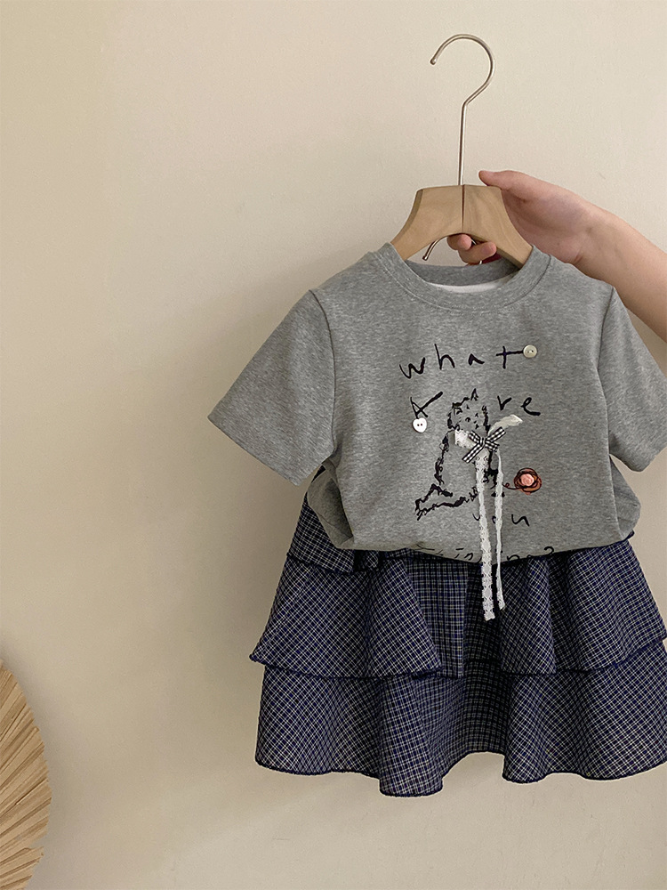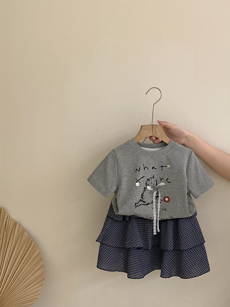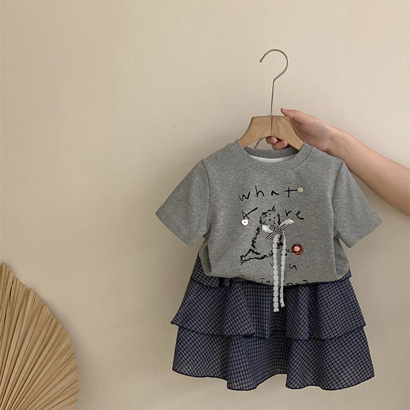 소녀 한국식 인쇄 고양이 활 반팔 2025 올매치 체크 케이크 원피스 귀여운 트렌디 투피스 세트