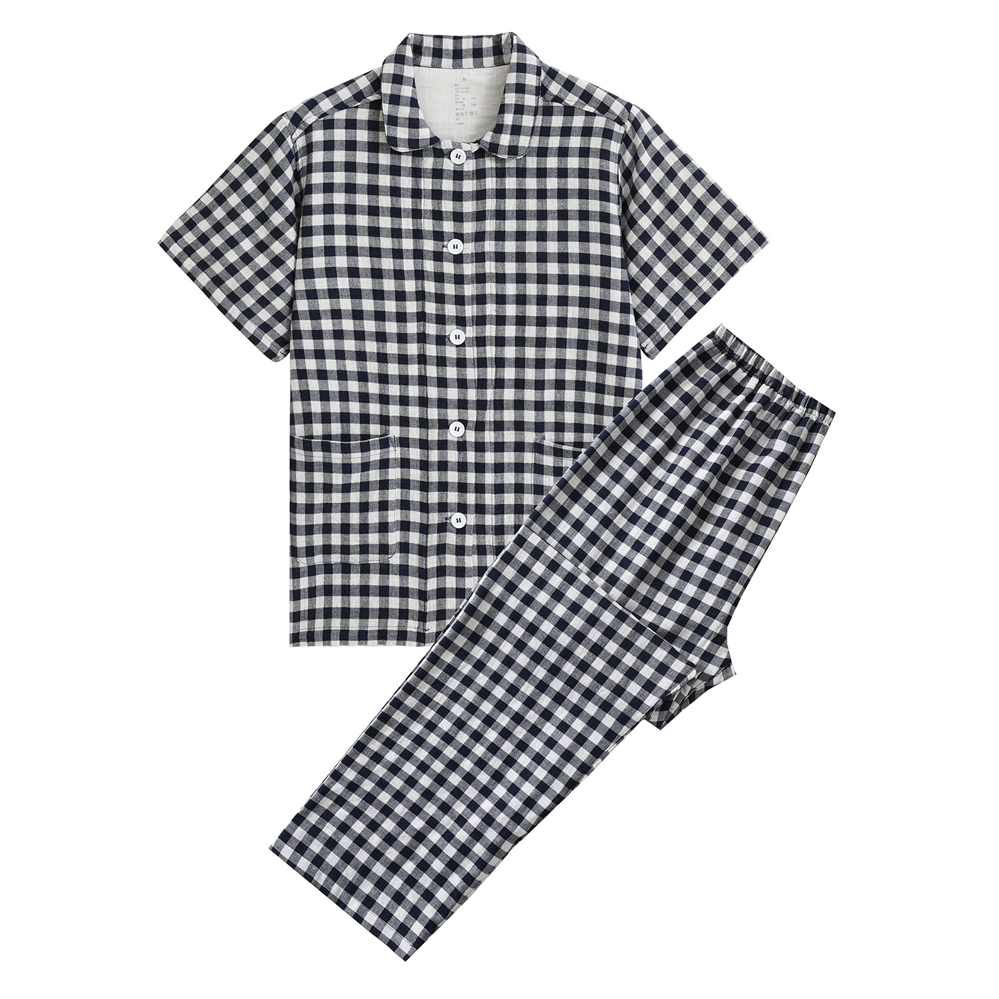 • (여) 더블 레이어 거즈 반팔 바지, 네이비 블루 체크 무늬