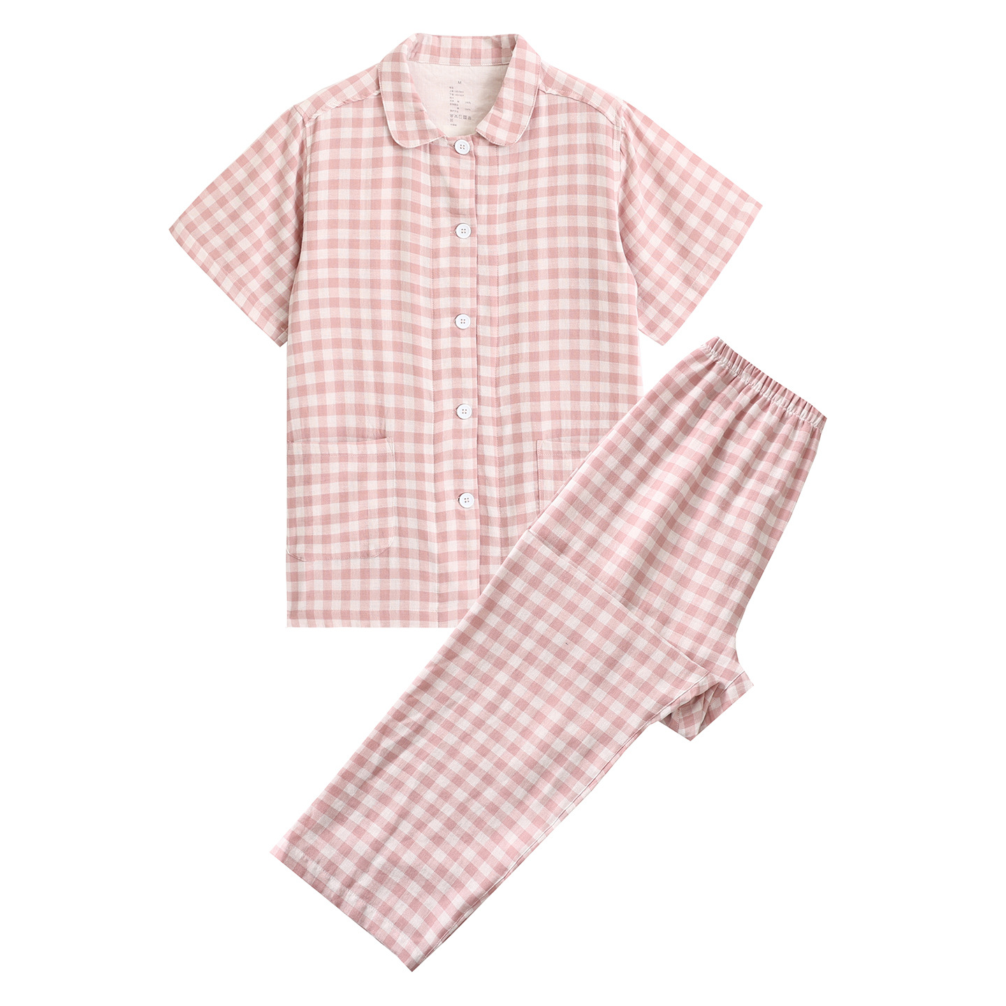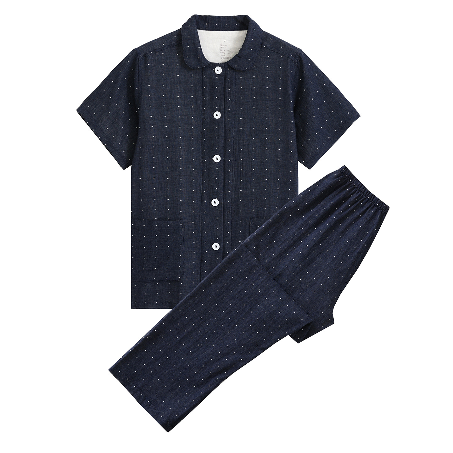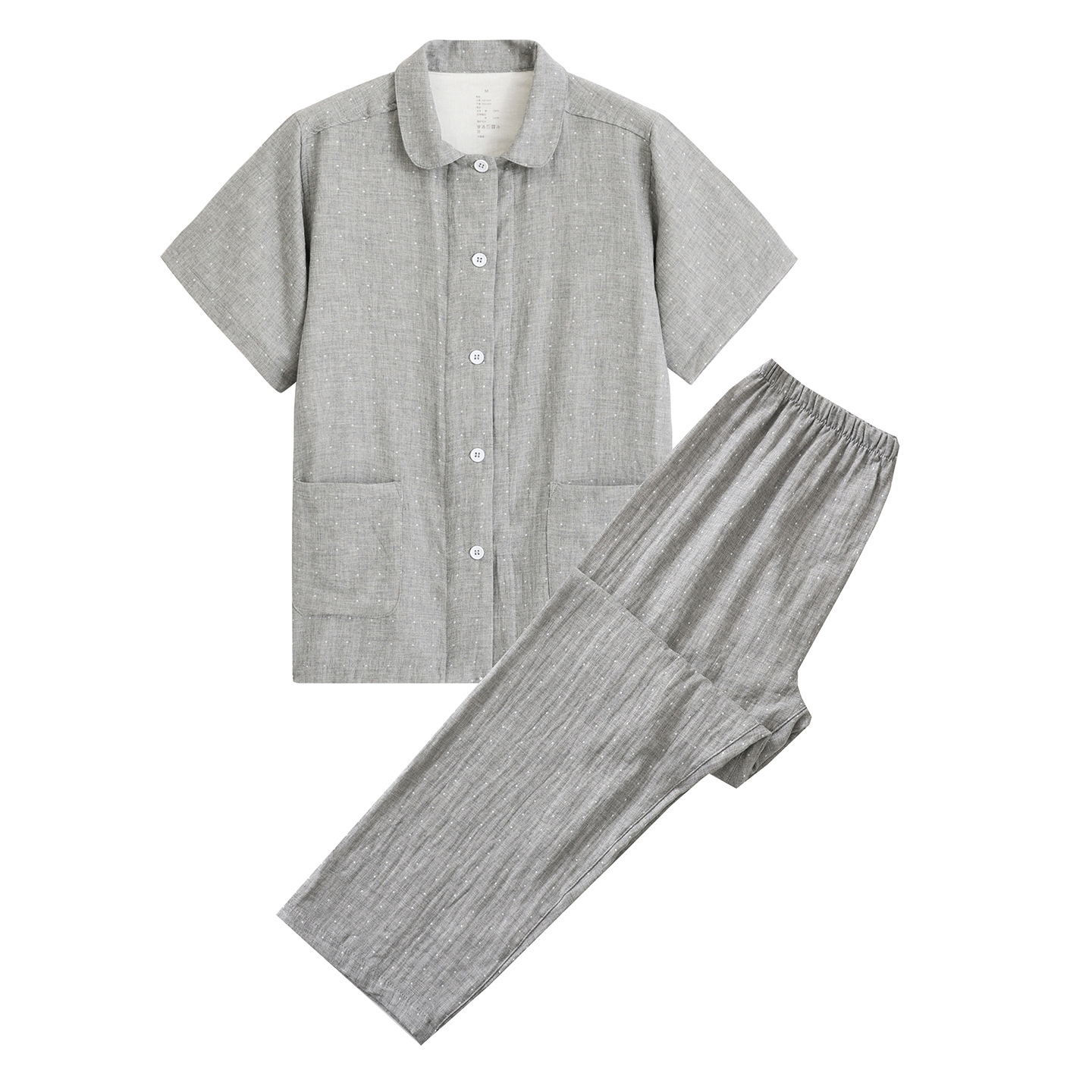 MUJI 스타일 좋은 제품 세척 코튼 더블 레이어 원사 파자마 여성용 퓨어 코튼 반팔 바지 퓨어 코튼 여름 커플 홈 의류스토어 가기