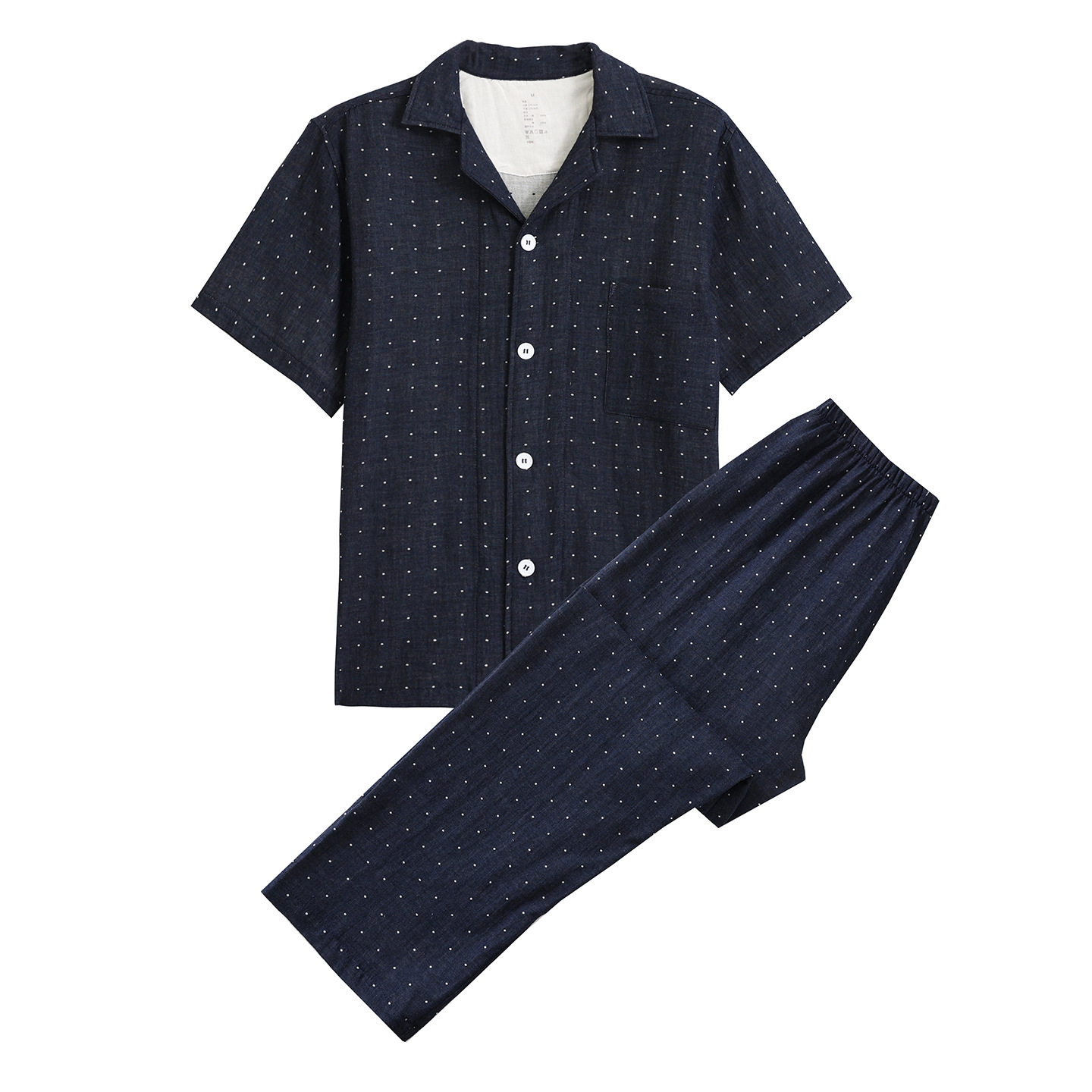 • (남) 남색 도트무늬 더블레이어 거즈 반팔바지