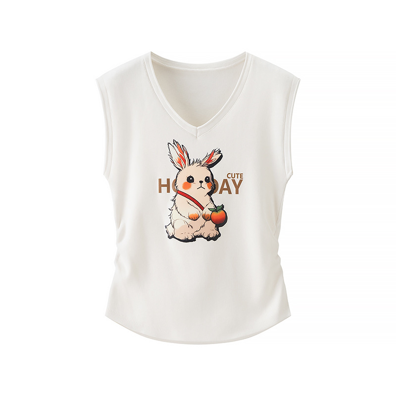 2025 여름 새로운 디자인 핀치 허리 V 넥 민소매 조끼, 세련된 토끼 프린트 여성 탑
