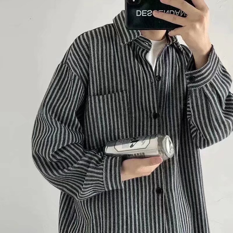 청소년 일본 스타일 모직 줄무늬 셔츠 남자 봄과 가을 홍콩 스타일 유행 하이 스트리트 퍼핀 핸즈섬 느슨한 긴 소매 셔츠 재킷스토어 가기